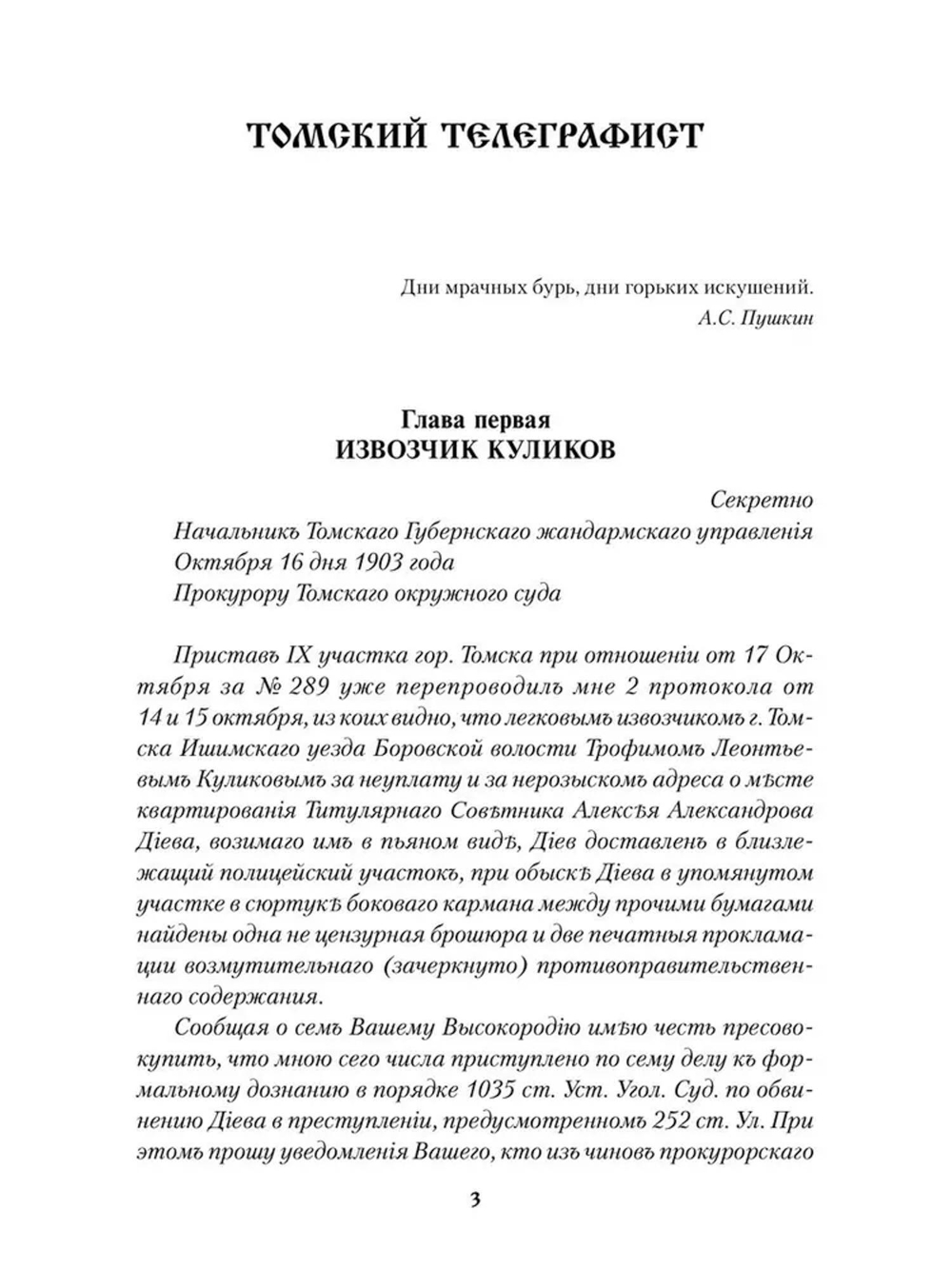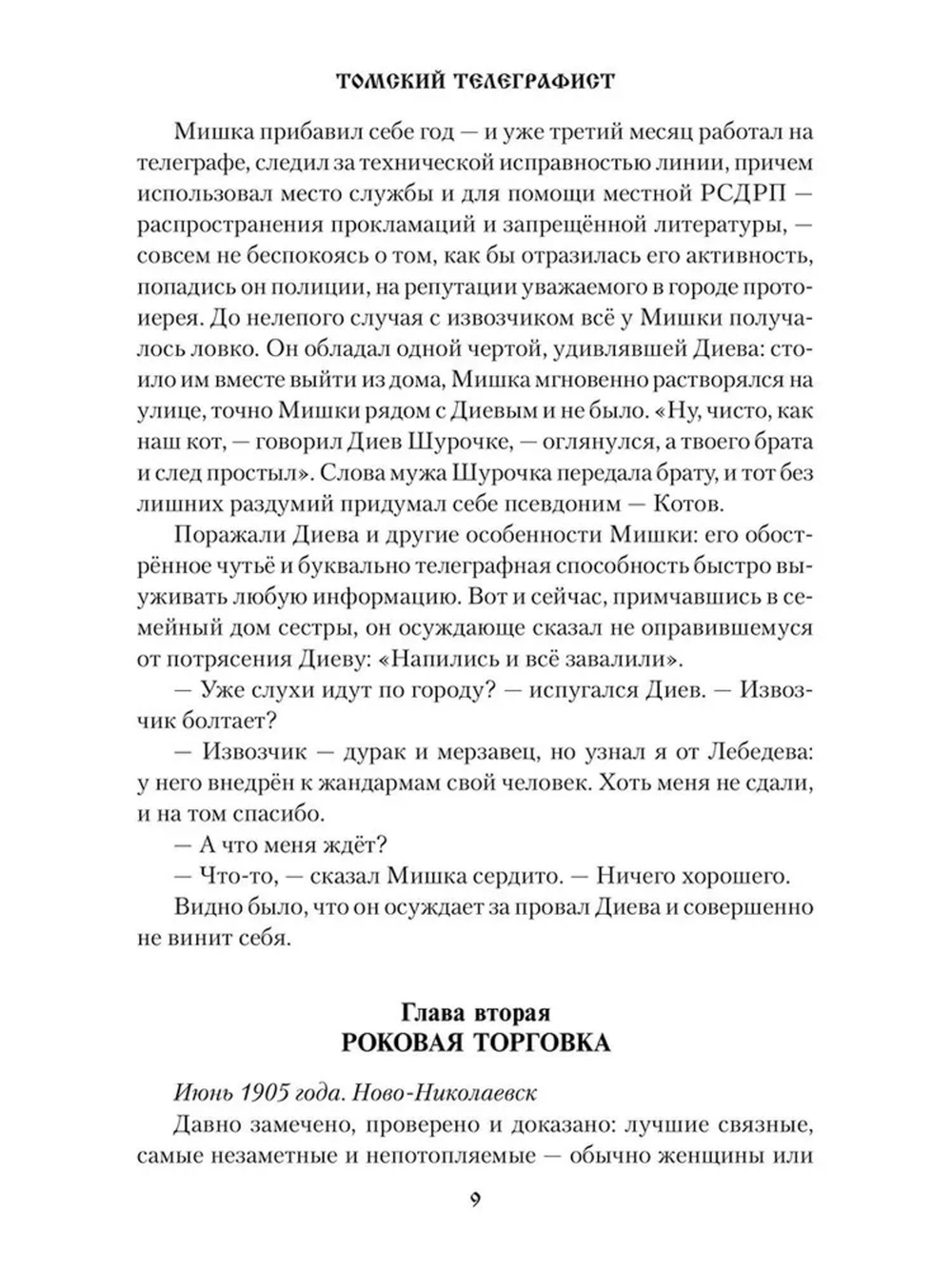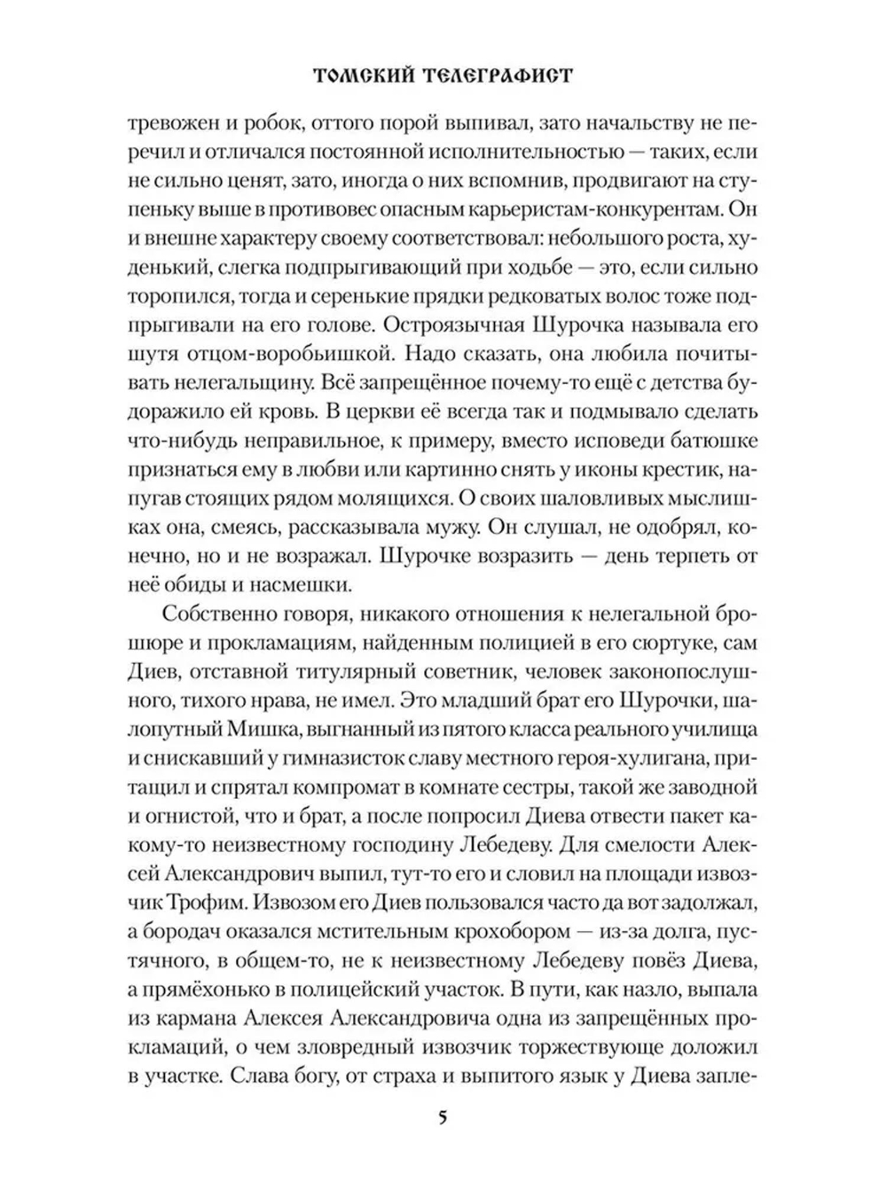 В романе «Томский телеграфист» переплетаются история и современность. В основе сюжета - воспоминания членов Обской группы Российской социал-демократической рабочей партии (РСДРП) и архивные документы судебного дознания 1903-1905 годов. Кем были новониколаевские и томские подпольщики - героями, преступниками или жертвами? Роман не претендует на буквальное историческое соответствие: каждый художественный образ - собирательный. Тема родовой памяти, затронутая в романе, становится главной идеей повести «Обдорский след»: неизжитые негативные чувства предков способны передаваться из поколения в поколение, представляя в будущем опасность не только для потомков, но и для общества. В повести «Юлия и Щетинкин» скромный православный священнослужитель, потомок священника-миссионера, во времена красного террора не оставляет своего прихода, доказывая, что и в «маленьком человеке» может таиться необоримая сила духа и способность совершить настоящий поступок. Завершают книгу избранные рассказы.| Издательство | Вече |