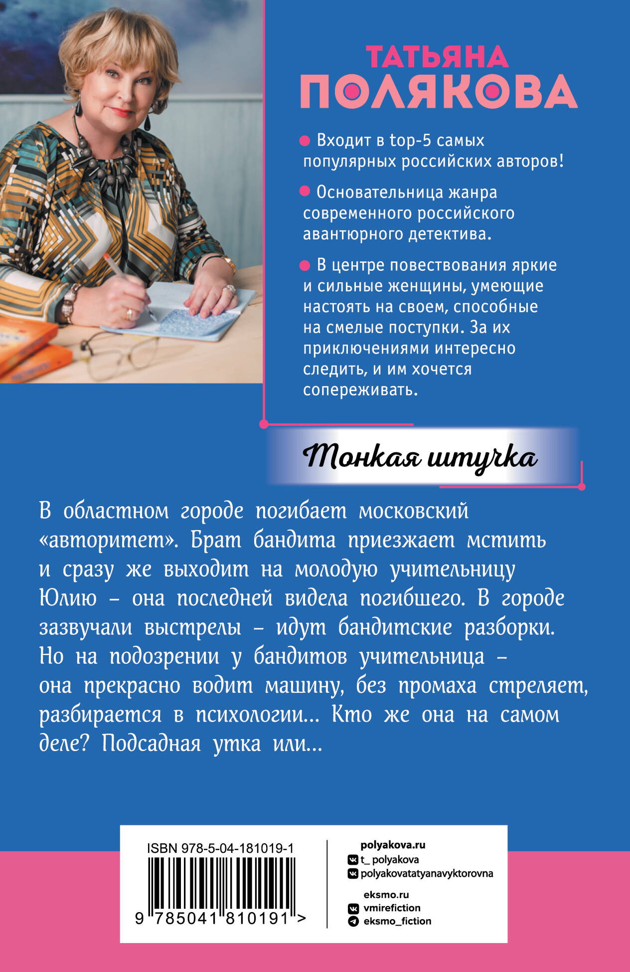 В областном городе погибает московский «авторитет». Брат бандита приезжает мстить и сразу же выходит на молодую учительницу Юлию - она последней видела погибшего. В городе зазвучали выстрелы - идут бандитские разборки. Но на подозрении у бандитов учительница - она прекрасно водит машину, без промаха стреляет, разбирается в психологии… Кто же она на самом деле? Подсадная утка или… Татьяна Полякова - один из самых популярных российских писателей в жанре детектива. За время писательской карьеры из-под ее пера вышло более 85 книг общим тиражом более 36 миллионов экземпляров. По свидетельствам читателей, романы Татьяны Поляковой - это «захватывающий сюжет и непредсказуемая развязка, обаятельные герои и невероятные приключения, легкий стиль и яркие диалоги».| Издательство | ООО "Издательство "Эксмо" |