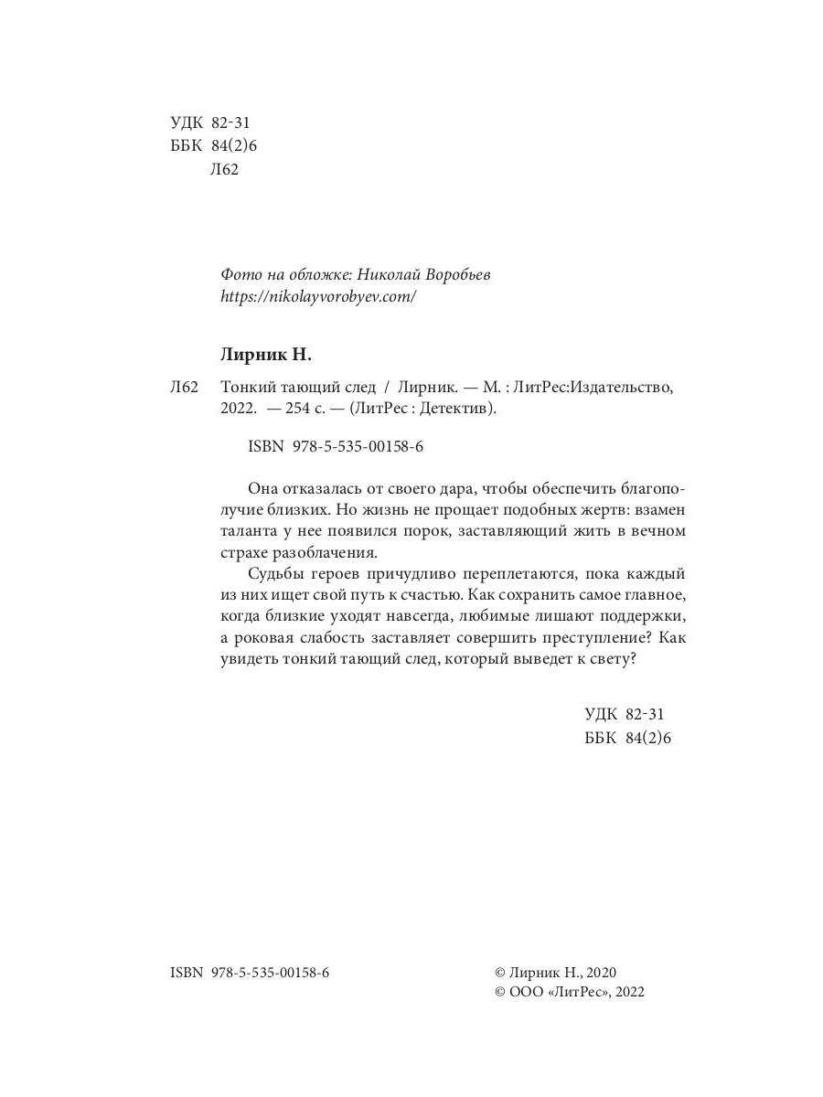 Она отказалась от своего дара, чтобы обеспечить благополучие близких. Но жизнь не прощает подобных жертв: взамен таланта у нее появился порок, заставляющий жить в вечном страхе разоблачения. Судьбы героев причудливо переплетаются, пока каждый из них ищет свой путь к счастью. Как сохранить самое главное, когда близкие уходят навсегда, любимые лишают поддержки, а роковая слабость заставляет совершить преступление? Как увидеть тонкий тающий след, который выведет к свету?