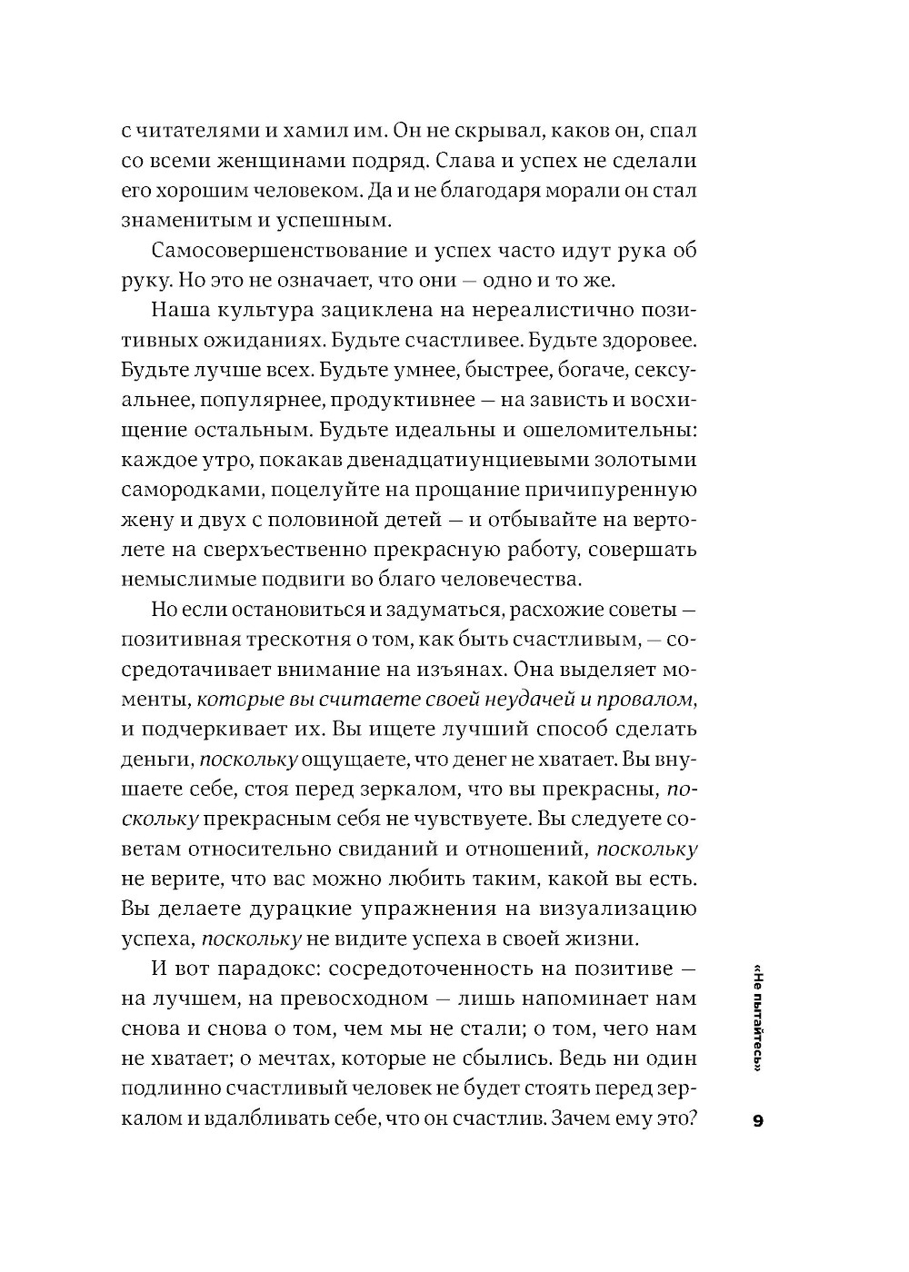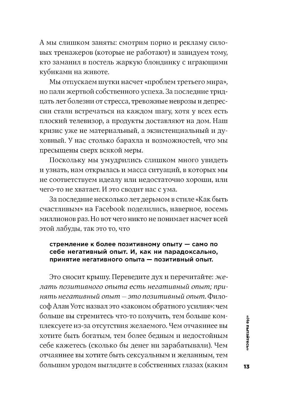 Оглянитесь вокруг себя. Пролистайте ленту соцсетей. Прислушайтесь. И вы услышите, как окружающий мир настойчиво твердит: «Будь лучше!», «Добейся успеха любой ценой!», «Будь первым!» Несмотря на то, что человеческая цивилизация еще никогда в истории не жила в таком достатке, всё больше людей испытывают необъяснимое ощущение фрустрации. Будто бы чего-то не хватает, будто бы у всех твоих френдов в соцсетях жизнь лучше и приятнее.| Издательство | Альпина Паблишер |