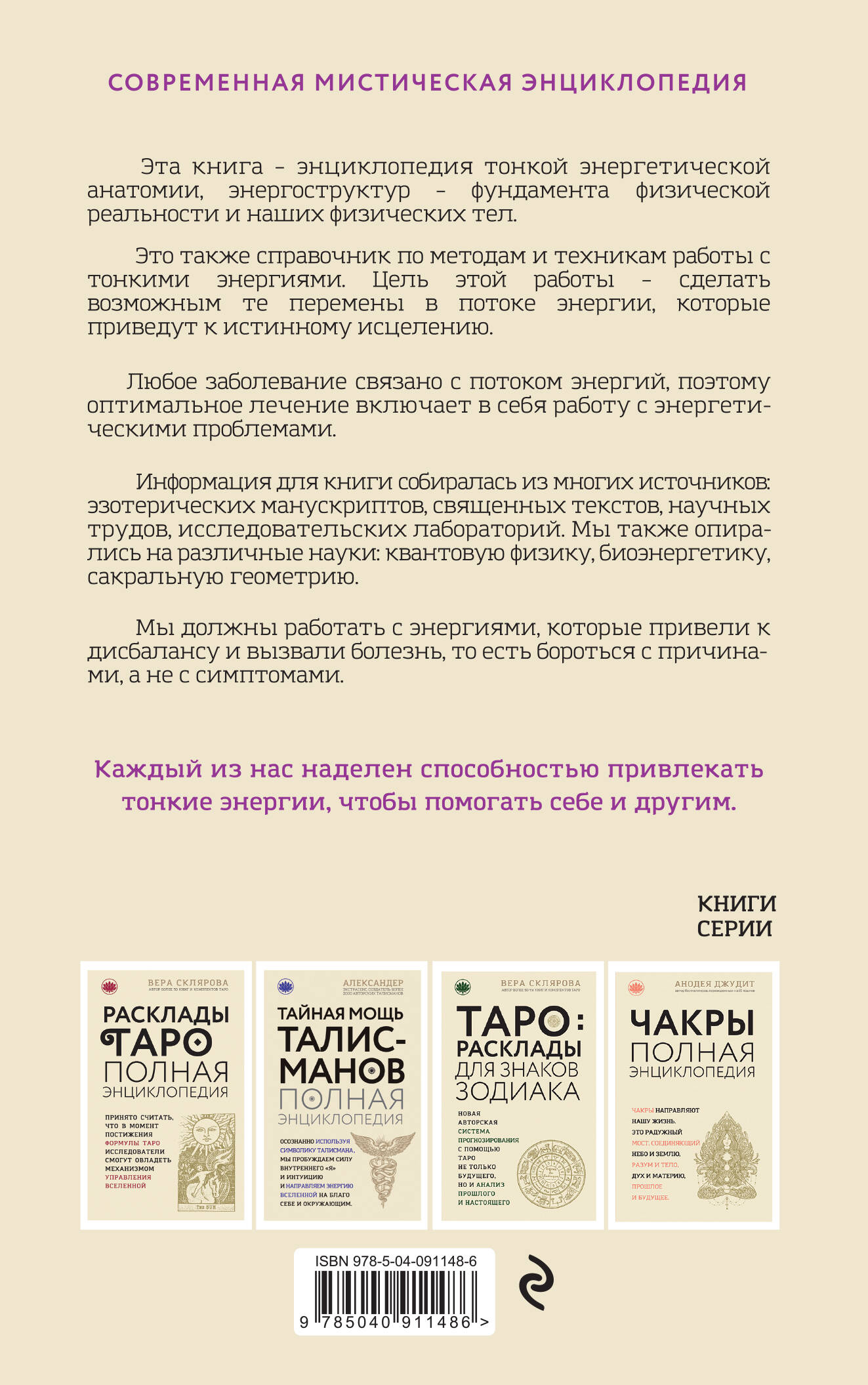 Данная книга предназначена для тех, кто хочет быть здоровым в любом возрасте. Эта книга - энциклопедия тонкой энергетической анатоми, энергоструктур. Важно понимать, что любая реальность создана из органичной и изменяемой системы тонких энергий. Цель этой книги - показать, что мы должны работать с энергиями, которые привели к дисбалансу и вызвали болезнь, т.е. разобраться с причинами, а не симптомами. Это также справочник по методам и техникам работы с тонкими энергиями. В этой книге вы найдете информацию о многочисленных методах лечения, основанных на тонких системах. Книга составлена таким образом, чтобы ей было удобно пользоваться. Необязательно читать весь материал целиком или по порядку. Вы можете изучать интересующий вас раздел или любую его часть. Для того чтобы вы смогли выбрать одну или две конкретные темы, определенные универсальные понятия кратко описыватся в каждом разделе. Базовые знания о принципах движения жизненной энергии по организму, простые и доступные способы восстановления нарушенного энергообмена - есть первое условие нормальной здоровой жизни. Никакие таблетки, никакие прививки и платные приемы не понадобятся человеку, который выполнил первый и самый важный завет древних: «познай самого себя».| Издательство | ООО "Издательство "Эксмо" |