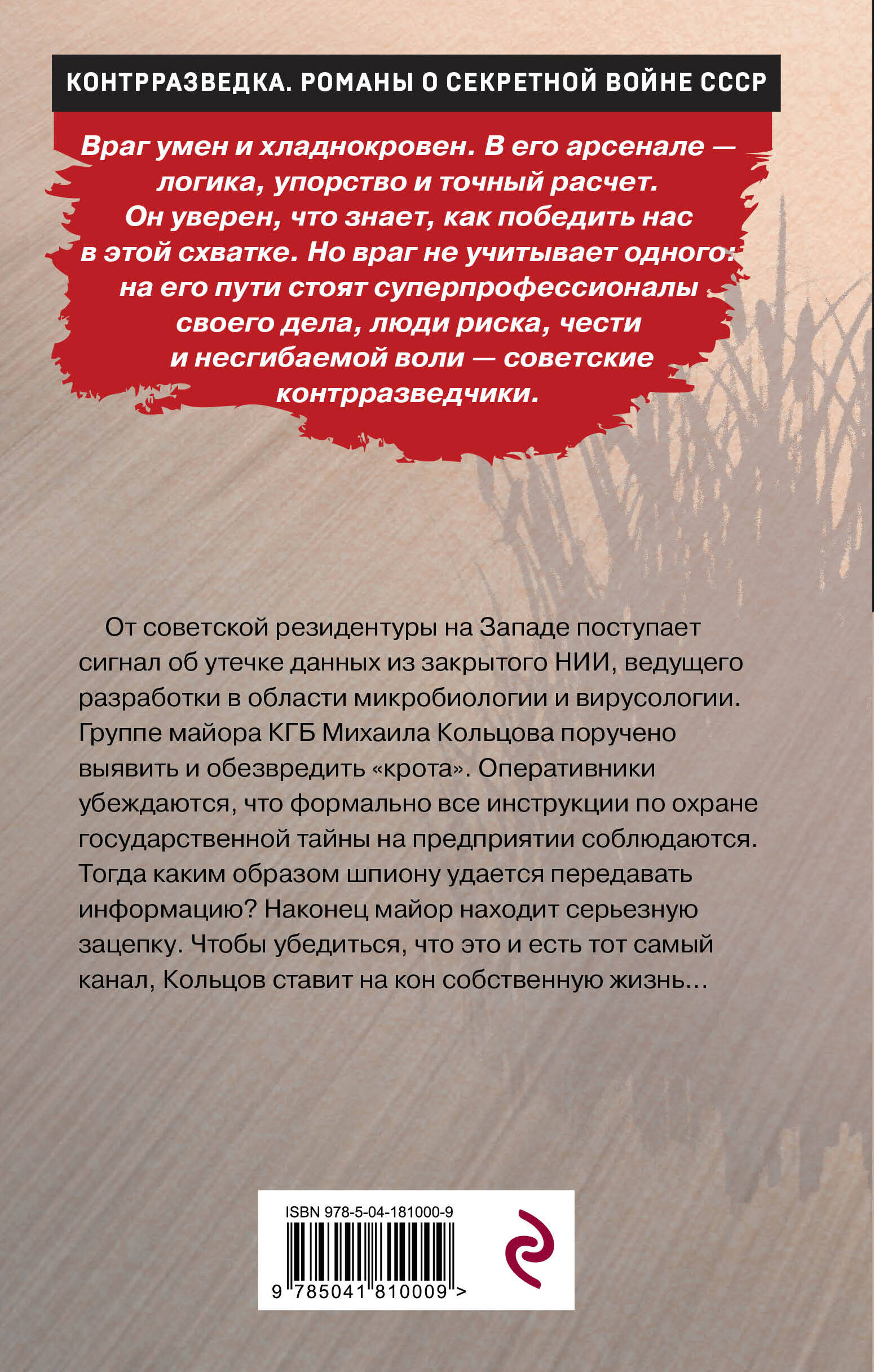 Враг умен и хладнокровен. В его арсенале - логика, упорство и точный расчет. Он уверен, что знает, как победить нас в этой схватке. Но враг не учитывает одного: на его пути стоят суперпрофессионалы своего дела, люди риска, чести и несгибаемой воли - советские контрразведчики. От советской резидентуры на Западе поступает сигнал об утечке данных из закрытого НИИ, ведущего разработки в области микробиологии и вирусологии. Группе майора КГБ Михаила Кольцова поручено выявить и обезвредить «крота». Оперативники убеждаются, что формально все инструкции по охране государственной тайны на предприятии соблюдаются. Тогда каким образом шпиону удается передавать информацию? Наконец майор находит серьезную зацепку. Чтобы убедиться, что это и есть тот самый канал, Кольцов ставит на кон собственную жизнь…| Издательство | ООО "Издательство "Эксмо" |