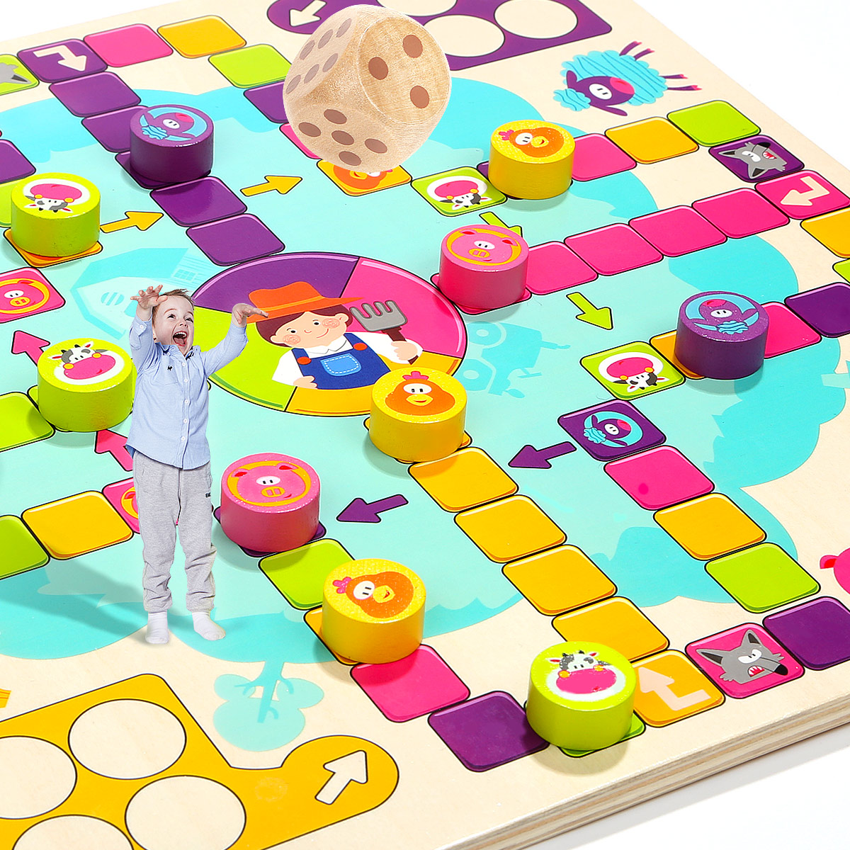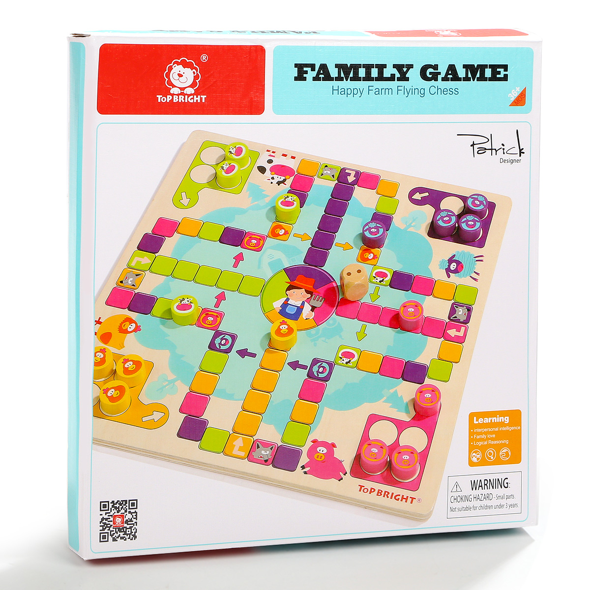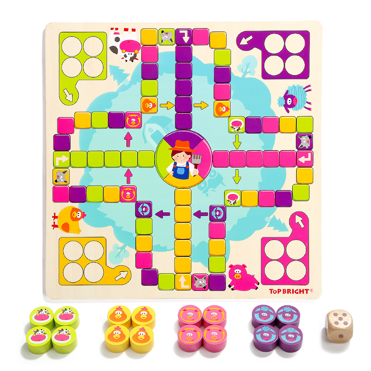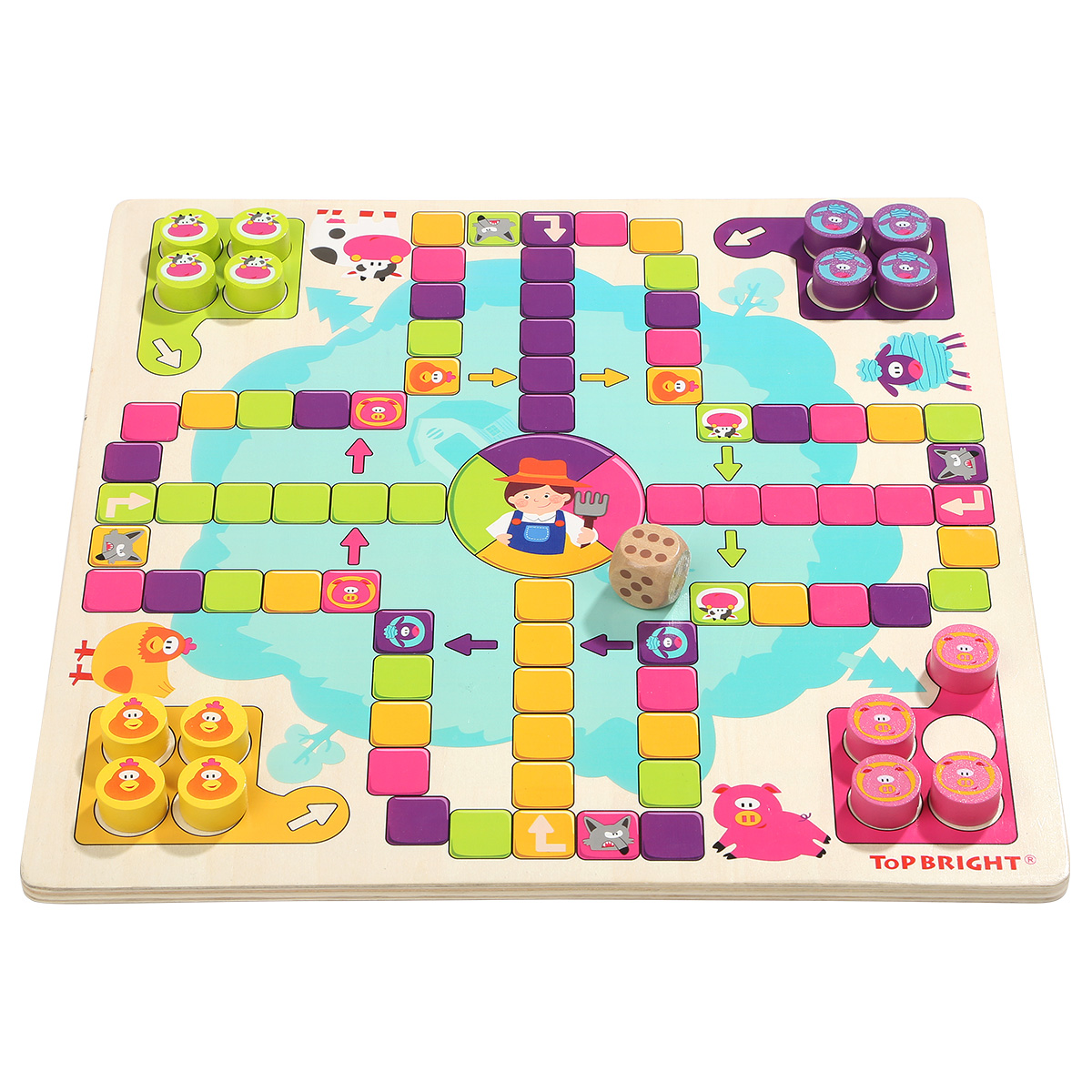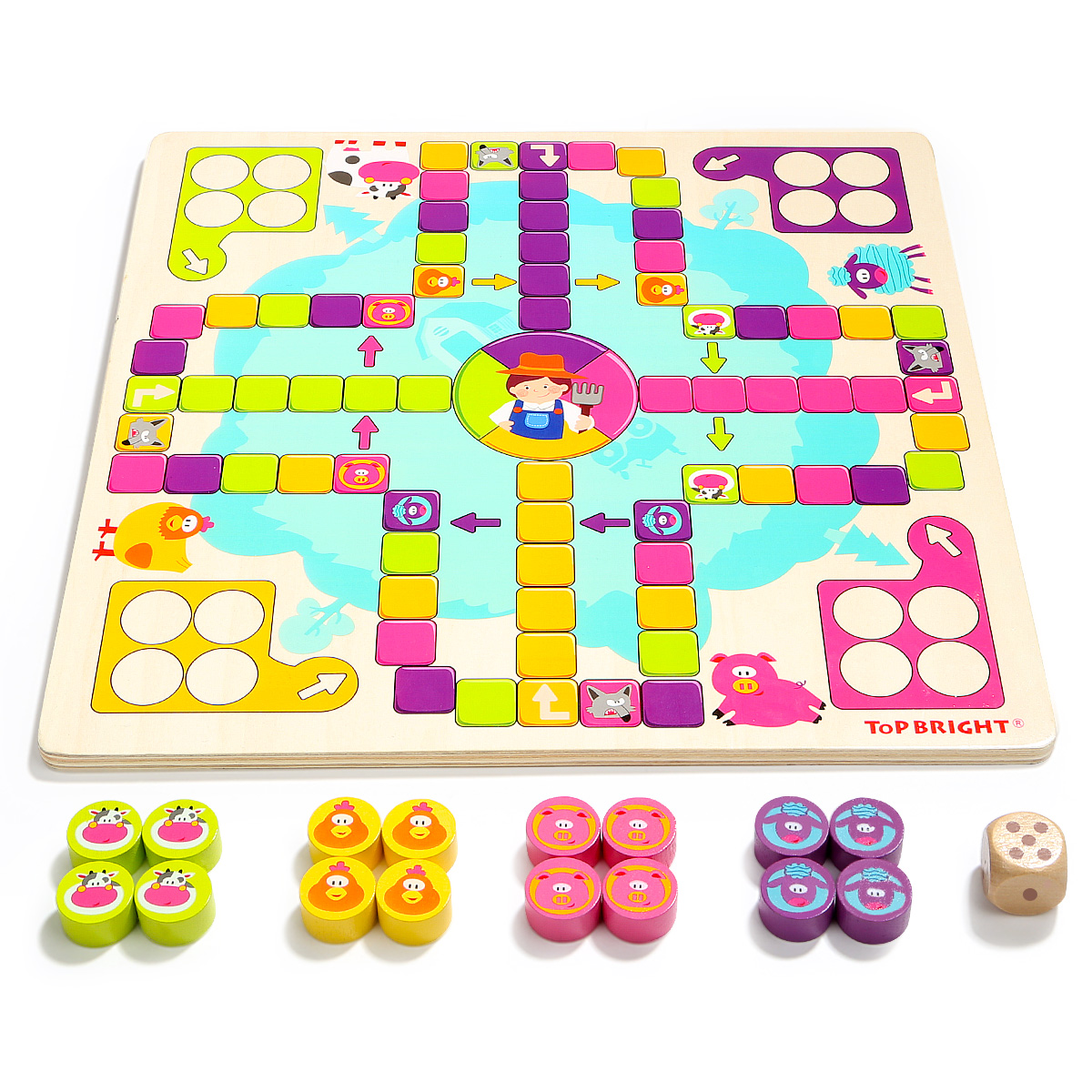 Игрушки TOP BRIGHT уже более 30 лет преследуют простую миссию: помогать детям развивать свои разнообразные таланты. Вот почему наши развивающие игрушки ориентированы на естественное стремление детей к исследованиям. Мы с самого раннего возраста являемся частью жизни детей и помогаем им открывать для себя мир вместе с родителями. Мы наблюдаем, как они растут, учатся и исследуют свое окружение во время игры. Настольная деревянная игра "Счастливая ферма" - это интересная новинка, привлекает ярким дизайном и интересным наполнением. Тематическое игровое поле в виде территории фермы с соответствующими персонажами. Разделено на 4 части с отрядами животных - коровок, овец, поросят и кур. Выбираете персонажа и ставите все свои 4 фишки в загон. Каждый игрок бросает кубик по очереди, и может войти в игру, только если выпадет цифра 6. Каждый раз когда выпадает 6, игрок продолжает свою очередь и бросает кубик еще раз. Также, может выбрать продвинуть свою фишку, или поставить новую фишку в зону выхода на поле. После выхода на поле, продвигаемся в соответствии с цифр на кубике по часовой стрелке. Если попадаем на ячейку своего цвета, то прыгаем на тот же цвет на 4 клетки вперед. Когда попадаем на волка своего цвета возвращаемся на ферму. Также перепрыгиваем по стрелочки, когда попадаем в свой цвет. На финиш можете попасть только при выпаде цифры кубика, равным числу последних шагов. В противном случае отступаете назад от финиша на столько шагов, сколько превысил выброс кубика. Выигрыш засчитывается после того, как все четыре фишки достигают точки финиша. Когда все 4 ваши фишки будут на финише, вы победили !!! Хорошая семейная игра для взрослых и детей может способствовать развитию отношений родителей и ребенка и увеличить дружбу. Набор изготовлен из натурального дерева и окрашен нетоксичными красками, благодаря чему игры с ним будут безопасными даже для самых маленьких. Размер коробки: 31 х 31 х 4 см. Рекомендуемый возраст от 3 лет и старше.