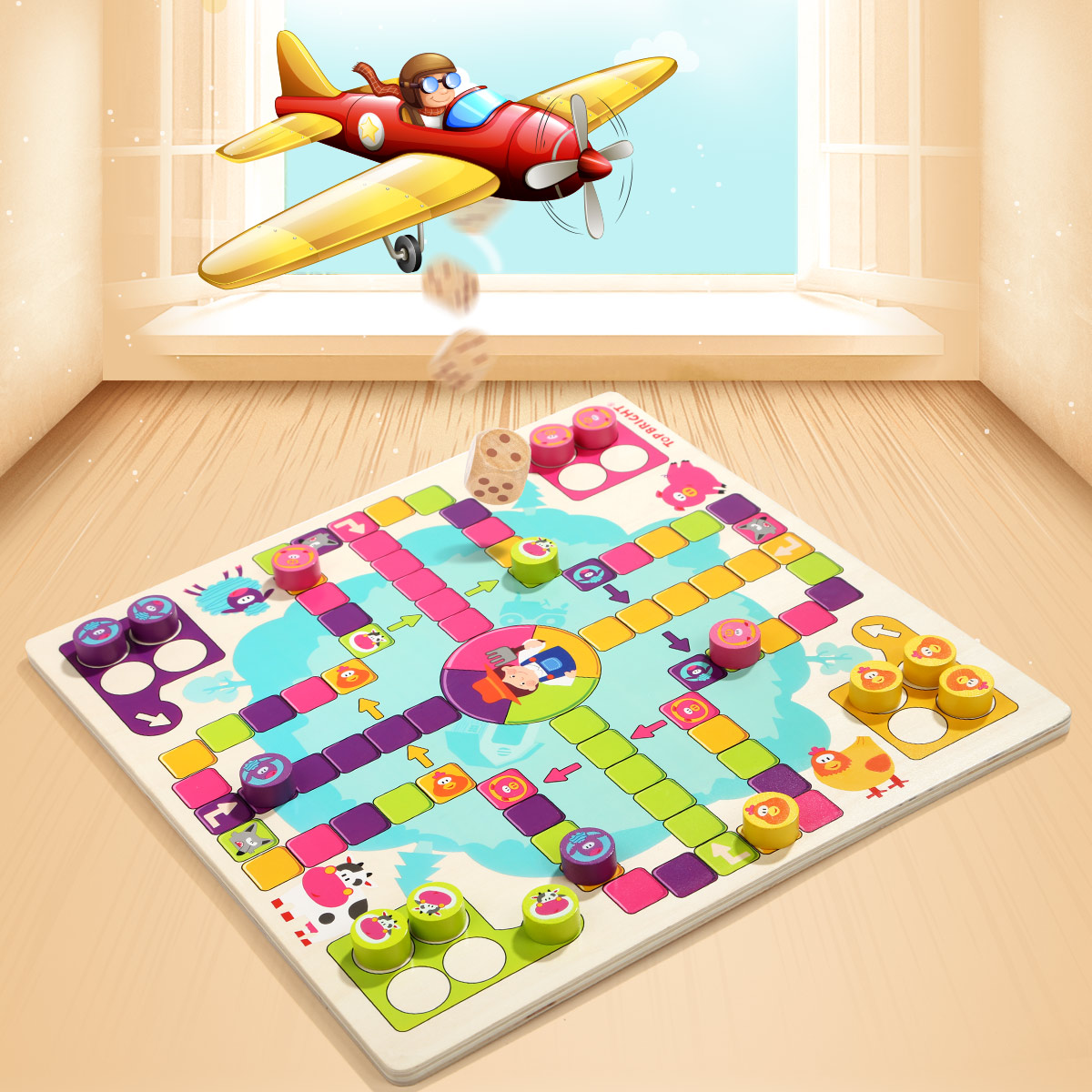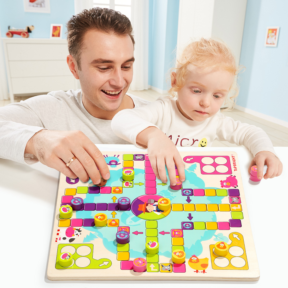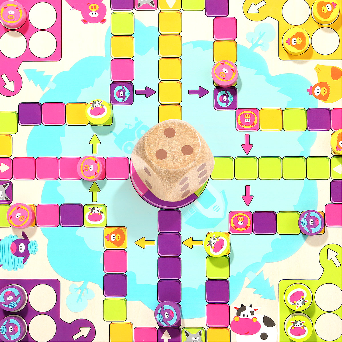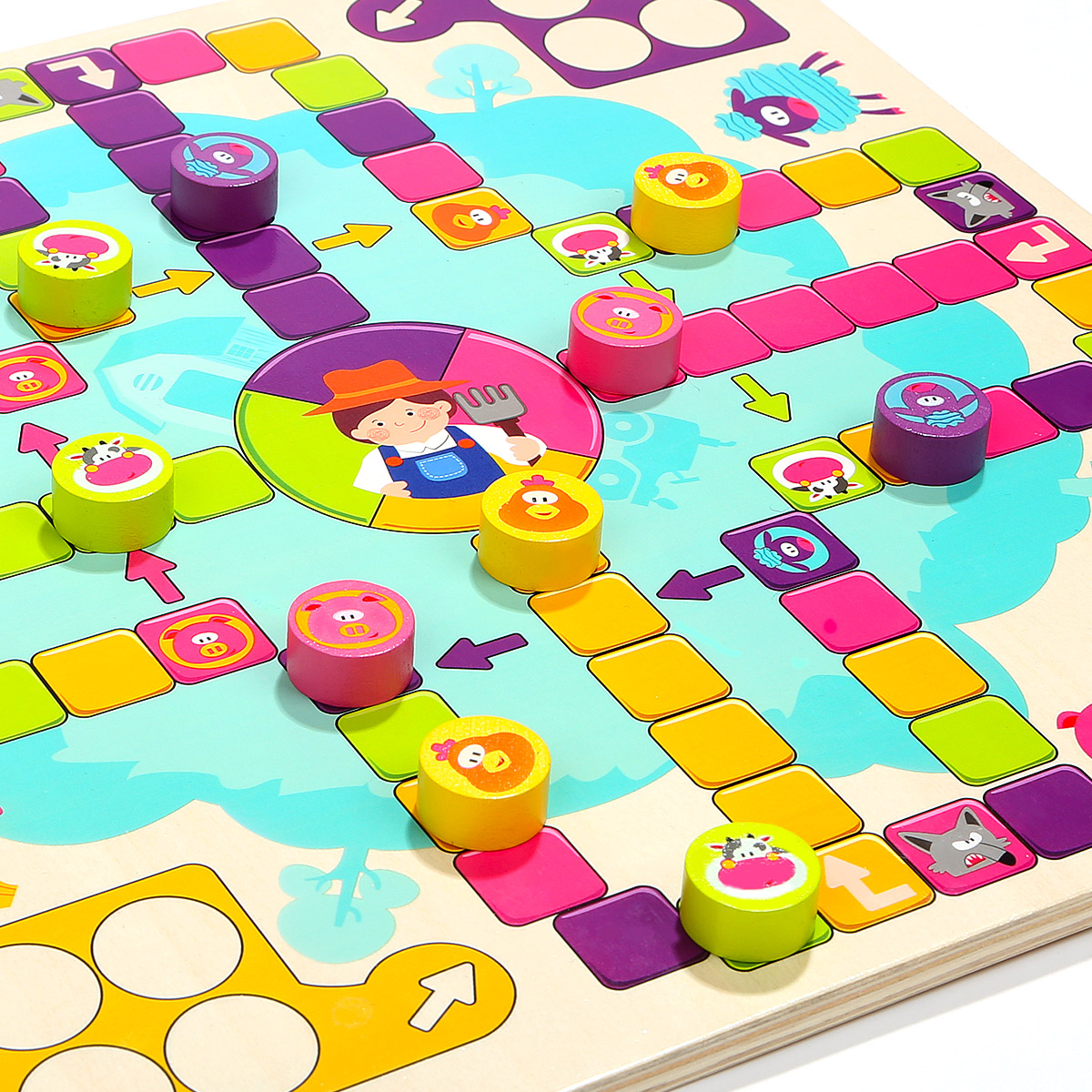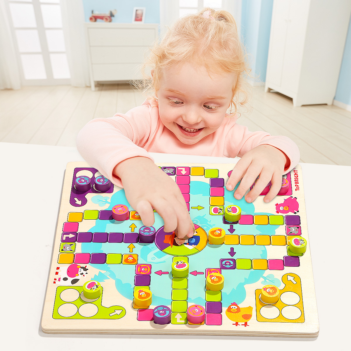 Игрушки TOP BRIGHT уже более 30 лет преследуют простую миссию: помогать детям развивать свои разнообразные таланты. Вот почему наши развивающие игрушки ориентированы на естественное стремление детей к исследованиям. Мы с самого раннего возраста являемся частью жизни детей и помогаем им открывать для себя мир вместе с родителями. Мы наблюдаем, как они растут, учатся и исследуют свое окружение во время игры. Настольная деревянная игра "Счастливая ферма" - это интересная новинка, привлекает ярким дизайном и интересным наполнением. Тематическое игровое поле в виде территории фермы с соответствующими персонажами. Разделено на 4 части с отрядами животных - коровок, овец, поросят и кур. Выбираете персонажа и ставите все свои 4 фишки в загон. Каждый игрок бросает кубик по очереди, и может войти в игру, только если выпадет цифра 6. Каждый раз когда выпадает 6, игрок продолжает свою очередь и бросает кубик еще раз. Также, может выбрать продвинуть свою фишку, или поставить новую фишку в зону выхода на поле. После выхода на поле, продвигаемся в соответствии с цифр на кубике по часовой стрелке. Если попадаем на ячейку своего цвета, то прыгаем на тот же цвет на 4 клетки вперед. Когда попадаем на волка своего цвета возвращаемся на ферму. Также перепрыгиваем по стрелочки, когда попадаем в свой цвет. На финиш можете попасть только при выпаде цифры кубика, равным числу последних шагов. В противном случае отступаете назад от финиша на столько шагов, сколько превысил выброс кубика. Выигрыш засчитывается после того, как все четыре фишки достигают точки финиша. Когда все 4 ваши фишки будут на финише, вы победили !!! Хорошая семейная игра для взрослых и детей может способствовать развитию отношений родителей и ребенка и увеличить дружбу. Набор изготовлен из натурального дерева и окрашен нетоксичными красками, благодаря чему игры с ним будут безопасными даже для самых маленьких. Размер коробки: 31 х 31 х 4 см. Рекомендуемый возраст от 3 лет и старше.