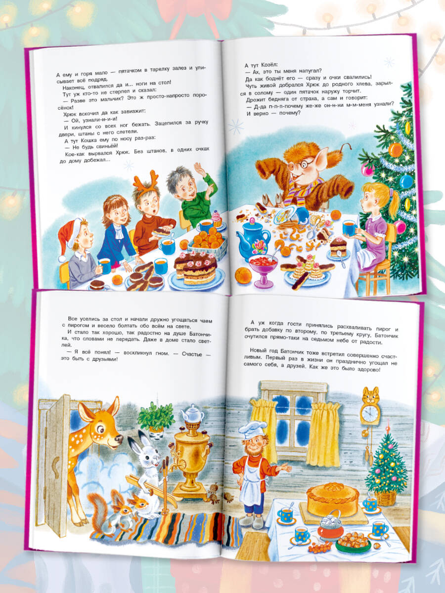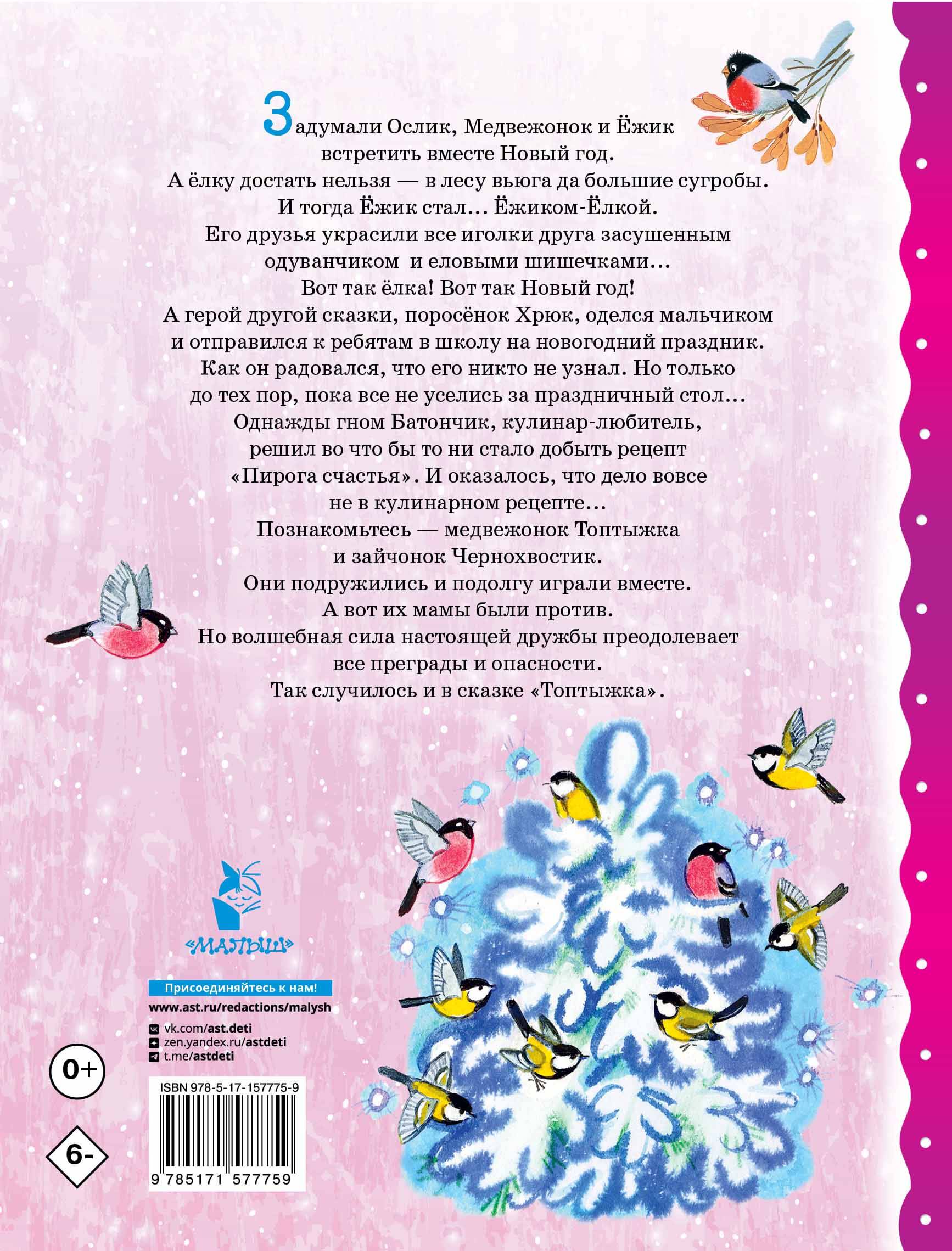 Задумали Ослик, Медвежонок и Ёжик встретить вместе Новый год. А ёлку достать нельзя - в лесу вьюга да большие сугробы. И тогда Ёжик стал... Ёжиком-Ёлкой. Его друзья украсили все иголки друга засушенным одуванчиком и еловыми шишечками... Вот так ёлка! Вот так Новый год! А герой другой сказки, поросёнок Хрюк, оделся мальчиком и отправился к ребятам в школу на новогодний праздник. Как он радовался, что его никто не узнал. Но только до тех пор, пока все не уселись за праздничный стол... Однажды гном Батончик, кулинар-любитель, решил во что бы то ни стало добыть рецепт «Пирога счастья». И оказалось, что дело вовсе не в кулинарном рецепте... Познакомьтесь - медвежонок Топтыжка и зайчонок Чернохвостик. Они подружились и подолгу играли вместе. А вот их мамы были против.Но волшебная сила настоящей дружбы преодолевает все преграды и опасности.Так случилось и в сказке «Топтыжка».| Издательство | ИЗДАТЕЛЬСТВО "АСТ" |
