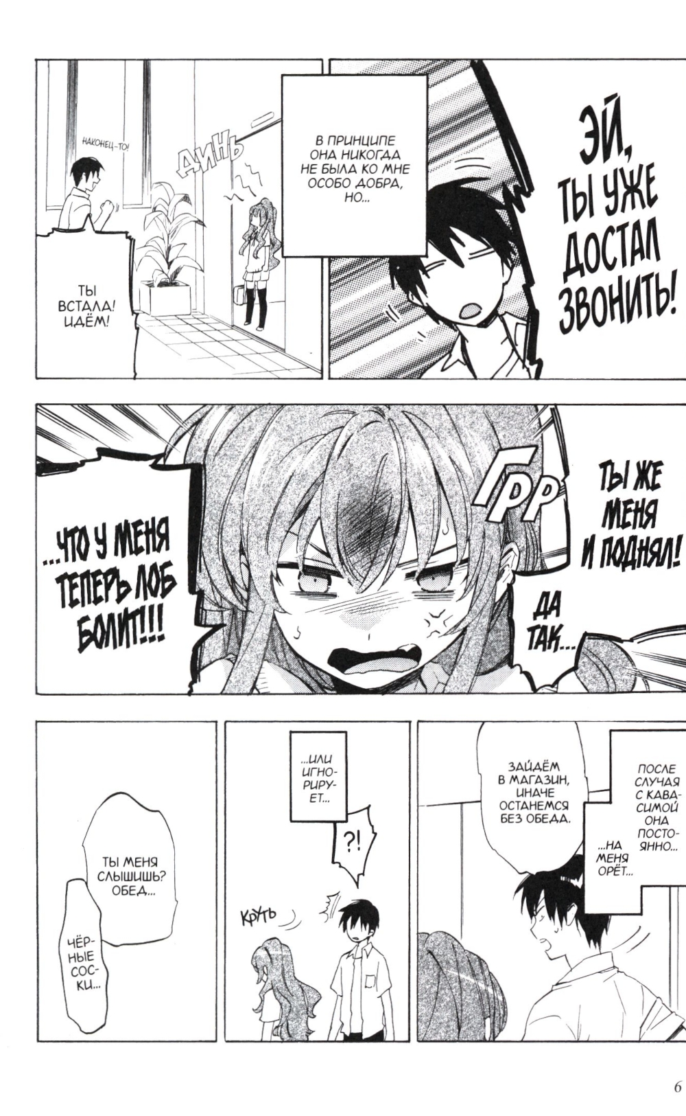 Рюдзи Такасу не повезло с самого рождения: от отца-мафиози он унаследовал устрашающий взгляд, поэтому его, несмотря на мягкий характер, считают самым опасным хулиганом во всей округе. Начинается новый учебный год, и Рюдзи окрылен надеждой - в один с ним класс попали как его единственный друг Китамура, так и девушка его мечты Минори Кусиэда. Но в каждой бочке меда есть ложка дегтя: в том же классе учится миниатюрная, но чрезвычайно опасная Тайга Айсака, которую за суровый нрав прозвали Карманным Тигром. Рюдзи, к своему несчастью, случайно узнаёт её секрет...| Издательство | Фабрика комиксов |