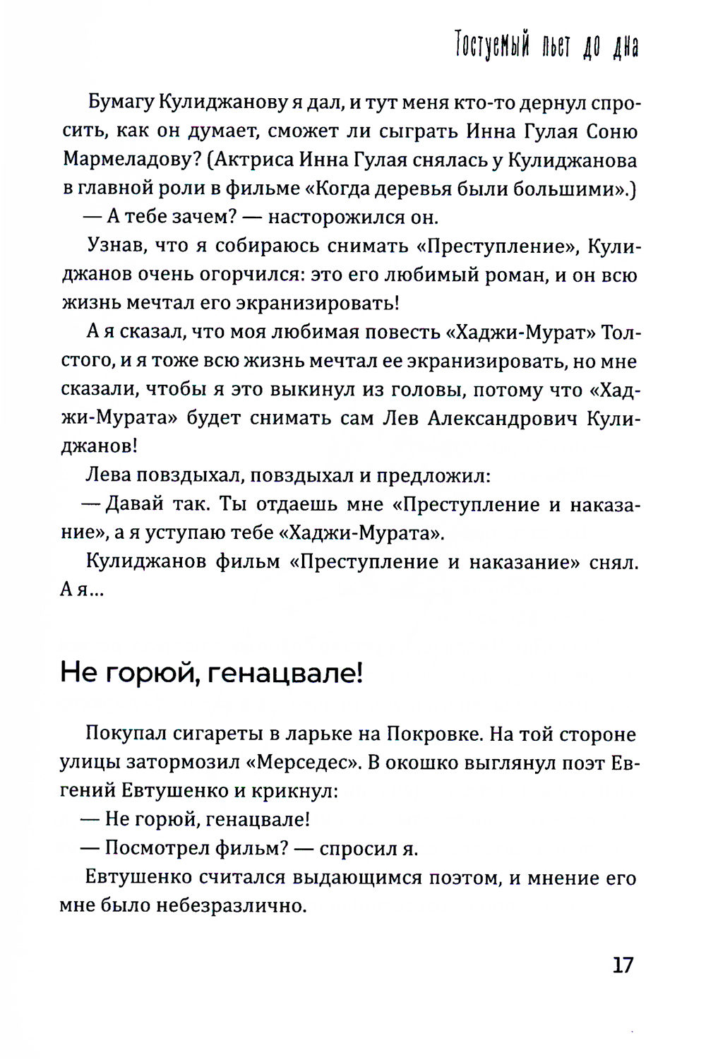 Георгий Данелия - известный во всем мире и культовый в советском и постсоветском пространстве режиссер и сценарист. В ХХI веке Георгий Данелия написал несколько книг, ставших бестселлерами, и фактически создал жанр короткометражного рассказа. Во второй книге «Тостуемый пьет до дна» цикла из трех книг Георгий Данелия вспоминает о планах экранизировать «Хаджи-Мурата» и «Преступление и наказание», «Мертвые души» и «Мастера и Маргариту», о встречах в Болшеве и работе на «Мосфильме»… Без назидания, но с потрясающей мудростью, накопленной за годы жизни и работы в кинематографе, и удивительным чувством юмора, автор рассказывает о своей семье, времени, в котором ему довелось жить и работать, друзьях, коллегах. Не случайно друзья называли Георгия Данелия «умнейшим человеком своего времени». В общем, читайте, скучать не придется!| Издательство | Рипол Классик |