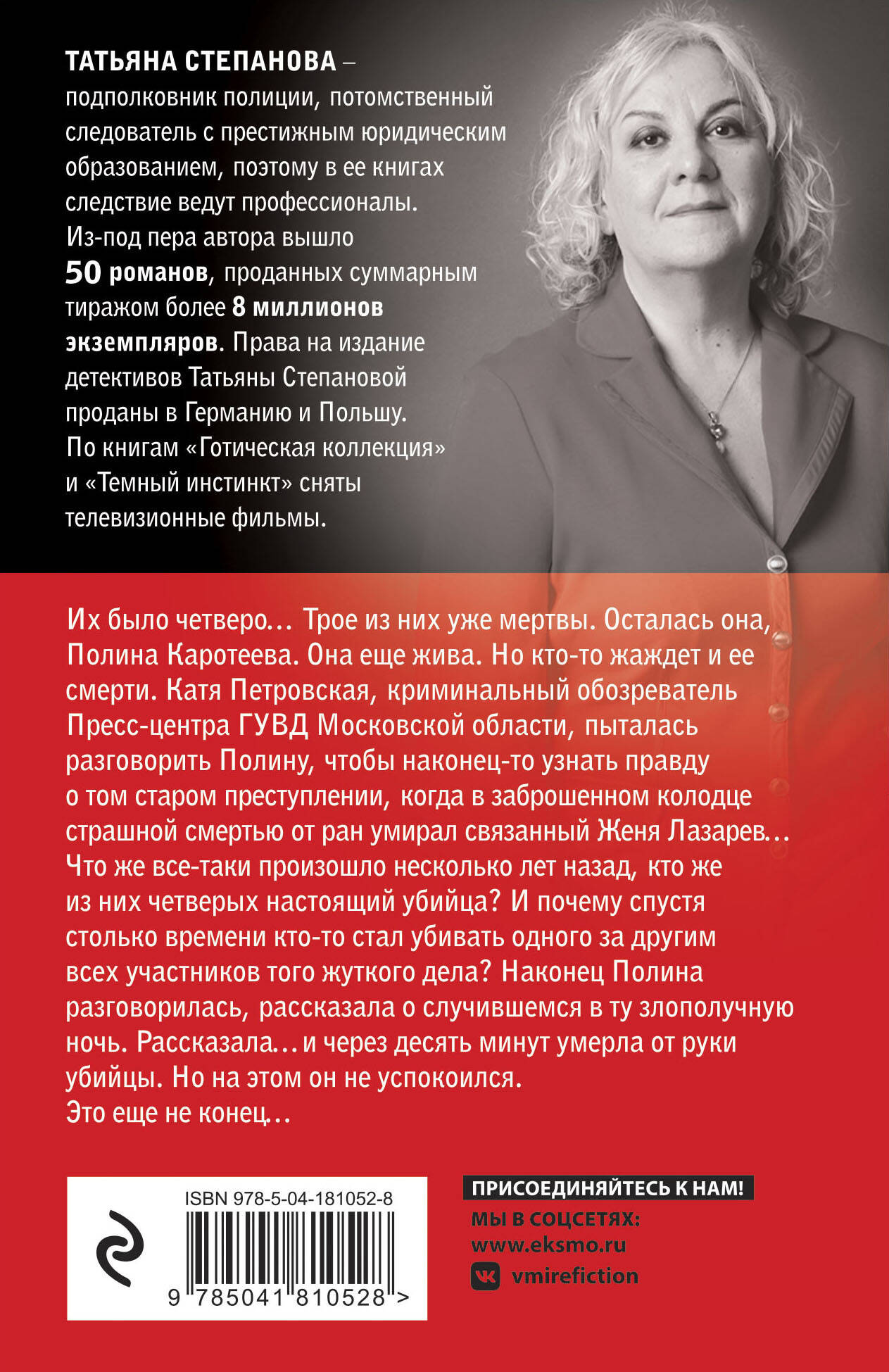 Их было четверо… Трое из них уже мертвы. Осталась она, Полина Каротеева. Она еще жива. Но кто-то жаждет и ее смерти. Катя Петровская, криминальный обозреватель Пресс-центра ГУВД Московской области, пыталась разговорить Полину, чтобы наконец-то узнать правду о том старом преступлении, когда в заброшенном колодце страшной смертью от ран умирал связанный Женя Лазарев… Что же все-таки произошло несколько лет назад, кто же из них четверых настоящий убийца? И почему спустя столько времени кто-то стал убивать одного за другим всех участников того жуткого дела? Наконец Полина разговорилась, рассказала о случившемся в ту злополучную ночь. Рассказала… и через десять минут умерла от руки убийцы. Но на этом он не успокоился. Это еще не конец… Романы потомственного следователя Татьяны Степановой позволяют читателю побывать в литературной «комнате страха». Таинственные убийства, почти осязаемая атмосфера преступления, томительное и тревожное ожидание чего-то неведомого, пугающего... Все это Татьяне Степановой удается воспроизвести просто блестяще. Случайные встречи, повседневные дела, незначительные детали изображаются в ее детективах в каком-то особом, драматическом свете, словно безобидный весенний луг перед стремительно надвигающейся грозой.| Издательство | ООО "Издательство "Эксмо" |