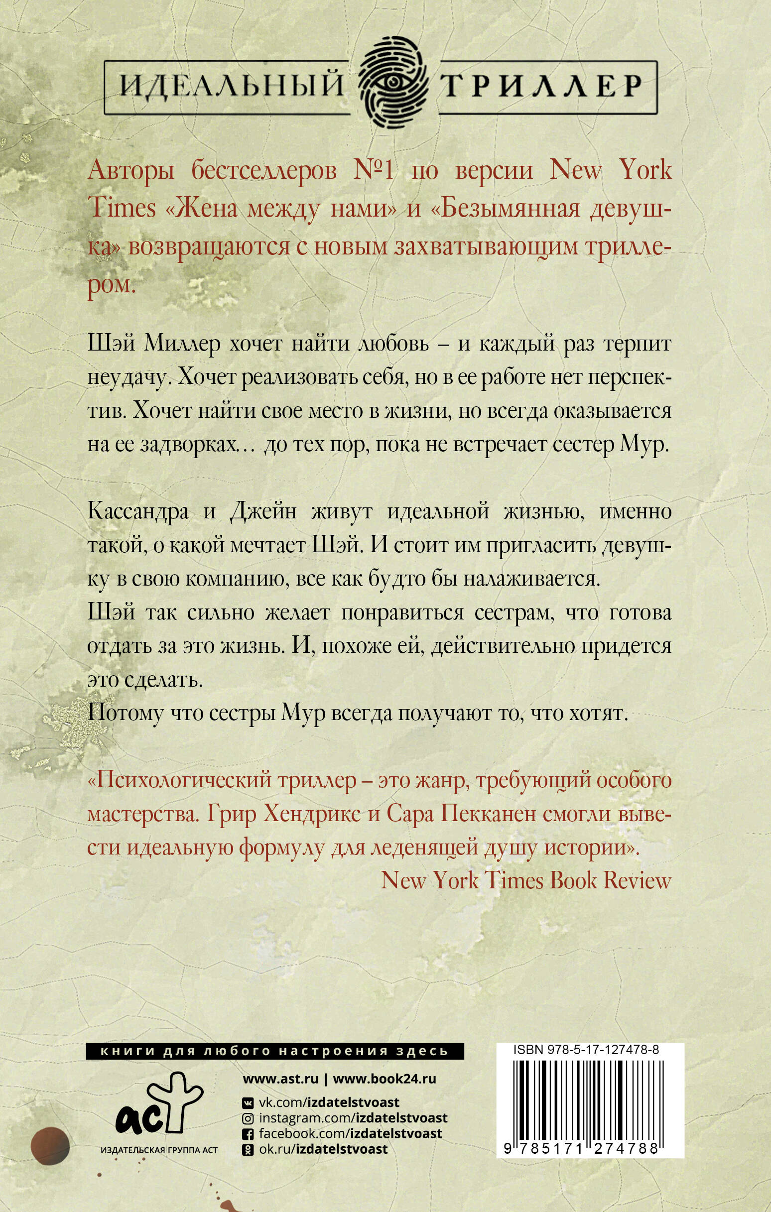 • Новая книга от авторов бестселлеров № 1 по версии New York Times. • Одна из самых ожидаемых книг 2020 года по версии журнала Marie Claire. • Более 23 000 положительных отзывов на Goodreads и номинант на премию «Выбор сайта Goodreads-2020» в категории «Лучшая тайна и триллер». Шей Миллер живёт в Нью-Йорке, мечтает найти свою любовь и цель в жизни. И всё раз за разом идёт наперекосяк, а симпатичный сосед, на которого та положила глаз, вдруг решил съехаться с новой подружкой. Но однажды мир девушки переворачивается с ног на голову, когда она становится свидетельницей самоубийства: некая Аманда сознательно бросается под поезд. Данное событие настолько шокировало Шей, что та решает узнать о жизни несчастной как можно больше. И это подтолкнёт её к встрече с подругами Аманды - обворожительными сестрами Кассандрой и Джейн, которые мигом затянут девушку в их такой манящей и привлекательный мир. Правда бедняжка и не догадывается, что за мрачный секрет хранят ей новые подруги, которых она приобрела на свою голову…| Издательство | ИЗДАТЕЛЬСТВО "АСТ" |