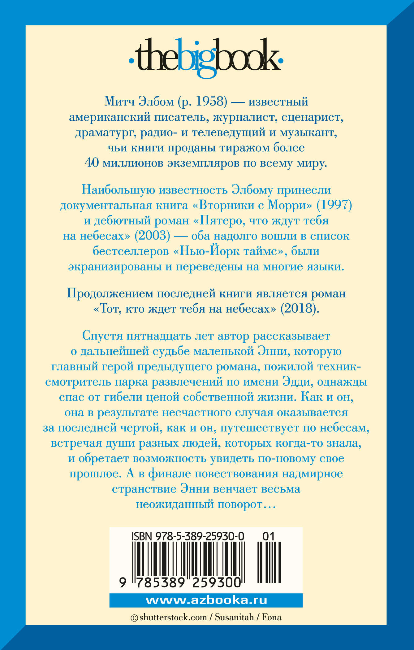 Митч Элбом (р. 1958) - известный американский писатель, журналист, сценарист, драматург, радио- и телеведущий и музыкант, чьи книги проданы тиражом более 40 миллионов экземпляров по всему миру. Наибольшую известность Элбому принесли документальная книга "Вторники с Морри" (1997) и дебютный роман "Пятеро, что ждут тебя на небесах" (2003) - оба надолго вошли в список бестселлеров "Нью-Йорк таймс", были экранизированы и переведены на многие языки. Продолжением последней книги является роман "Тот, кто ждет тебя на небесах" (2018). Спустя пятнадцать лет автор рассказывает о дальнейшей судьбе маленькой Энни, которую главный герой предыдущего романа, пожилой техник-смотритель парка развлечений по имени Эдди, однажды спас от гибели ценой собственной жизни. Как и он, она в результате несчастного случая оказывается за последней чертой, как и он, путешествует по небесам, встречая души разных людей, которых когда-то знала, и обретает возможность увидеть по-новому свое прошлое. А в финале повествования надмирное странствие Энни венчает весьма неожиданный поворот…