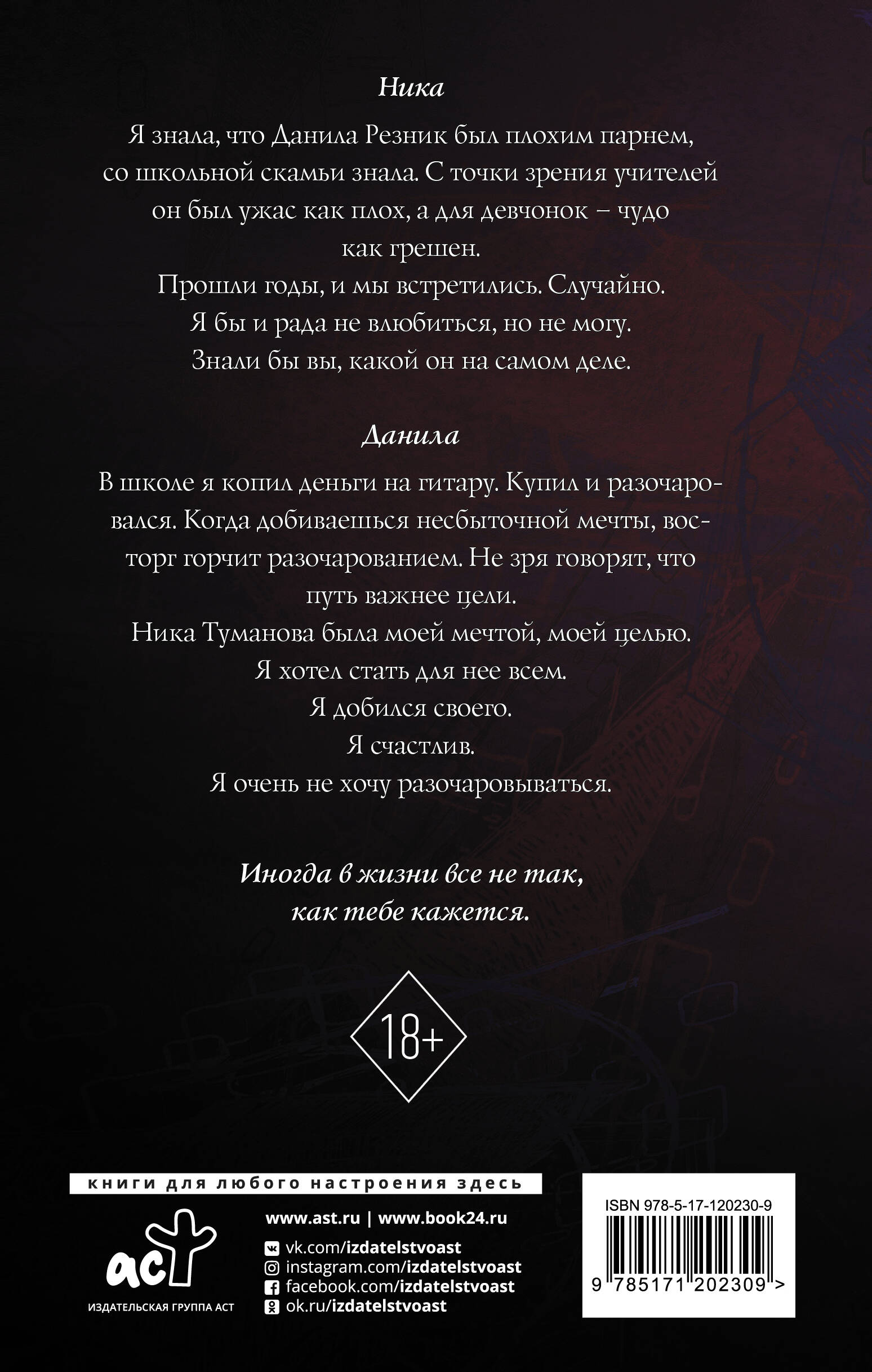 Я знала, что Данила Резник был плохим парнем, со школьной скамьи знала. С точки зрения учителей он был ужас как плох, а для девчонок - чудо как грешен. Прошли годы, и мы встретились. Случайно. Я бы и рада не влюбиться, но не могу. Знали бы вы, какой он на самом деле. В школе я копил деньги на гитару. Купил и разочаровался. Когда добиваешься несбыточной мечты, восторг горчит разочарованием. Не зря говорят, что путь важнее цели. Ника Туманова была моей мечтой, моей целью. Я хотел стать для нее всем. Я добился своего. Я счастлив. Я очень не хочу разочаровываться. Иногда в жизни все не так, как тебе кажется.| Издательство | ИЗДАТЕЛЬСТВО "АСТ" |