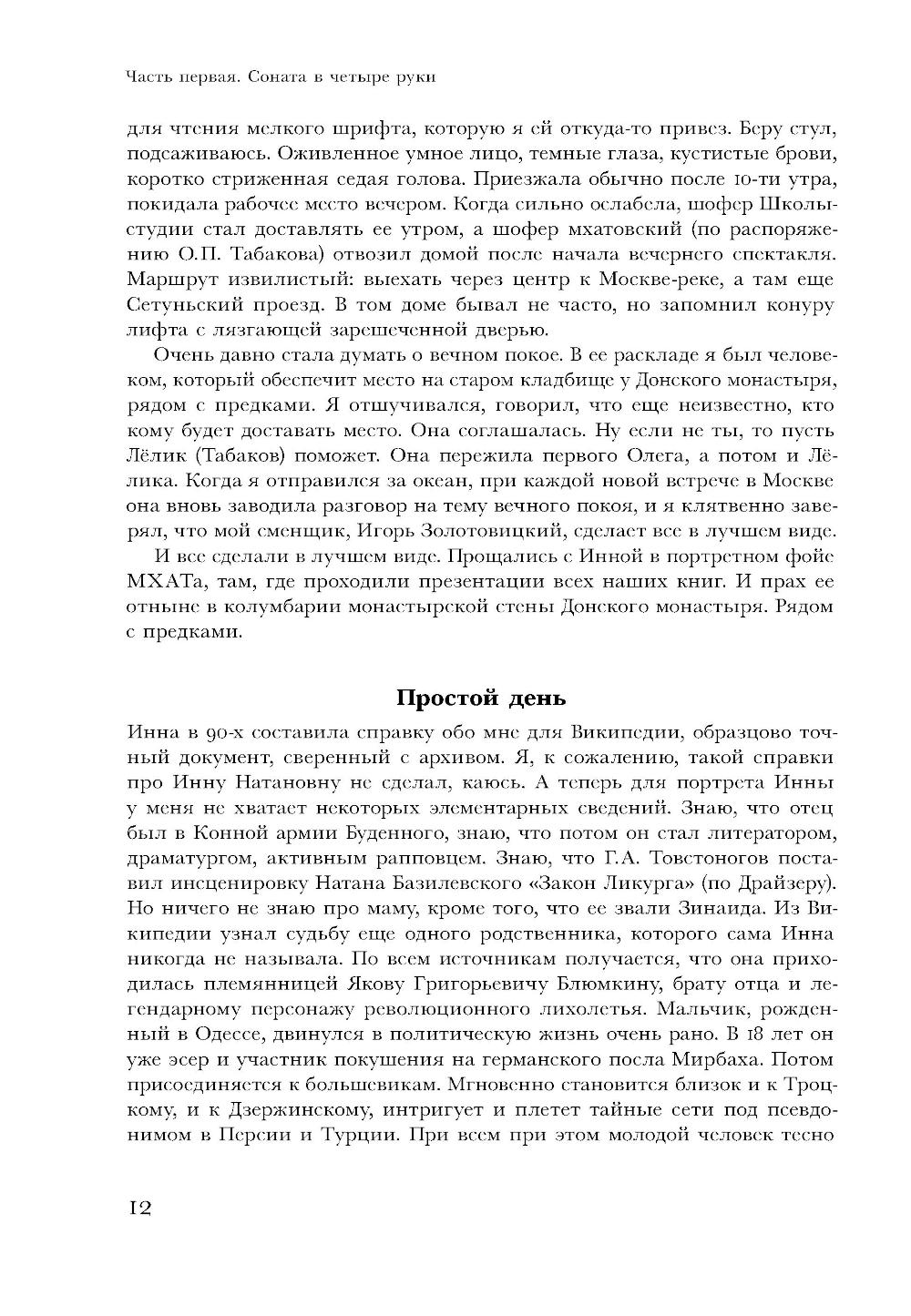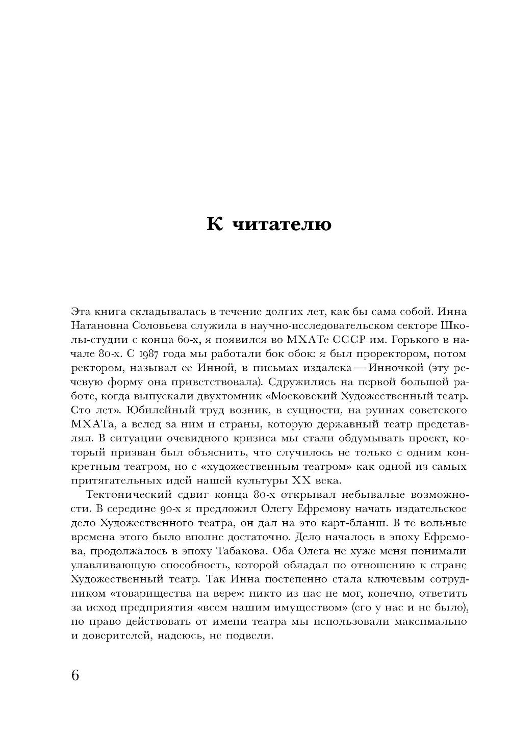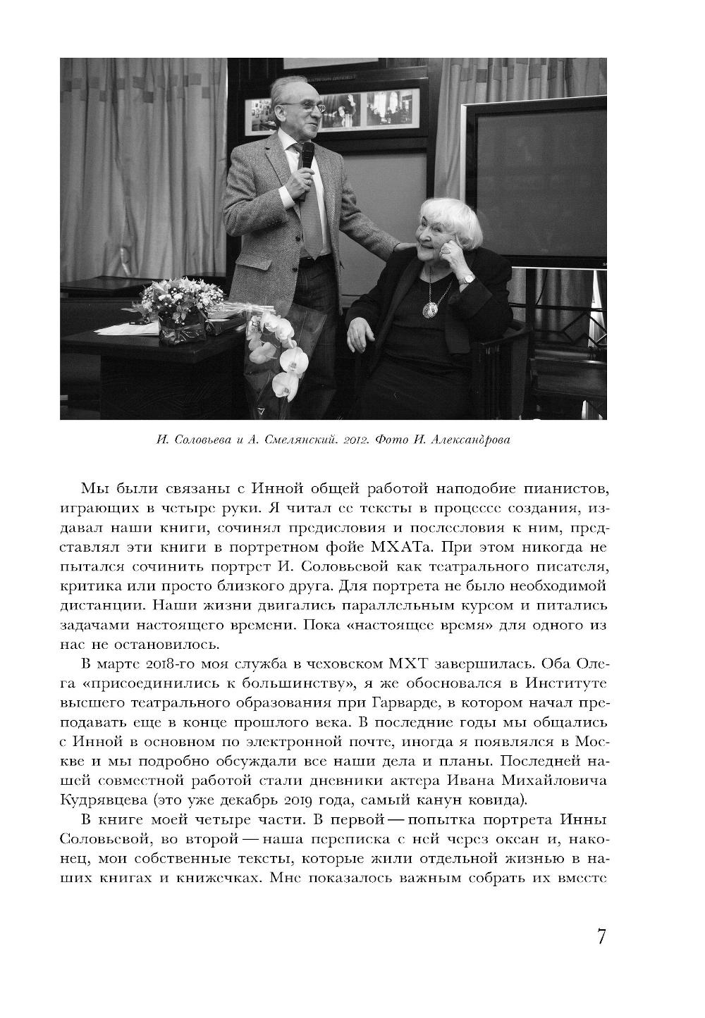 Книга Анатолия Смелянского посвящена его давнему другу и соратнику, выдающемуся театральному писателю и критику - Инне Натановне Соловьевой (1927-2024). В первой части автор предпринимает попытку написать портрет И. Соловьевой, реконструируя ее биографию и дополняя факты яркими воспоминаниями-сценками и точными психологическими штрихами. Вторая часть книги представляет собой переписку А. Смелянского и И. Соловьевой; даже разделенные Атлантическим океаном, собеседники продолжали совместную работу и диалог, в котором рассуждали о судьбе МХАТа в XX веке. В третьей и четвертой частях собраны тексты, написанные А. Смелянским в разные годы и по разным поводам, так или иначе связанные с главными работами И. Соловьевой и с тем пониманием Художественного театра, которое она исповедовала. Анатолий Смелянский - доктор искусствоведения, театральный критик, историк театра, автор многочисленных авторских программ о русском театре ХX века, показанных на телеканале «Культура».| Издательство | Новое литературное обозрение |