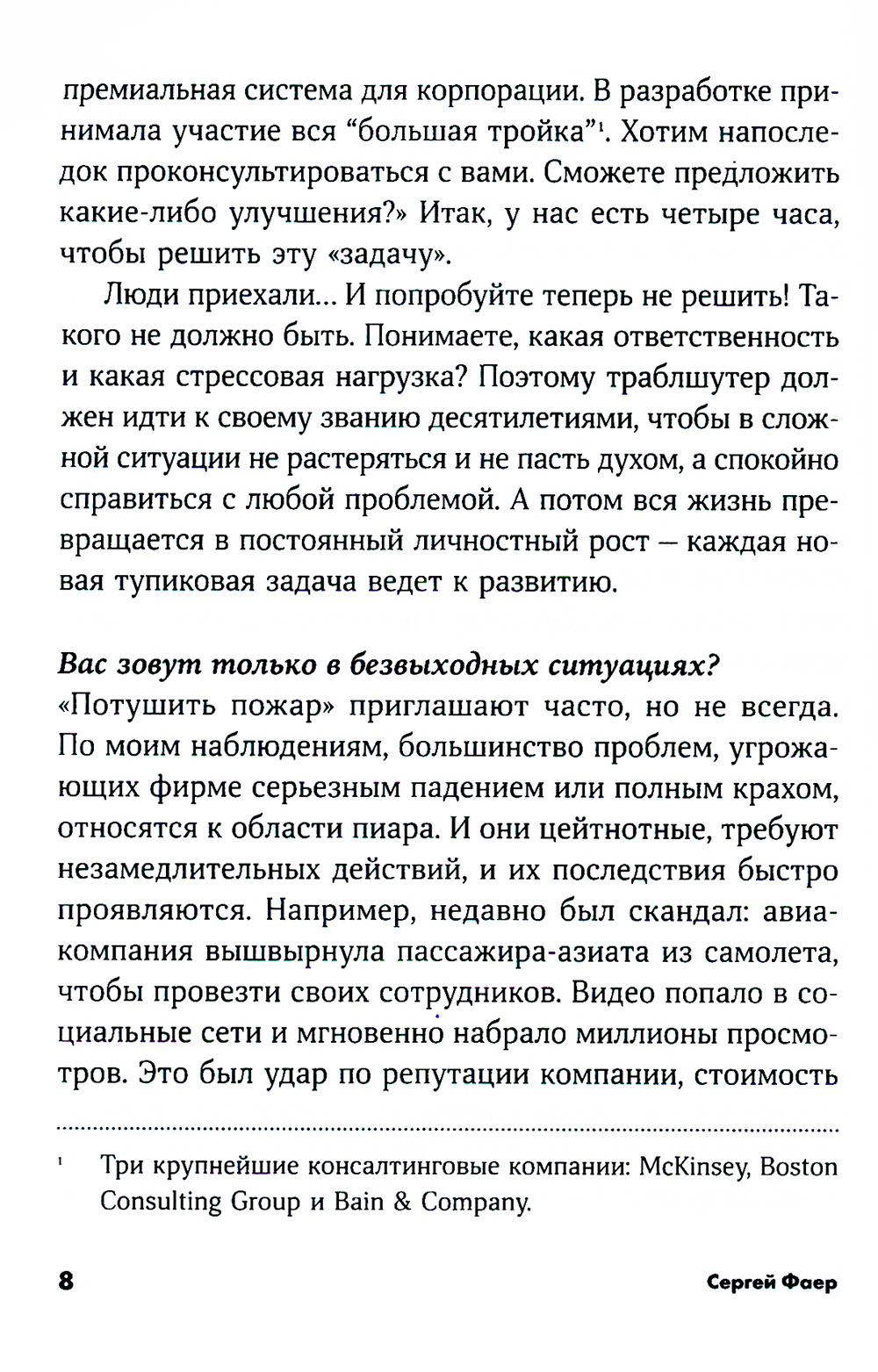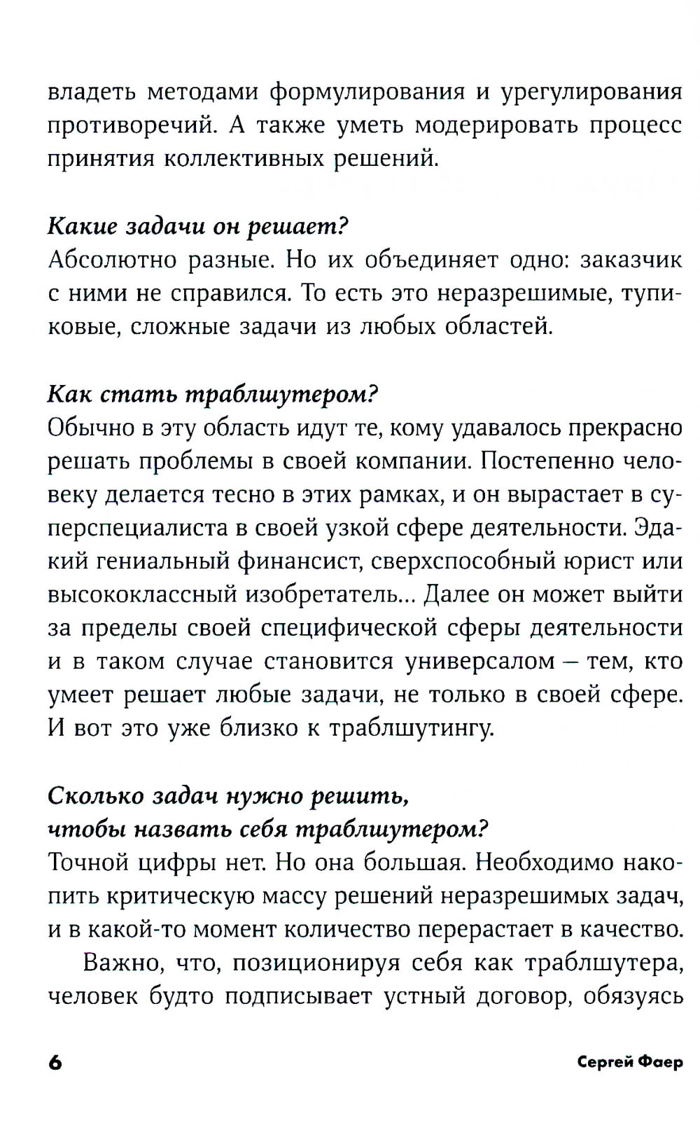 В бизнесе важно уметь находить выход из любой, казалось бы, безвыходной ситуации. Причем быстро и с минимальными затратами. В этот момент очень полезным оказывается траблшутер - специалист по решению проблем. Эти уникальные люди владеют универсальным алгоритмом решения задач и умеют смотреть на проблемы с разных, порой неожиданных, сторон. Сергей Фаер, траблшутер с более чем 30-летним опытом решения задач и первый в России мастер ТРИЗ в нетехнической сфере, написал книгу, в которой четко объясняет основы теории решения изобретательских задач (ТРИЗ) - основного инструмента траблшутера. А самое главное, делится собственными наработками и практикой применения логических инструментов ТРИЗ в нетехнической сфере, то есть для решения деловых, творческих, политических и прочих задач. После прочтения книги и решения всех предложенных в ней головоломок вы поймете, как мыслит траблшутер, и, вполне вероятно, самостоятельно сможете решить многие из задач, которые еще недавно казались нерешаемыми.| Издательство | Альпина Паблишер |