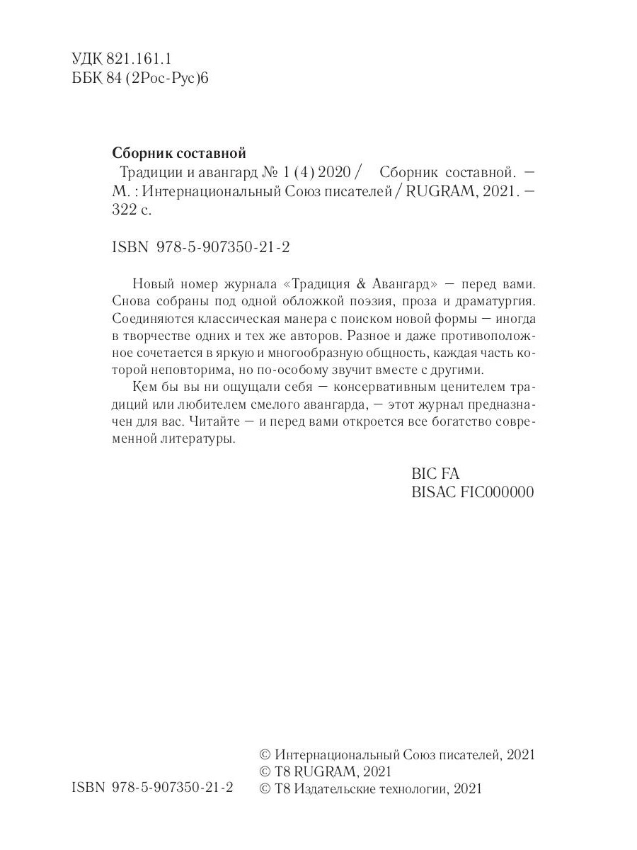Новый номер журнала «Традиция & Авангард» - перед вами. Снова собраны под одной обложкой поэзия, проза и драматургия. Соединяются классическая манера с поиском новой формы - иногда в творчестве одних и тех же авторов. Разное и даже противоположное сочетается в яркую и многообразную общность, каждая часть которой неповторима, но по-особому звучит вместе с другими. Кем бы вы ни ощущали себя - консервативным ценителем традиций или любителем смелого авангарда, - этот журнал предназначен для вас. Читайте - и перед вами откроется все богатство современной литературы.