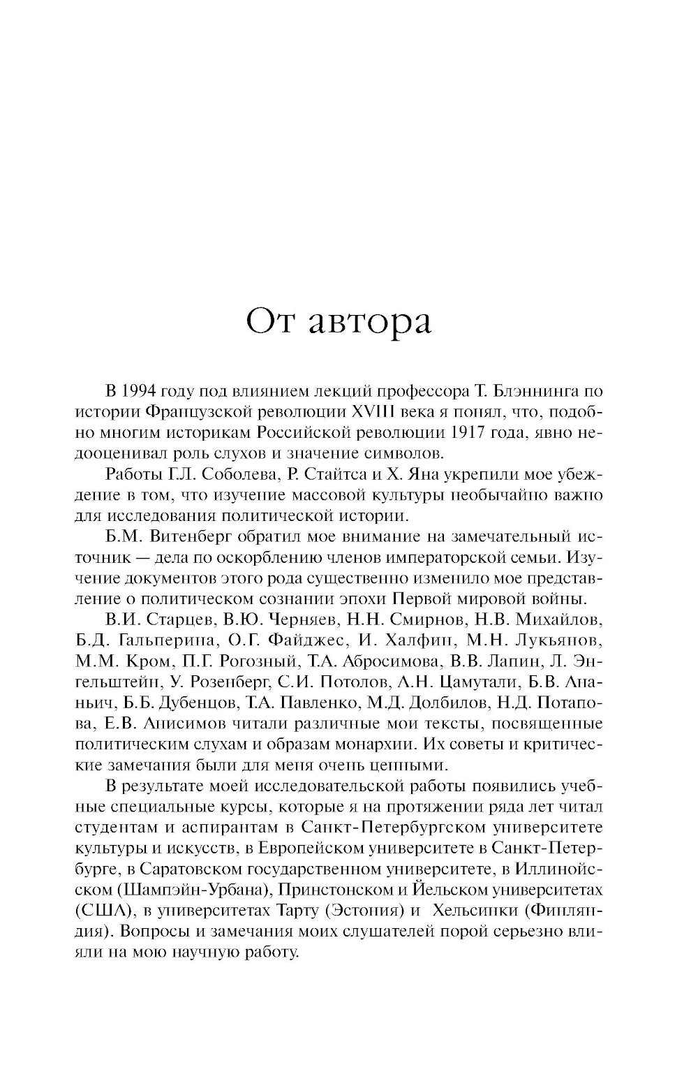 Верноподданным российского императора следовало не только почитать сво-его государя, но и любить его. Император и члены его семьи должны были своими действиями пробуждать народную любовь. Этому служили тщательно продуманные ритуалы царских поездок и церемоний награждения, официаль-ные речи и неформальные встречи, широко распространявшиеся портреты и патриотические стихи. В годы Первой мировой войны пробуждение народной любви стало важнейшим элементом монархически-патриотической мобилизации российского общества. Б. И. Колоницкий изучает, как пытались повысить свою популярность члены императорской семьи - Николай II, императрица Александра Федоровна, Верховный главнокомандующий великий князь Николай Николаевич, вдовствующая императрица Мария Федоровна. Автор исследует и восприятие образов Романовых. Среди многочисленных источников, на основе которых написана книга, - петиции, дневники и письма современников, материалы уголовных дел против людей, обвиненных в заочном оскорблении членов царской семьи.