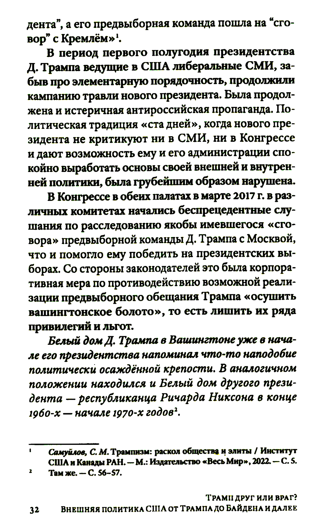 Президентские выборы в Америке - самая большая политическая интрига 2024. Покушение на кандидата в президенты США Дональда Трампа произошло 13 июля 2024 года в результате стрельбы на митинге в Батлере (Пенсильвания) в рамках предвыборной кампании президента США 2024 года. Одна из пуль прошла в миллиметрах от головы Трампа, прострелив ему ухо. Дебаты между действующим президентом Джо Байденом и бывшим лидером США Дональдом Трампом состоялись 27 июня 2024 года. По оценке близких к демократам СМИ, Джо Байден проиграл дебаты и выступление действующего президента стало для него катастрофой. Трамп - он друг или враг России? Оставим иллюзии диванным конспи-рологам и обратимся к фактам. Экстраординарное, остро конфликтное президентство несистемного Дональда Трампа в сфере внешней политики породило много новых, нетрадиционных подходов к различным странам и регионам по всему миру. Это новаторство, зачастую, вызывало острейшую критику, как внутри США, так и за рубежом. Такие важнейшие компоненты трампизма, как: эскалация напряжённости со сверхдержавами Россией и Китаем, грубое давление на союзников по НАТО, выход из многосторонней «ядерной сделки» с Ираном, запугивание властей Венесуэлы, грубое политико-дипломатическое наступление на палестинцев, несомненно, усиливали степень турбулентности и неустойчивости международной системы. Ненавидящая Дональда Трампа демократическая администрация Джо Ьай-дена продолжила его курс: восстановление позиции Соединенных Штатов Америки как единственной сверхдержавы-диктатора на планете. А в отношении России и Китая она не просто продлила трампизм, а пошла гораздо дальше, ещё более увеличивая международную турбулентность. Истоки и корни современного американского внешнеполитического «трампизма» глубоко и исчерпывающе проанализированы в этой книге.| Издательство | Книжный мир |