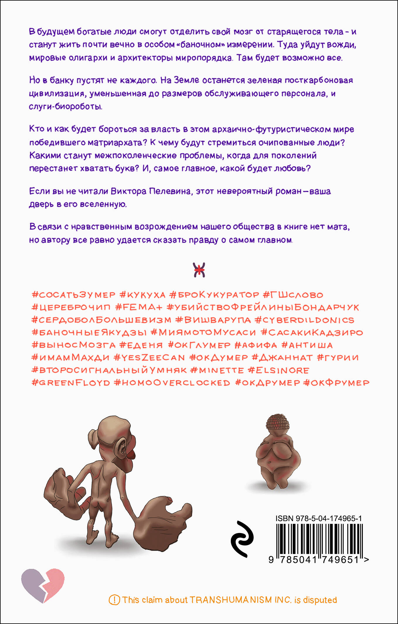 1. В прошлом году компания Илона Маска вживила имплант-нейролинк в череп свинье. Что произойдет, когда такими имплантами - естественно, для нашего же блага - в добровольно-принудительном порядке снабдят нас всех? 2. Кто счастливее - человек или кошка? Что такое человек - тело, мозг или что-то другое? Можно ли сделать нас счастливыми с помощью электрической стимуляции мозга? Вы получите ответы на эти и многие другие вопросы. 3. Каждый роман Виктора Пелевина - квест, в котором нет победителей и проигравших. Это интеллектуальная радость высшей пробы. 4. Виктор Пелевин - блестящий русский прозаик, имя которого стало синонимом тонкого юмора и иронии, вкуса, умения задавать новые тренды и из года в год радовать огромную армию читателей. 5. Читать Пелевина - значит, быть в курсе новейших веяний эпохи.| Издательство | ООО "Издательство "Эксмо" |