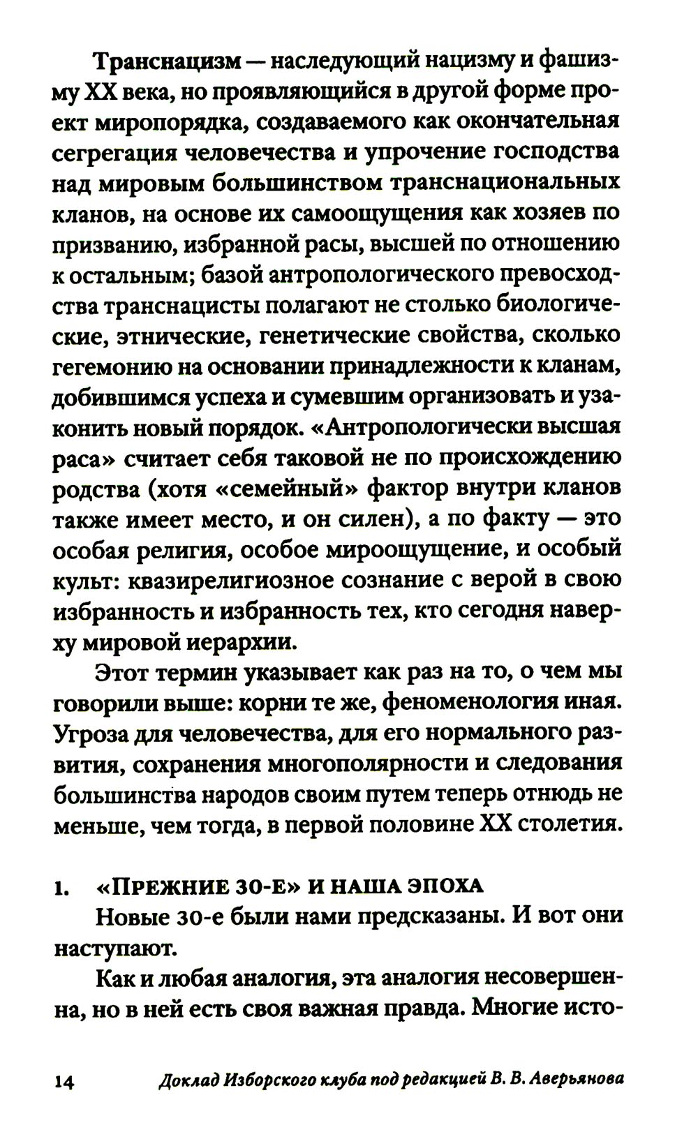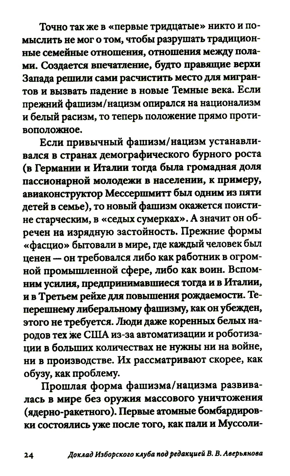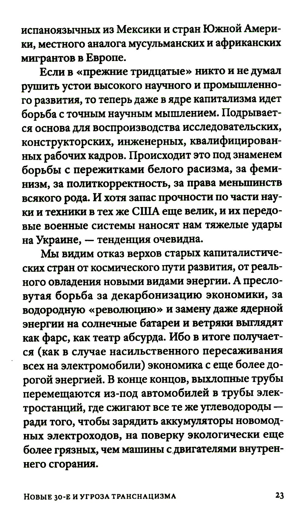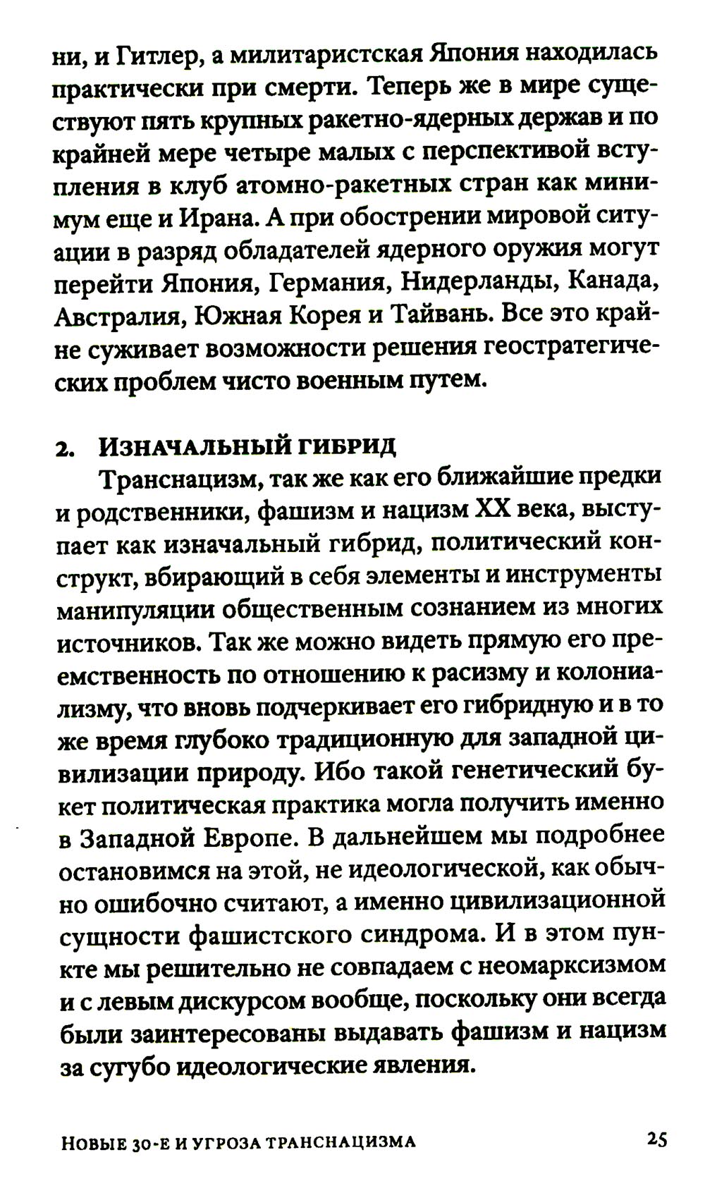 Новые 30-е были нами предсказаны. И вот они наступают. Нынешний «криптофашизм» возникает на развалинах Второй Глобализации, бурно поднимавшейся примерно с 1980-х. Нас вновь ждет раздел экономики планеты на макрорегионы, ожесточенная борьба за передел сфер влияния. Капитализм сходит со сцены, а фашизм, этот вовсе не ультраправый, а сложный лево-правый гибрид - это такой строй, который капиталисты «включают» в экстренной исторической ситуации, цепляясь за жизнь и пытаясь удержать свое господство. В то же время как немецкий, так и современный фашизм закодирован в самой сущности западной цивилизации, в её чувстве превосходства, надменности, эгоизме, жадности, мании величия. Авторы Изборского клуба, знаменитые философы, историки, футурологи, писатели, дают достаточно предметный и конкретный образ новой угрозы естественному развитию человечества - транснацизма. Это особая вера в транснациональное антропологическое превосходство «избранных», уже не расовое, не национальное, а открыто клановое. Однако у «трансов» речь идет уже не о сверхчеловеке, а о постчеловеке, о решительном вторжении в человеческую природу (трансгуманизм, подчинение масс Искусственному Интеллекту, новый вид искусственного отбора тех, кто останется жить). Едва ли не единственным реальным конкурентом глобальной утопии рассматриваются сегодня именно русские. Из этого следует, что нынешней России нужно продолжить внутреннюю мобилизацию, начатую в 2022 году, а вовсе не сворачивать ее. Следующая «оттепель» по отношению к Западу, буди она случится - смерти подобна. Важна здесь позитивная программа развития. Если у них все сводится к экспериментам с «пятью полами» и сексом, с коммерческим редактированием генов миллиардеров, с манипуляцией страхами, связанными с климатической катастрофой и перенаселенностью - то мы можем и должны противопоставить этому самоослеплению новые аналоги Атомного и Космического проектов XX века, новую веру в разум и совесть человека, способного не только к хищничеству, но и к общему делу.| Издательство | Книжный мир |