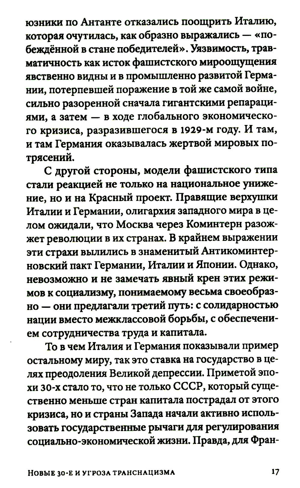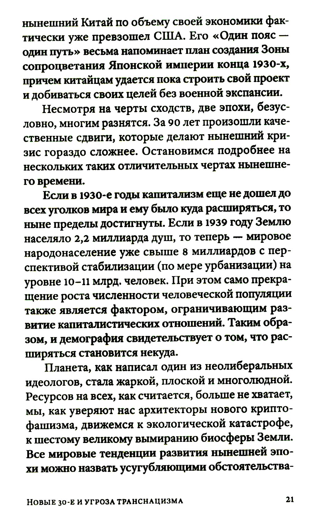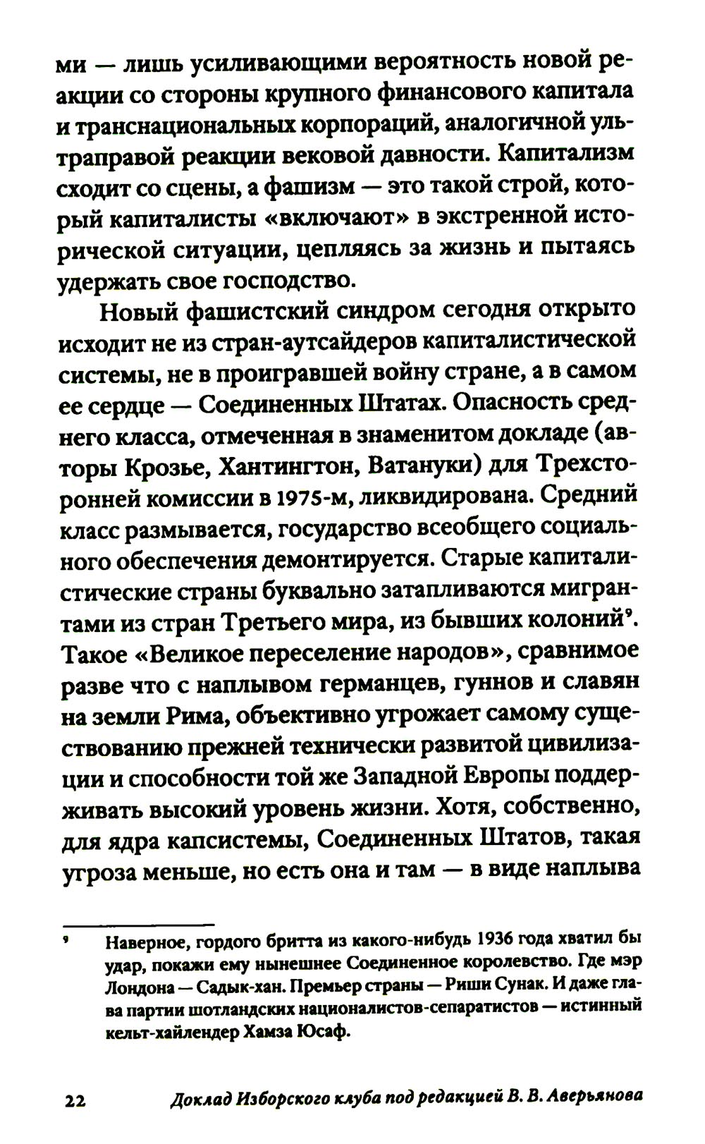 Новые 30-е были нами предсказаны. И вот они наступают. Нынешний «криптофашизм» возникает на развалинах Второй Глобализации, бурно поднимавшейся примерно с 1980-х. Нас вновь ждет раздел экономики планеты на макрорегионы, ожесточенная борьба за передел сфер влияния. Капитализм сходит со сцены, а фашизм, этот вовсе не ультраправый, а сложный лево-правый гибрид - это такой строй, который капиталисты «включают» в экстренной исторической ситуации, цепляясь за жизнь и пытаясь удержать свое господство. В то же время как немецкий, так и современный фашизм закодирован в самой сущности западной цивилизации, в её чувстве превосходства, надменности, эгоизме, жадности, мании величия. Авторы Изборского клуба, знаменитые философы, историки, футурологи, писатели, дают достаточно предметный и конкретный образ новой угрозы естественному развитию человечества - транснацизма. Это особая вера в транснациональное антропологическое превосходство «избранных», уже не расовое, не национальное, а открыто клановое. Однако у «трансов» речь идет уже не о сверхчеловеке, а о постчеловеке, о решительном вторжении в человеческую природу (трансгуманизм, подчинение масс Искусственному Интеллекту, новый вид искусственного отбора тех, кто останется жить). Едва ли не единственным реальным конкурентом глобальной утопии рассматриваются сегодня именно русские. Из этого следует, что нынешней России нужно продолжить внутреннюю мобилизацию, начатую в 2022 году, а вовсе не сворачивать ее. Следующая «оттепель» по отношению к Западу, буди она случится - смерти подобна. Важна здесь позитивная программа развития. Если у них все сводится к экспериментам с «пятью полами» и сексом, с коммерческим редактированием генов миллиардеров, с манипуляцией страхами, связанными с климатической катастрофой и перенаселенностью - то мы можем и должны противопоставить этому самоослеплению новые аналоги Атомного и Космического проектов XX века, новую веру в разум и совесть человека, способного не только к хищничеству, но и к общему делу.| Издательство | Книжный мир |