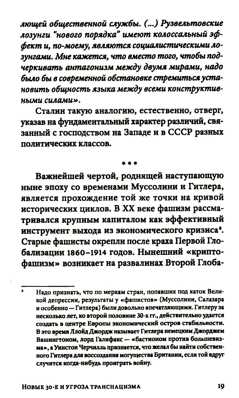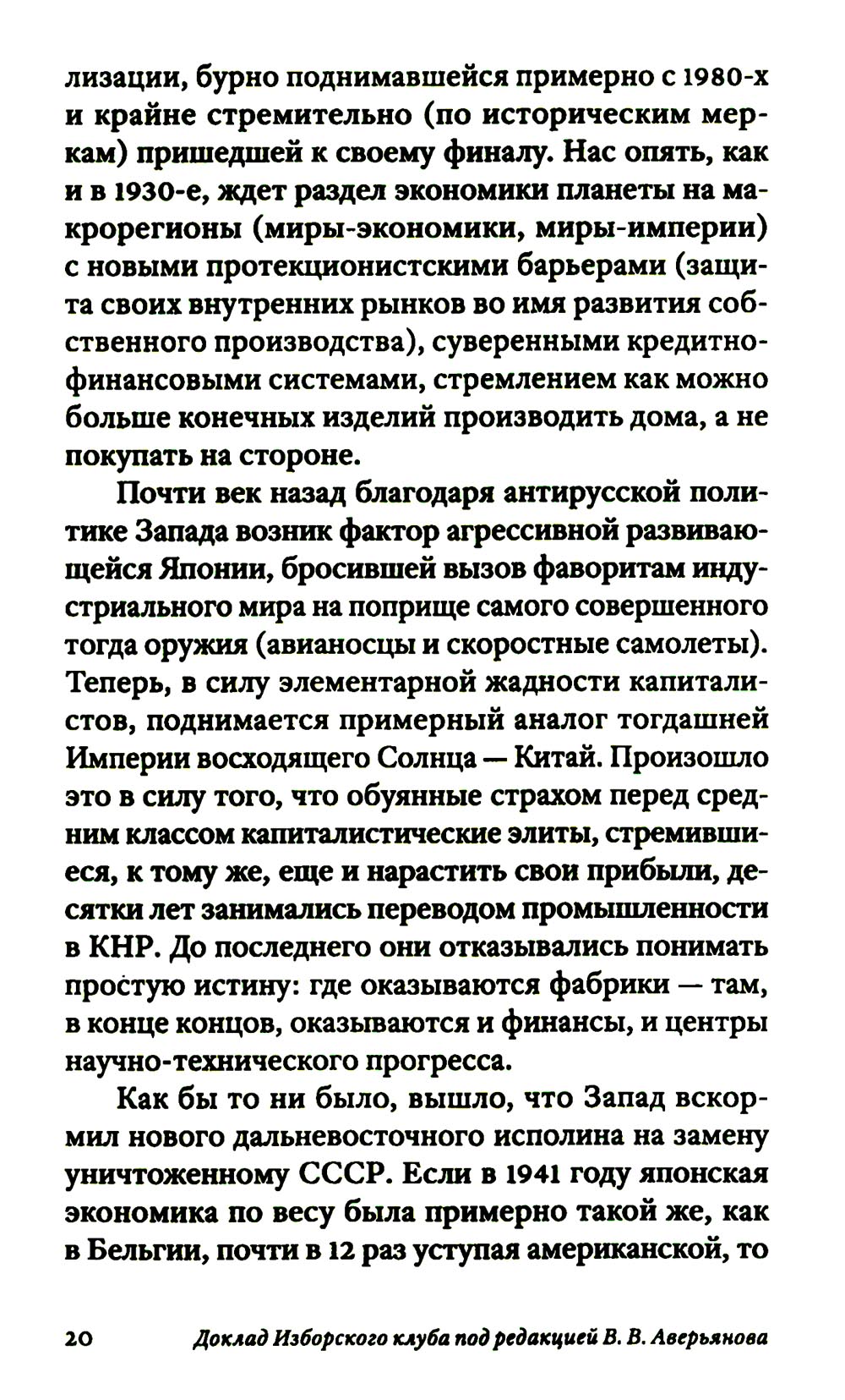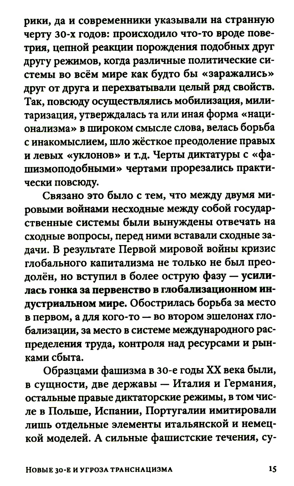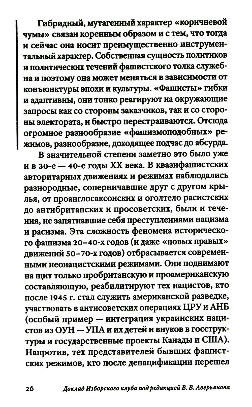 Новые 30-е были нами предсказаны. И вот они наступают. Нынешний «криптофашизм» возникает на развалинах Второй Глобализации, бурно поднимавшейся примерно с 1980-х. Нас вновь ждет раздел экономики планеты на макрорегионы, ожесточенная борьба за передел сфер влияния. Капитализм сходит со сцены, а фашизм, этот вовсе не ультраправый, а сложный лево-правый гибрид - это такой строй, который капиталисты «включают» в экстренной исторической ситуации, цепляясь за жизнь и пытаясь удержать свое господство. В то же время как немецкий, так и современный фашизм закодирован в самой сущности западной цивилизации, в её чувстве превосходства, надменности, эгоизме, жадности, мании величия. Авторы Изборского клуба, знаменитые философы, историки, футурологи, писатели, дают достаточно предметный и конкретный образ новой угрозы естественному развитию человечества - транснацизма. Это особая вера в транснациональное антропологическое превосходство «избранных», уже не расовое, не национальное, а открыто клановое. Однако у «трансов» речь идет уже не о сверхчеловеке, а о постчеловеке, о решительном вторжении в человеческую природу (трансгуманизм, подчинение масс Искусственному Интеллекту, новый вид искусственного отбора тех, кто останется жить). Едва ли не единственным реальным конкурентом глобальной утопии рассматриваются сегодня именно русские. Из этого следует, что нынешней России нужно продолжить внутреннюю мобилизацию, начатую в 2022 году, а вовсе не сворачивать ее. Следующая «оттепель» по отношению к Западу, буди она случится - смерти подобна. Важна здесь позитивная программа развития. Если у них все сводится к экспериментам с «пятью полами» и сексом, с коммерческим редактированием генов миллиардеров, с манипуляцией страхами, связанными с климатической катастрофой и перенаселенностью - то мы можем и должны противопоставить этому самоослеплению новые аналоги Атомного и Космического проектов XX века, новую веру в разум и совесть человека, способного не только к хищничеству, но и к общему делу.| Издательство | Книжный мир |