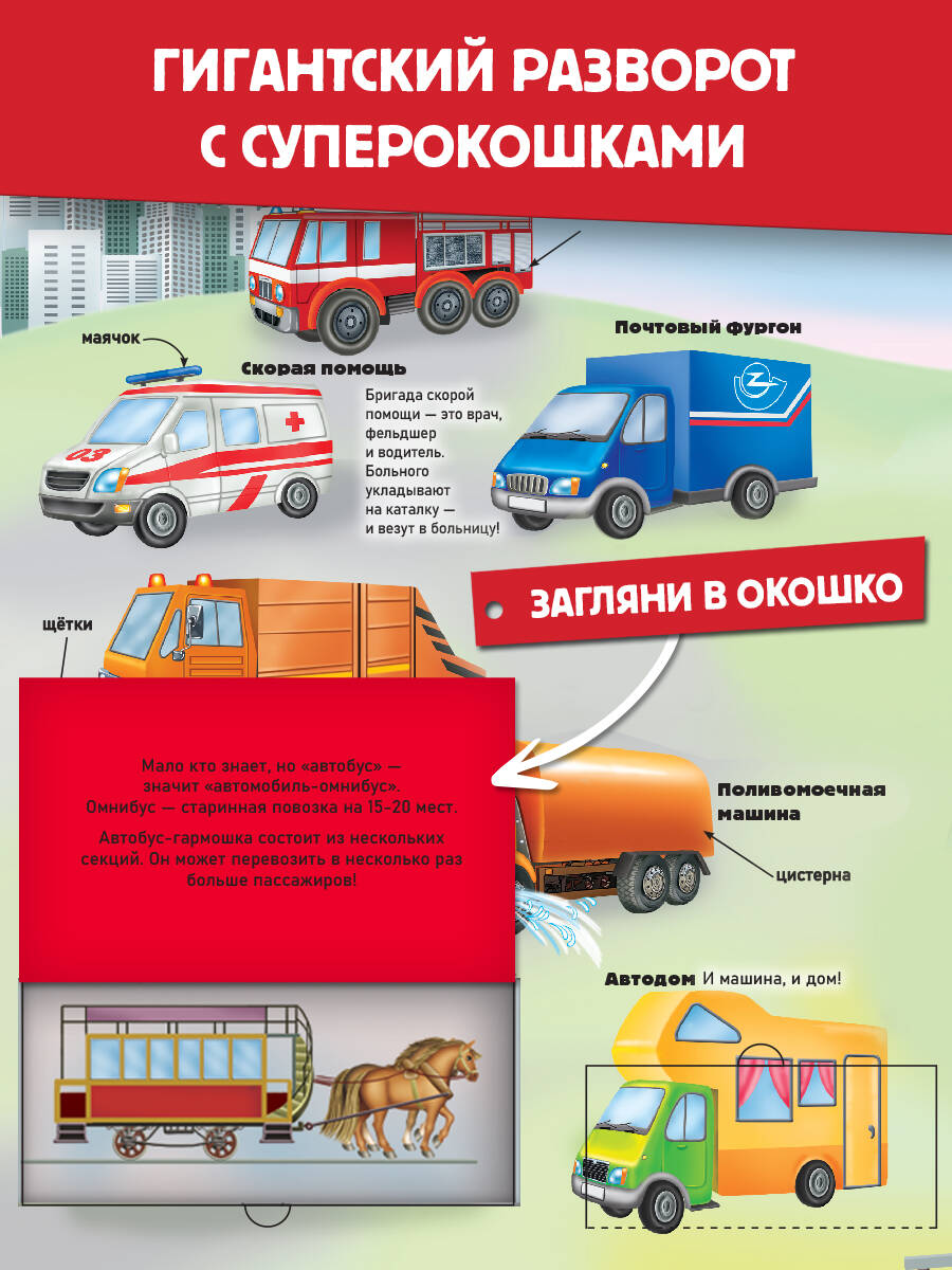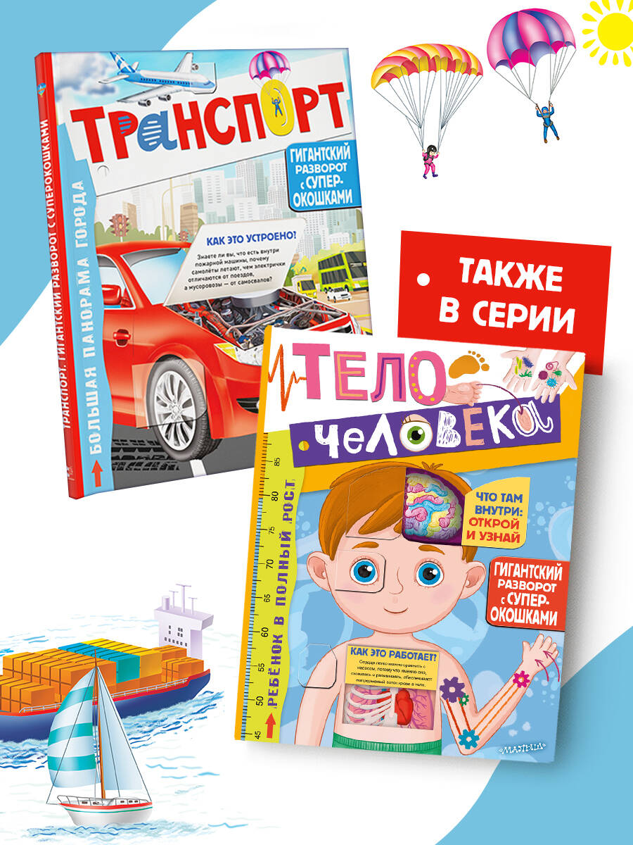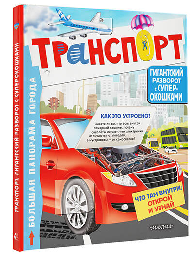 Большая книжка-раскладушка для почемучек "Транспорт" - это 2 в 1: любимый малышами формат виммельбуха с окошками и семейная настольная игра-бродилка на обороте. Открывая волшебные окошки, спрятанные на почти метровой панорамной картинке, ваш ребёнок узнает, как устроены 35 видов транспорта, побывает в 7 разных локациях (в городе, на стройке, на ферме, на железной дороге, в небе, на море и на стоянке служебных машин), познакомится с множеством интересных фактов и получит ответы на самые частые вопросы маленьких почемучек о транспорте. Переверните книгу - вас ждет большая настольная игра, которая позволит весело провести время в кругу семьи и выучить правила дорожного движения! Играть можно одному, вдвоём или вчетвером, а одна партия займёт 30 минут. Кто придёт к финишу первым? Что есть в книге? 30 окошек, 35 видов транспорта, 7 локаций, настольная игра-бродилка, знакомство с ПДД, интересные факты, яркое оформление. Чем полезна книга? Транспорт - любимая тема детей всех возрастов; книжка с окошками - эффективный тренажёр для развития мелкой моторики дошкольника; надолго займёт малыша; поможет развивать кругозор; лучший подарок для маленьких почемучек - девочек и мальчиков. Для детей от 3 лет и старше. Ключевые слова: машины, машинки, транспорт, секреты, тайны, окошки, створки, волшебные створки, книга с окошками, книга с объемными картинками, виммельбух, панорамная, панорама, бродилка, настольная игра, гонки, ПДД 5 причин купить книгу • транспорт - любимая тема всех ребят • 2 в 1: панорамный виммельбух с окошками • 30 окошек, 35 видов транспорта, 7 локаций, интересные факты • гигантская настольная игра-бродилка для всей семьи с элементами ПДД • эффективный тренажёр для развития мелкой моторики • книга надолго займёт малыша • идеальный подарок для почемучек от 3 лет и старше