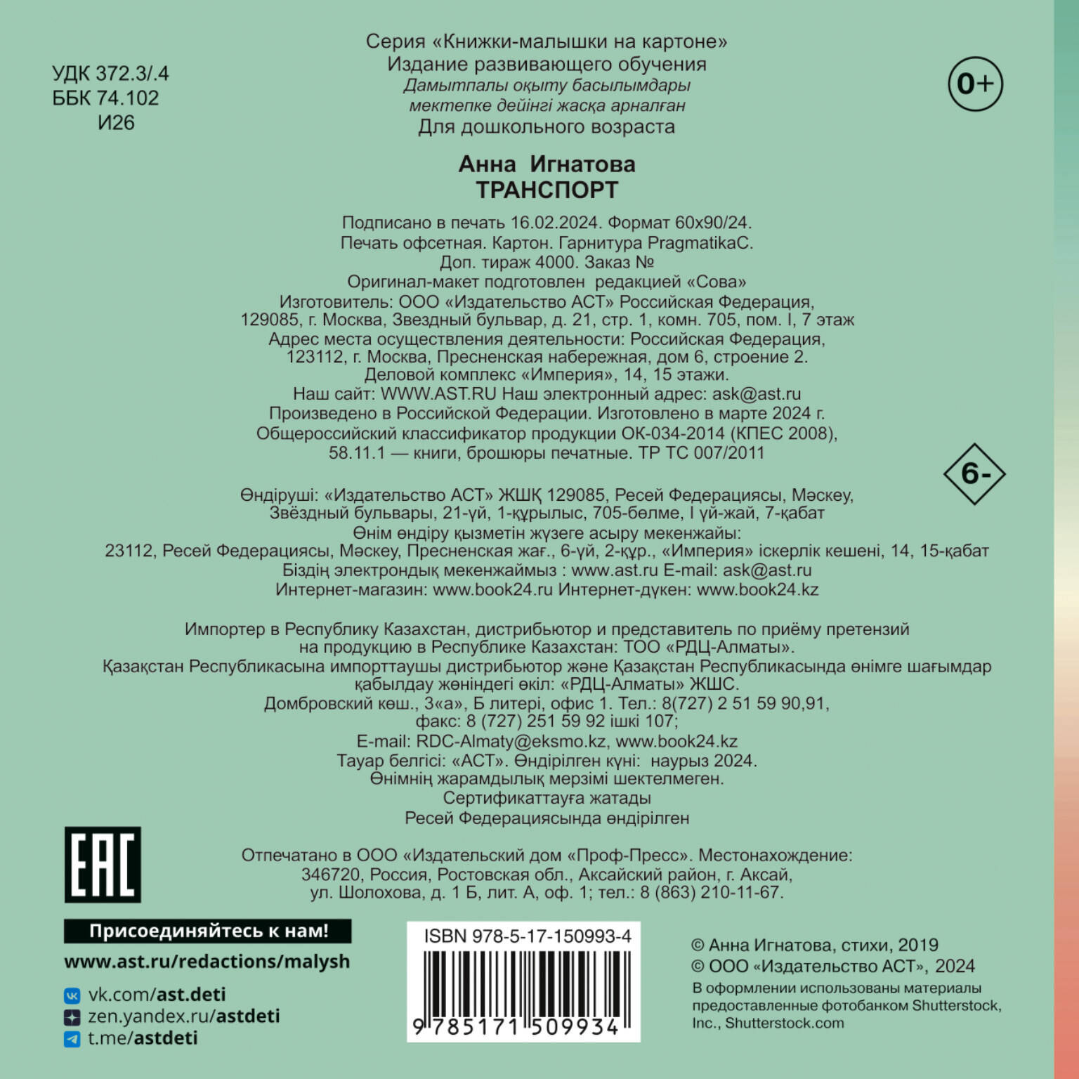 Весёлые стихи и яркие рисунки в книге «Транспорт» помогут ребёнку быстро выучить названия разных машин - от автомобиля и автобуса до самосвала и экскаватора. Книга карманного формата, поэтому её удобно брать в дорогу. Страницы имеют безопасные закруглённые края. Плотный картон сохранит книгу на долгое время.| Издательство | ИЗДАТЕЛЬСТВО "АСТ" |