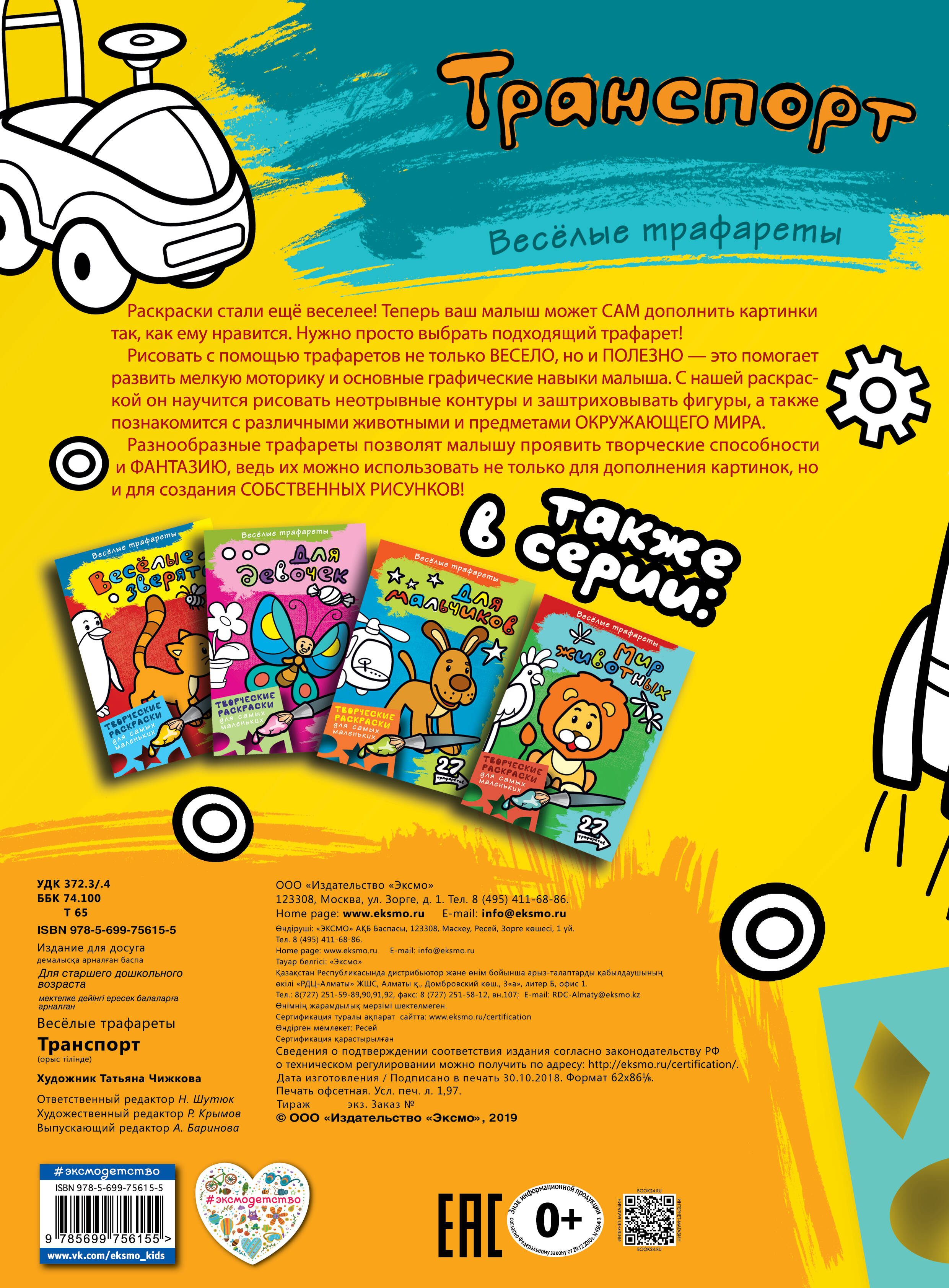 Раскраски стали еще веселее! Теперь ваш малыш может САМ дополнить картинки так, как ему нравится. Нужно просто выбрать подходящий трафарет! Рисовать с помощью трафаретов не только ВЕСЕЛО, но и ПОЛЕЗНО - это помогает развить мелкую моторику и основные графические навыки малыша. С нашей раскраской он научится рисовать неотрывные контуры и заштриховывать фигуры, а также познакомится с различными животными и предметами ОКРУЖАЮЩЕГО МИРА. Разнообразные трафареты позволят малышу проявить творческие способности и ФАНТАЗИЮ, ведь их можно использовать не только для дополнения картинок, но и для создания СОБСТВЕННЫХ РИСУНКОВ!| Издательство | ООО "Издательство "Эксмо" |