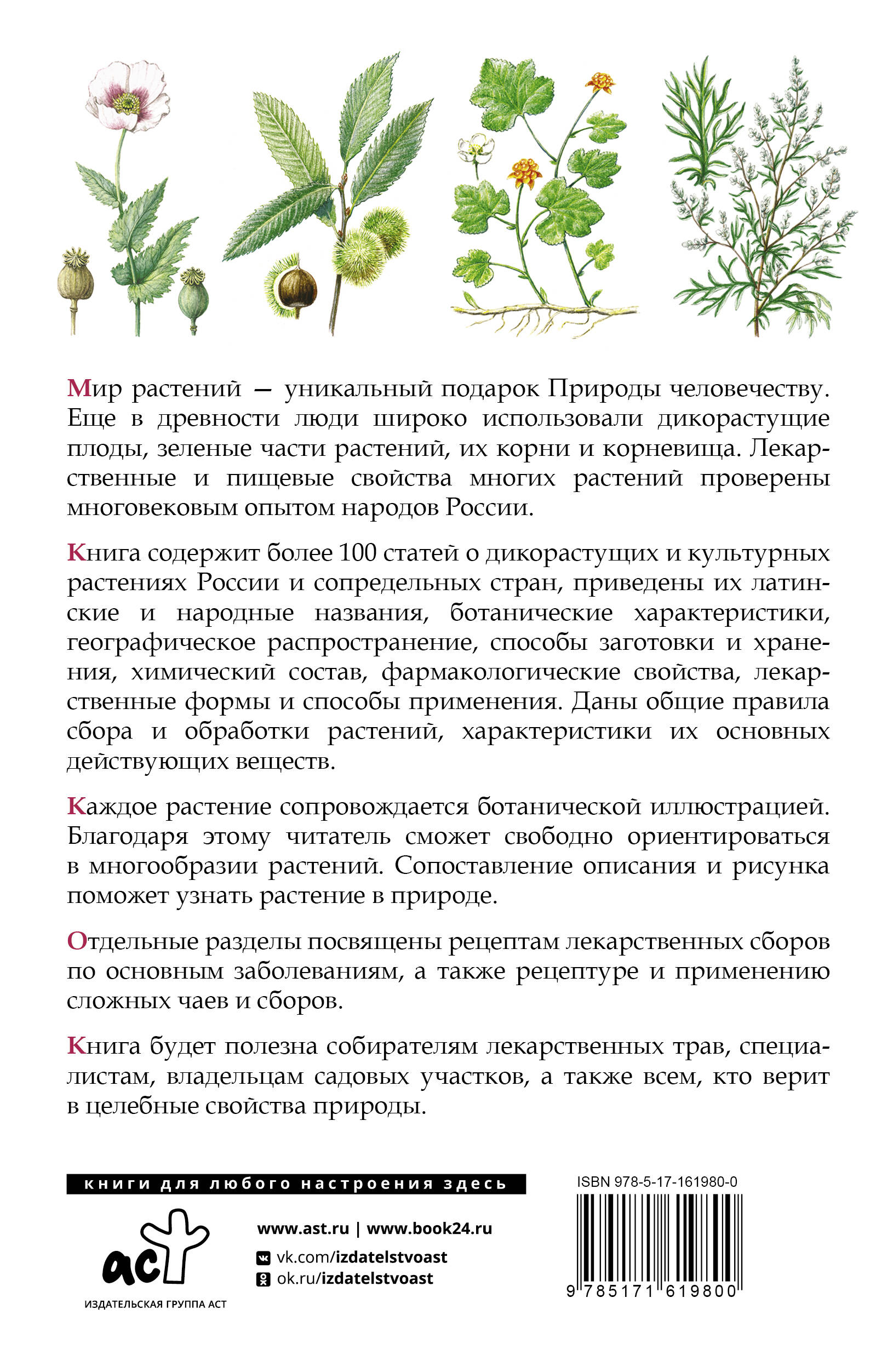 Книга содержит более 100 статей о дикорастущих и культурных растениях России и сопредельных стран, приведены их латинские и народные названия, ботанические характеристики, географическое распространение, способы заготовки и хранения, химический состав, фармакологические свойства, лекарственные формы и способы применения. Даны общие правила сбора и обработки растений, характеристики их основных действующих веществ. Каждое растение сопровождается ботанической иллюстрацией. Благодаря этому читатель сможет свободно ориентироваться в многообразии растений. Сопоставление описания и рисунка поможет узнать растение в природе. Отдельные разделы посвящены рецептам лекарственных сборов по основным заболеваниям, а также рецептуре и применению сложных чаев и сборов. Книга будет полезна собирателям лекарственных трав, специалистам, владельцам садовых участков, а также всем, кто верит в целебные свойства природы.| Издательство | Издательство "АСТ" |