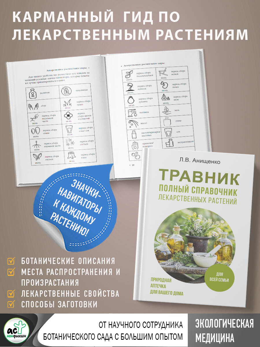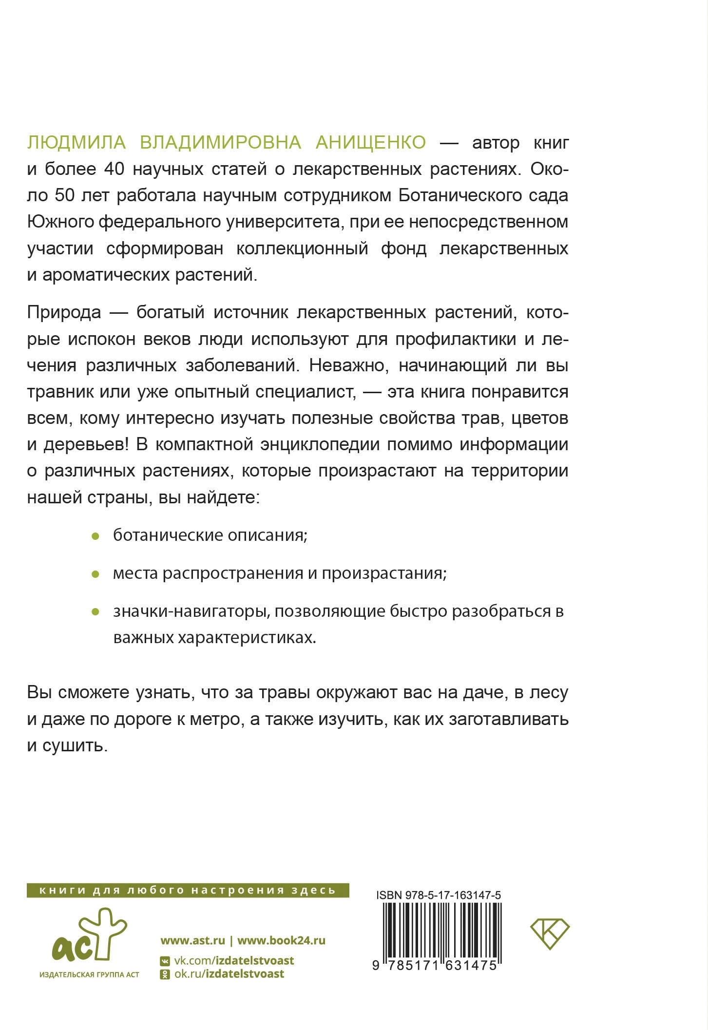 Анищенко Людмила Владимировна - автор книг и более 40 научных статей о лекарственных растениях. Около 50 лет работала научным сотрудником Ботанического сада Южного федерального университета, при её непосредственном участии сформирован коллекционный фонд лекарственных и ароматических растений. Природа - богатый источник лекарственных растений, которые испокон веков люди используют для профилактики и лечения различных заболеваний. Неважно начинающий ли вы травник или уже опытный специалист - эта книга понравится всем, кому интересно изучать полезные свойства трав, цветов и деревьев! В компактной энциклопедии помимо информации о различных растениях, которые произрастают на территории нашей страны, вы найдете: • ботанические описания; • места распространения и произрастания; • значки-навигаторы, позволяющие быстро разобраться в важных характеристиках. Вы сможете узнать, что за травы окружают вас на даче, в лесу и даже по дороге к метро, а также изучить, как их заготавливать и сушить.| Издательство | Издательство "АСТ" |