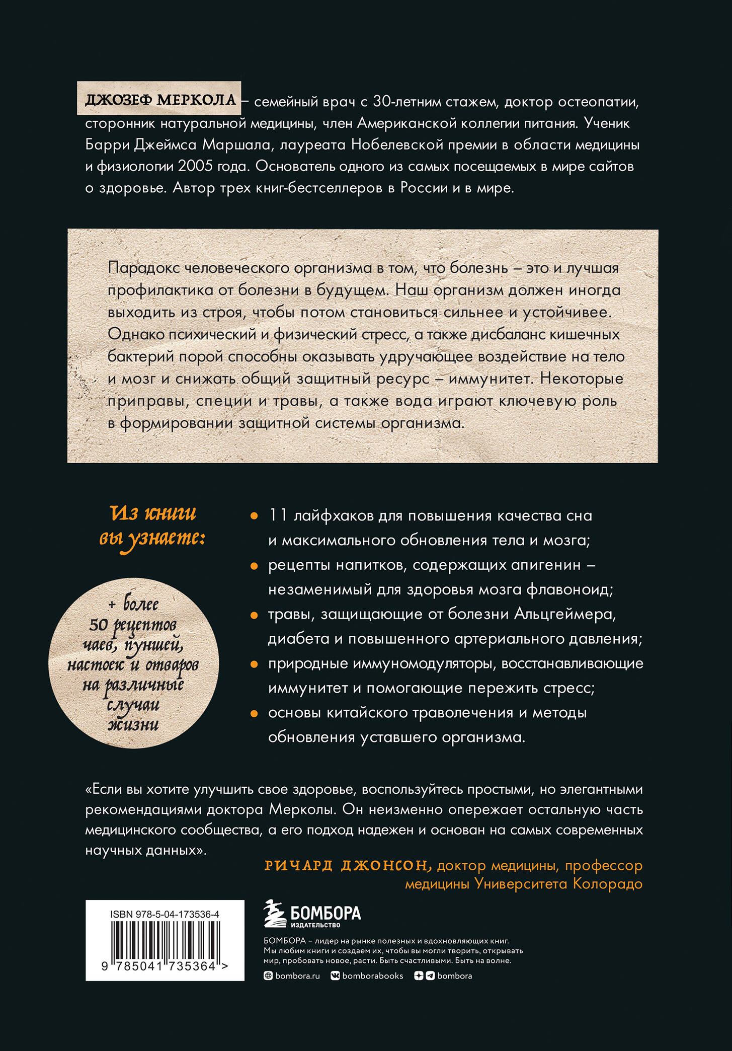 Стресс и бессонница, частые простуды и ощущение полного упадка сил, кожные «нервные» проявления, плохое настроение - все это результат плохого функционирования иммунной системы организма. Доктор Меркола, известный натуропат и семейный врач, описывает самые эффективные способы повысить свой иммунитет с помощью специй и трав. А также он рассказывает: - какую воду и в каком количестве нужно пить, а какую - избегать любой ценой; - что делать, если валишься с ног от усталости, а впереди еще целый рабочий день; - как справиться со стрессом и паникой с помощью трав; - чем заменить медицинские успокоительные препараты. А еще 11 лайфхаков для крепкого и здорового сна.| Издательство | ООО "Издательство "Эксмо" |