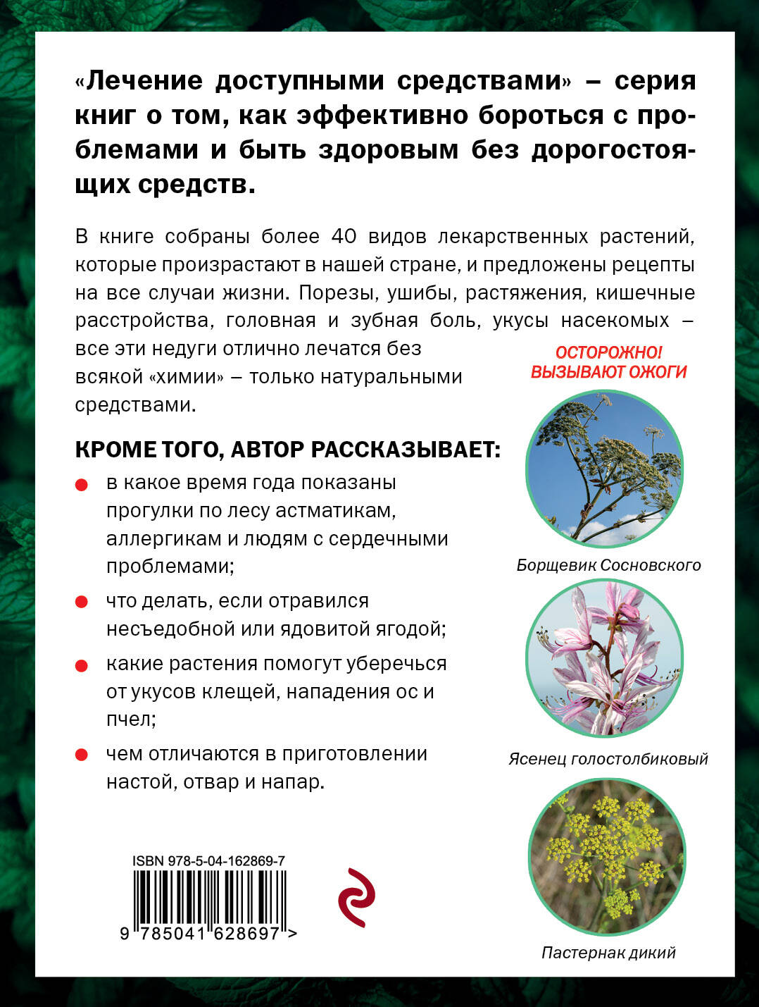 Автор рассказывает, как среди сотен растений распознать лечебные и вредные, и приводит простые в приготовлении и проверенные временем и людьми рецепты лечения травами при: - болях в суставах, приступах ревматизма и подагре; - порезах, ожогах, занозах, мозолях; - головной, ушной и зубной болях; - конъюнктивите, пигментных пятнах и сыпи. Кроме того, в книге даны изображения полезных и опасных растений, а на обложке - растений, вызывающих ожоги при соприкосновении. Для аллергиков, астматиков и сердечников есть специальные разделы, где объясняется, как, когда и почему нужно гулять или отдыхать в лесу, чтобы облегчить течение заболевания.| Издательство | Эксмо |