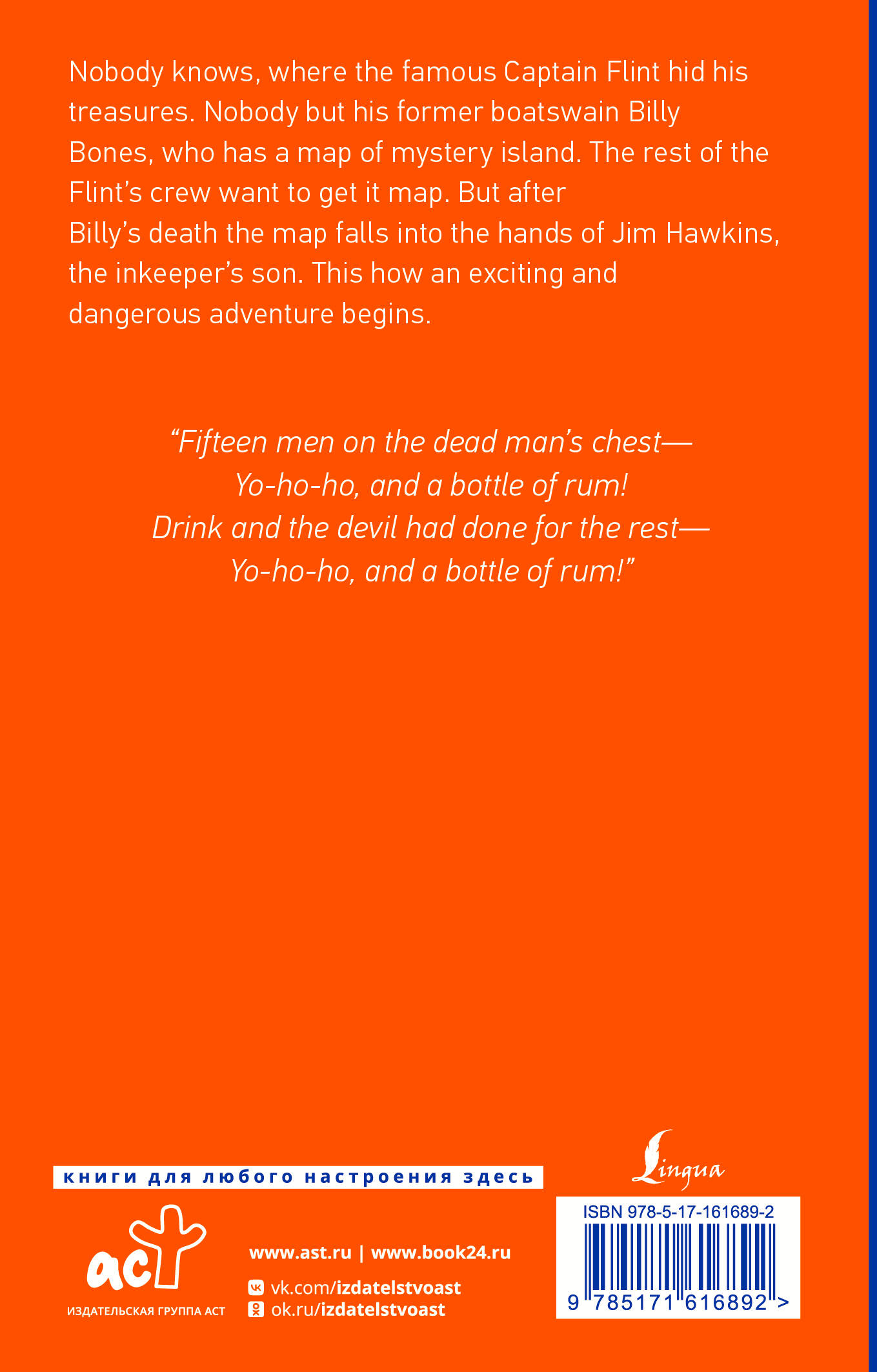 С детства мечтаете о морских приключениях и поисках пиратского клада? Почему бы не оживить эти мечты с помощью романа Роберта Льюиса Стивенсона "Остров Сокровищ"? Однажды в провинциальной гостинице "Адмирал Бенбоу", стоящей недалеко от Бристоля, появляется необычный постоялец, назвавшийся Капитаном. Он слишком много пьет и явно кого-то боится. Выясняется, что его имя Билли Бонс и он когда-то был членом команды великого Флинта. Бывшие товарищи считают его предателем и вручают черную метку, после чего Билли Бонс умирает от приступа. Сын владельцев гостиницы Джим Хокинс находит в сундуке моряка таинственную карту. Он показывает ее доктору Ливси и сквайру Трелони. Выясняется, что на карте показано, где спрятаны сокровища Флинта. Тогда они решают отправиться на поиски этого клада на судне "Испаньола" под командованием капитана Смоллетта. Героев ждут неожиданные встречи, сражения с пиратами и все опасности моря. Вы можете присоединиться к ним во время чтения, а также насладиться языком автора и деталями истории без искажений перевода.| Издательство | Издательство "АСТ" |