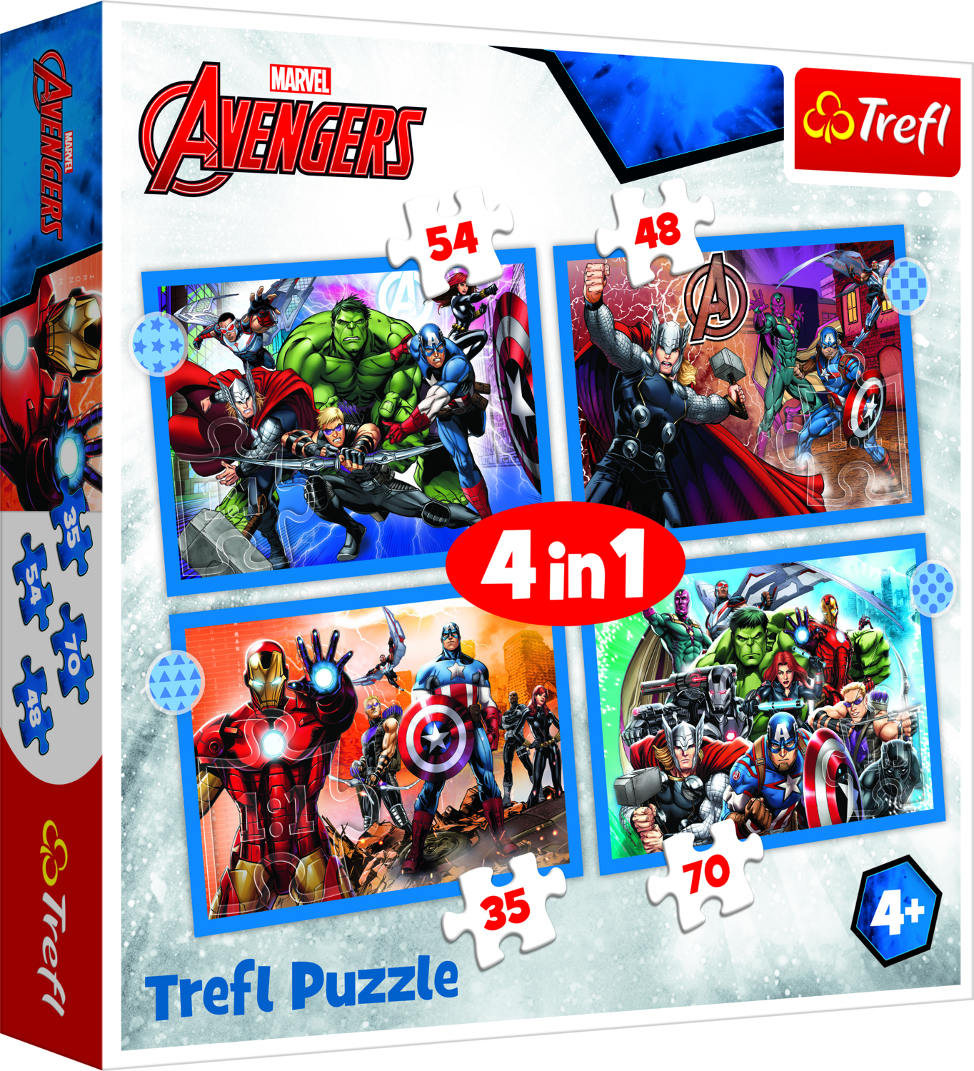 Как интерактивная занятие, головоломки - это интересный способ развить важные когнитивные навыки посредством практического обучения. Пазлы идеально подходят для собирания в одиночку или в группе. Комплект пазлов 4 в 1 Мстители. Количество элементов: 35+45+54+70. Набор из четырёх картинок - это замечательная идея для игры и совершенствования навыков складывания пазлов с разным количеством деталей. Размер готового пазла: 28,5x20,5 см.