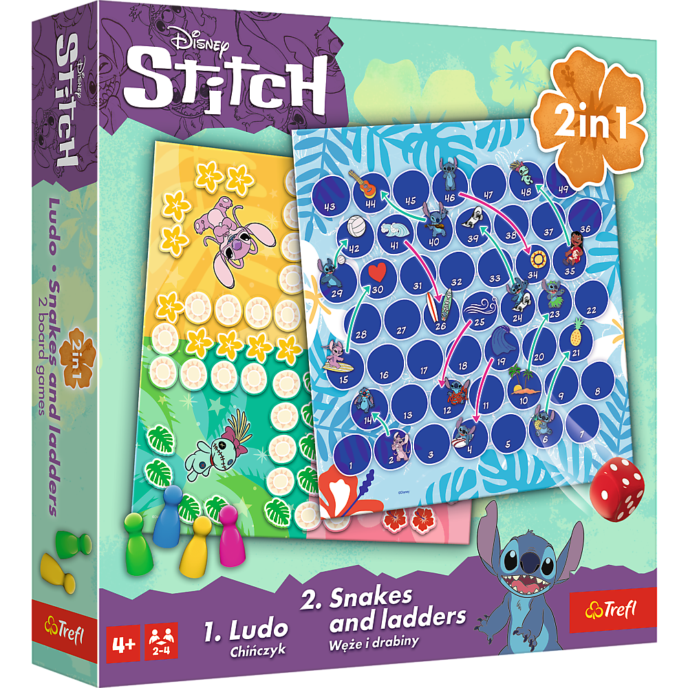 Настольная игра 2 в 1 Лило и Стич BALT FIN SWE Классические игры для всей семьи. Лудо: приведите все свои фишки в дом. Следите за противниками, с которыми вы непременно столкнетесь по пути. Кому из вас улыбнётся удача? Змеи и лестницы: примите участие в гонке, полной неожиданных поворотов. Клетки с особыми эффектами могут приблизить вас к финишу или, наоборот, отбросить назад и задержать. Кто будет самым быстрым? Для возраста: 4+. Количество игроков: 2-4. Продолжительность игры: 10-25 минут. Содержимое коробки: игровое поле, кубик, 16 фишек 4 разных цветов, правила игр.