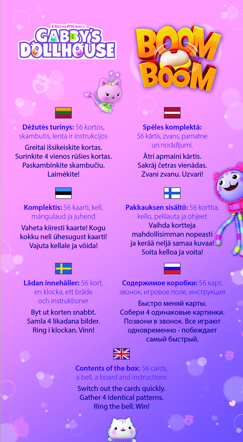 1. Быстро меняй карты. 2. Собери 4 одинаковые картинки. 3. Позвони в звонок. 4. Все играют одновременно; побеждает самый быстрый! Для возраста: 6+. Количество игроков: 2-4. Продолжительность игры: 10-25 минут. Содержимое коробки: 56 карт, звонок, игровое поле, инструкция.