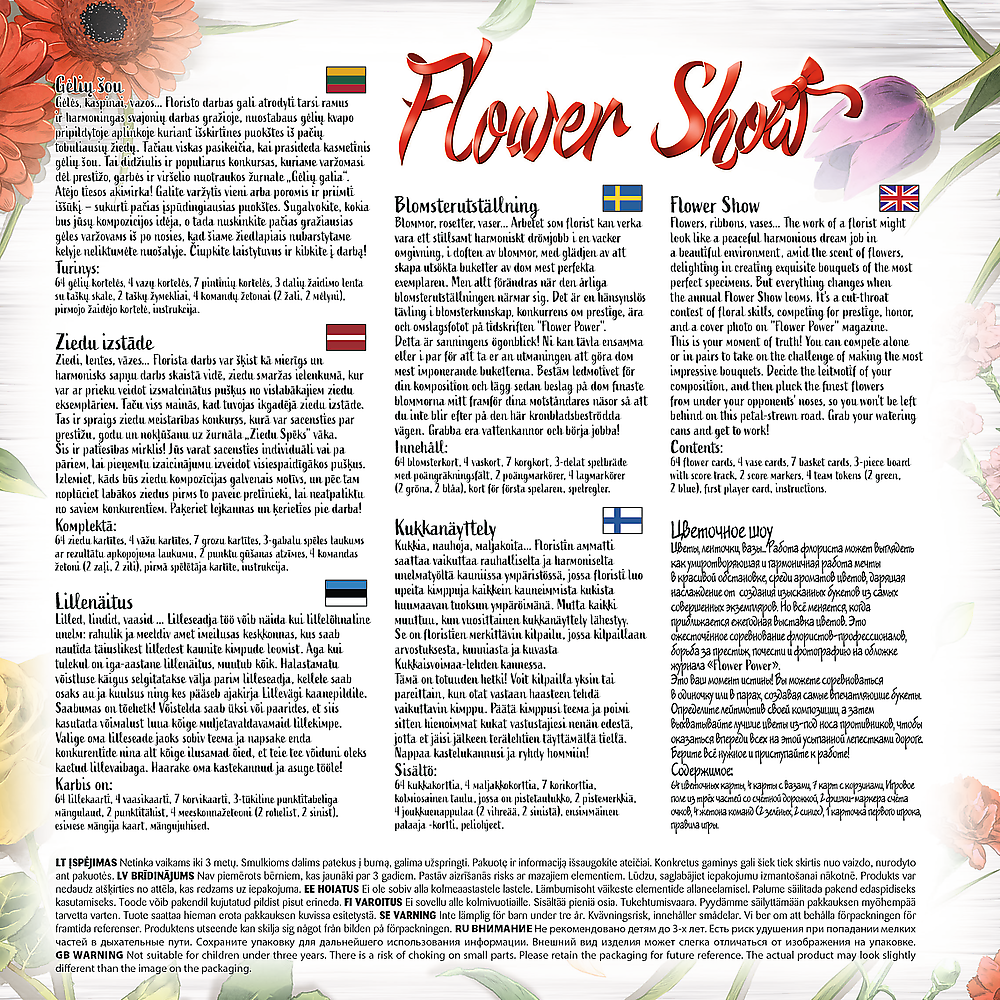 Цветы, ленточки, вазы... Работа флориста может выглядеть как умиротворяющая и гармоничная работа мечты в красивой обстановке, среди ароматов цветов, дарящая наслаждение от создания изысканных букетов из самых совершенных экземпляров. Но всё меняется, когда приближается ежегодная выставка цветов. Это ожесточённое соревнование флористов-профессионалов, борьба за престиж, почести и фотографию на обложке журнала «Flower Power». Это ваш момент истины! Вы можете соревноваться в одиночку или в парах, создавая самые впечатляющие букеты. Определите лейтмотив своей композиции, а затем выхватывайте лучшие цветы из-под носа противников, чтобы оказаться впереди всех на этой усыпанной лепестками дороге. Берите всё нужное и приступайте к работе!