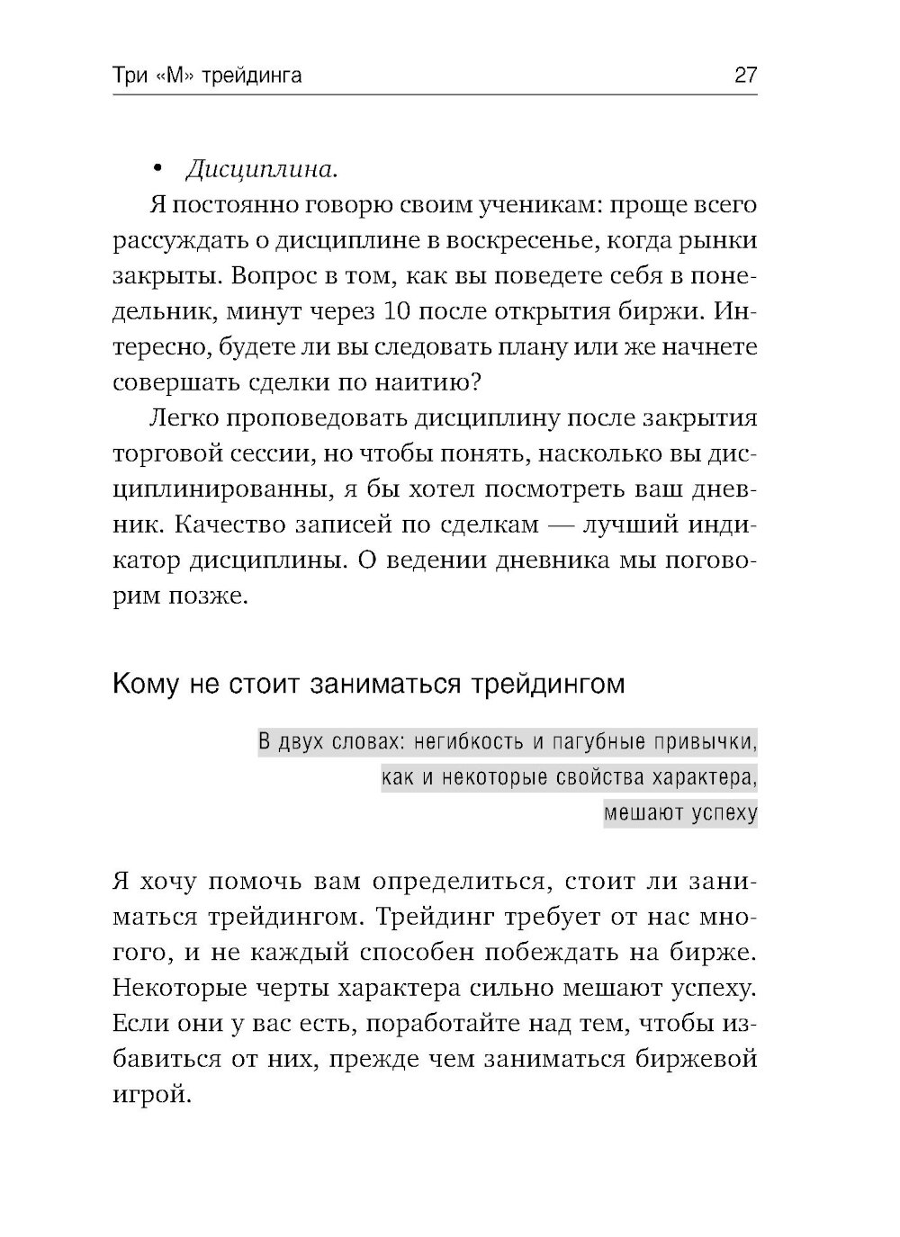 О трейдинге - одном из самых увлекательных видов деятельности. Став успешным трейдером, вы можете жить и работать в любом уголке земного шара, быть независимым от рутины и ни перед кем не отчитываться. Но глядя на внешнюю привлекательность, мало кто из новичков осознает, какой работы и дисциплины требует биржа.| Издательство | Альпина Паблишер |