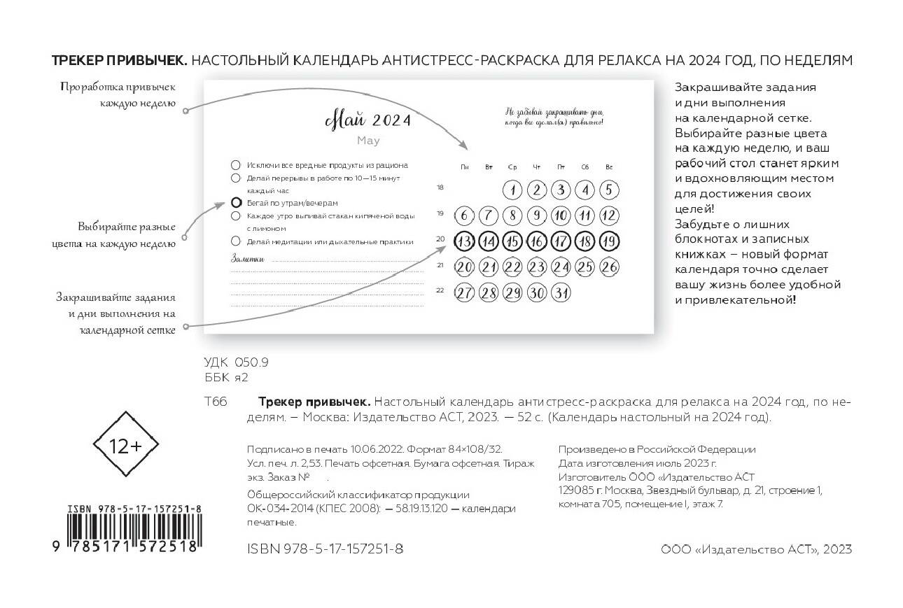 Аннотация: Трекер привычек. Настольный календарь антистресс-раскраска для релакса на 2024 год, по неделям