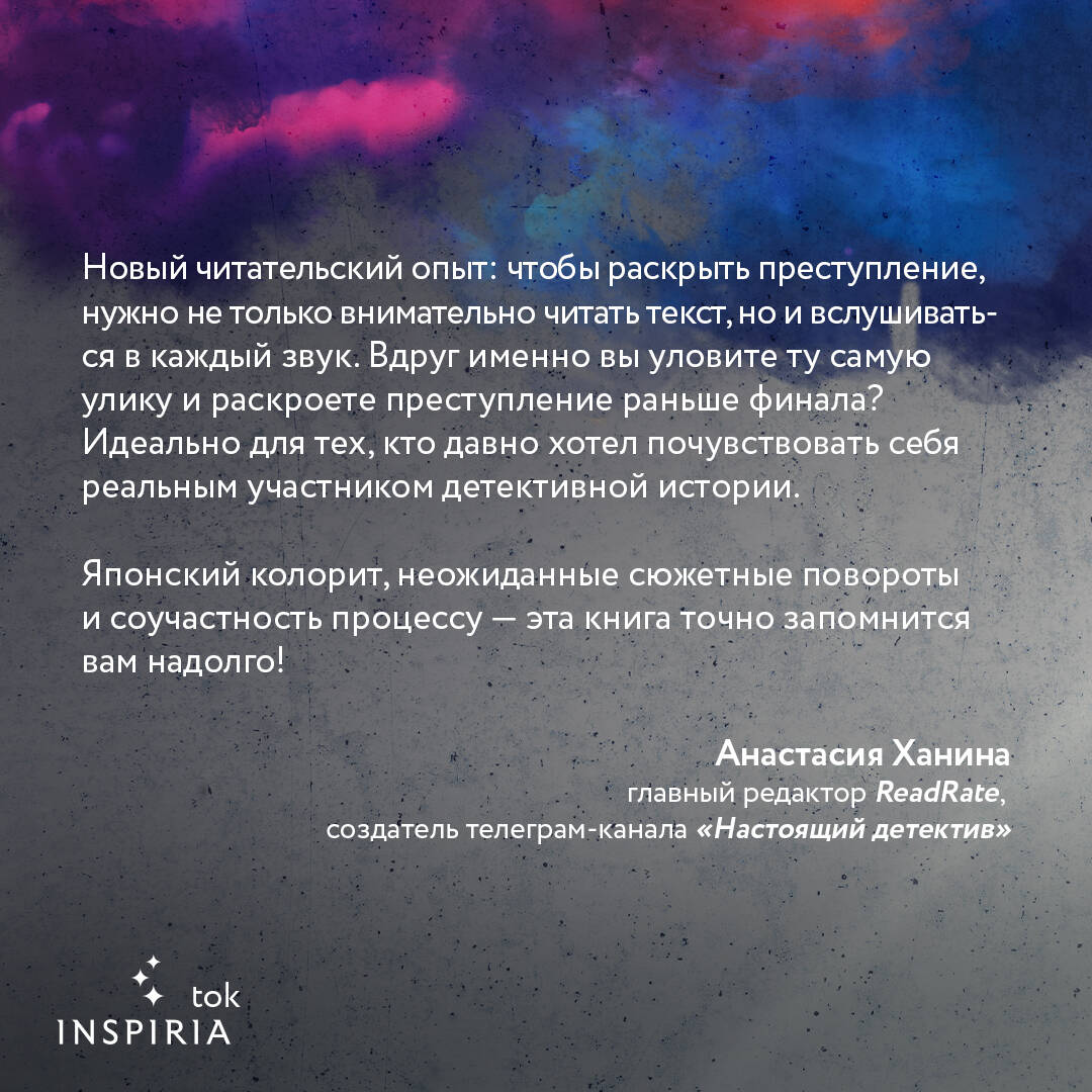 НАЦИОНАЛЬНЫЙ БЕСТСЕЛЛЕР ЯПОНИИ ОТ ОБЛАДАТЕЛЯ ГЛАВНЫХ ЛИТЕРАТУРНЫХ ПРЕМИЙ ЯПОНИИ - ОЯРУ ХАРУХИКО, ЯМАМОТО ИСИРО И НАОКИ; ЛАУРЕАТА 62 ПРЕМИЙ ЯПОНСКОЙ АССОЦИАЦИИ ДЕТЕКТИВНЫХ ПИСАТЕЛЕЙ; ОБЛАДАТЕЛЯ ГЛАВНОГО ПРИЗА «ТАЙНА ХОНКАКУ» Уникальные детективные загадки, ключи к которым спрятаны и в тексте, и в звуках. Наведите телефон на QR-код в книге и прослушайте аудиозапись, чтобы раскрыть преступление. Молодая певица Юкино найдена мертвой по дороге домой. Ее менеджер Ëсими, у которой жила девушка, раз за разом переслушивает запись дебютного сингла певицы. И ей начинает казаться, что она слышит голос Юкино, говорящей о том, кто виновен в ее смерти. Тем временем к Ëсими приезжает отец девушки, чтобы забрать ее вещи… Судзуки потерял свой капитал на фондовой бирже. Однажды он приходит на семинар для тех, кто хочет разбогатеть, и узнает в лекторе человека, совершившего нераскрытое преступление, о котором известно Судзуки. Что же он предпримет? Школьник вынужден переехать из Токио в провинцию к своим бабушке и дедушке. Здесь у него появляется закадычный друг по прозвищу Сверчок. Но их дружбе не суждено продлиться долго… Преподаватель химии и биологии увлечен своей студенткой. Подобно сталкеру, он начинает следить за ней. И вскоре понимает, что в ее жизни не всё благополучно... Жена сына известного художника Такидзава Сёити Рэна нашла мужа мертвым и выбросилась из окна собственной квартиры. Но так ли все было на самом деле? Подслушай убийство… _________________________________________________________ СЮСУКЭ МИТИО родился в префектуре Хёго. Один из самых популярных японских писателей детективов нового поколения. Дебютировал в 2004 году и с тех пор получил множество престижных книжных премий. Лауреат 62 премии Японской ассоциации детективных писателей, обладатель главного приза «Тайна Хонкаку» (яп. Honkaku Misuteri) , премии Ояру Харухико, премии Ямамото Исиро и премии Наоки. Интересные факты: Автор сам записывал звуки для аудиофайлов и однажды ночью отправился на стадион, чтобы записать звук бега по гравию. Также он является автором текста и музыки песни, а с певицей, которая ее исполняет, познакомился на улице. В конце романа есть приложение, где содержатся расшифровки всех аудиовставок книги. Пригодится, если у вас нет возможности их прослушать. По уникальным QR-кодам из приложения откроются ссылки на оригинальные аудиозаписи, чтобы вы могли послушать их на японском языке.