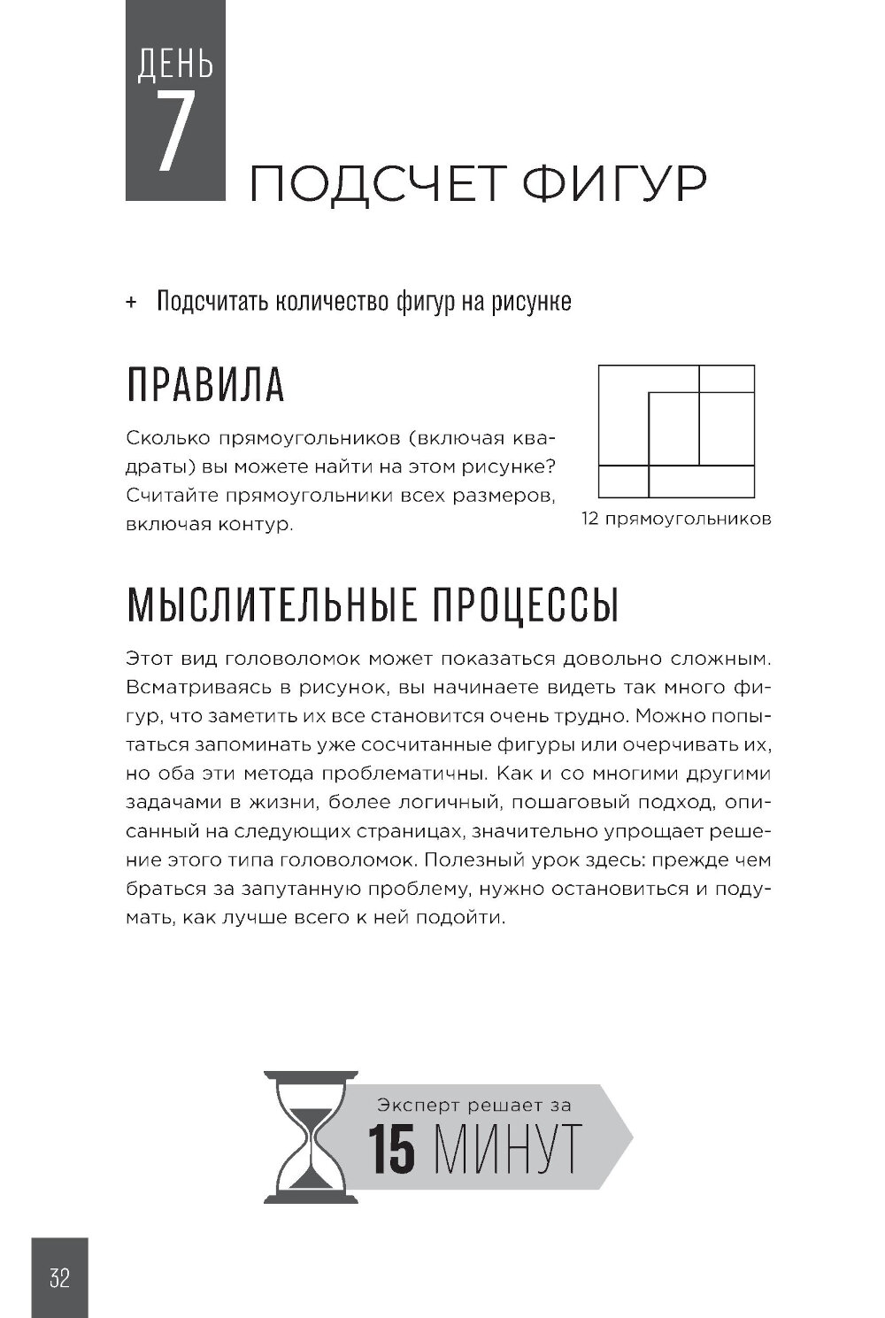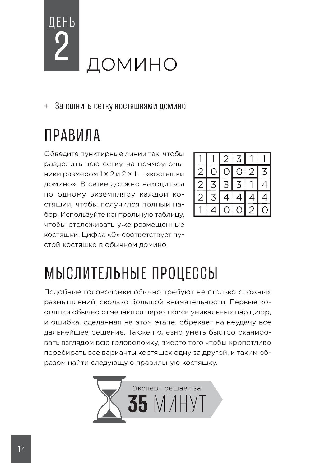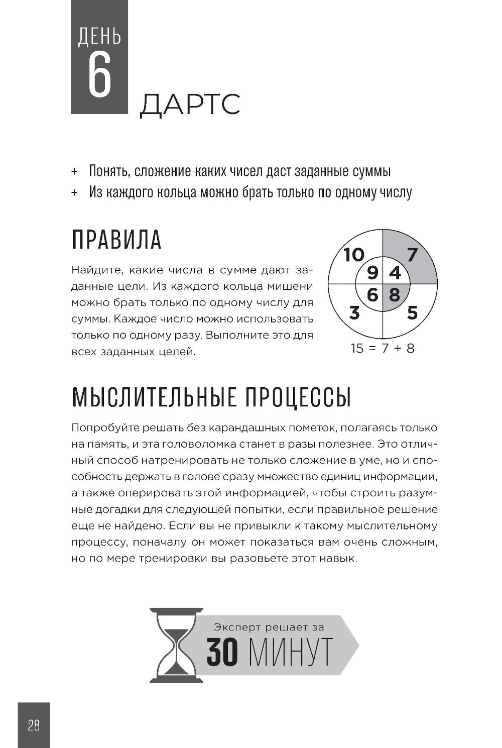 Это сборник упражнений для интенсивной тренировки мозга, рассчитанный на 40 дней. С помощью этих увлекательных головоломок вы сможете развить гибкость мышления, логику и сообразительность. Разные варианты судоку, хитори, «сапера», лабиринты всех видов и другие упражнения тренируют мозг, повышая эффективность его работы, а также позволяют расслабиться и отвлечься. Гарет Мур подробно описывает алгоритм решения каждой задачи, дает подсказки и советы, а также указывает приблизительное время, которое в среднем занимает одна тренировка.| Издательство | Альпина Паблишер |