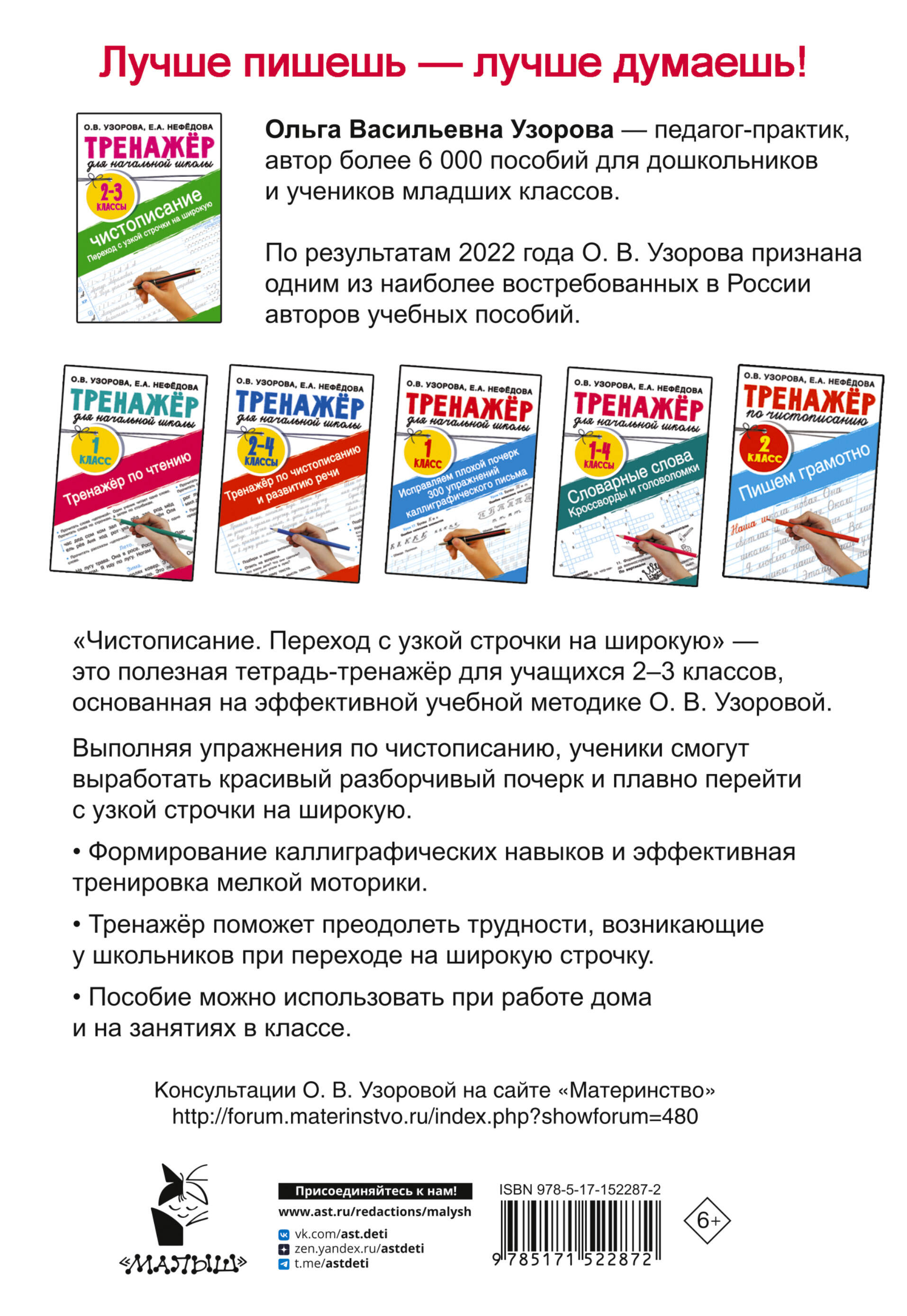 "Тренажёр по чистописанию. Переход с узкой строчки на широкую. 2-3 классы" - это прописи для учеников 2-3 классов, основанные на авторской методике О. В. Узоровой. Упражнения по чистописанию помогут ребятам сформировать красивый и разборчивый почерк, отработать и довести до автоматизма навык написания букв, справиться с трудностями, возникающими в процессе перехода на широкую строчку.