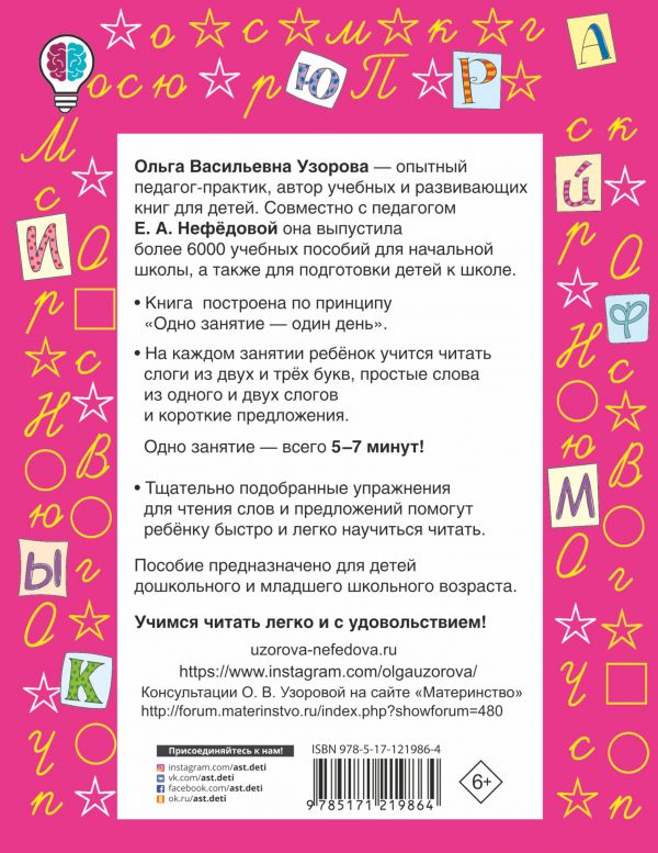Пособие «Тренажёр по чтению. Начальный уровень» известных педагогов-практиков О.В. Узоровой и Е.А. Нефёдовой поможет ребёнку автоматизировать навык слогового чтения. Выполняя задания, ребёнок научится читать открытые и закрытые слоги из одной, двух, трёх букв, слова и предложения, постепенно увеличивая скорость чтения, сможет развить речевые навыки.