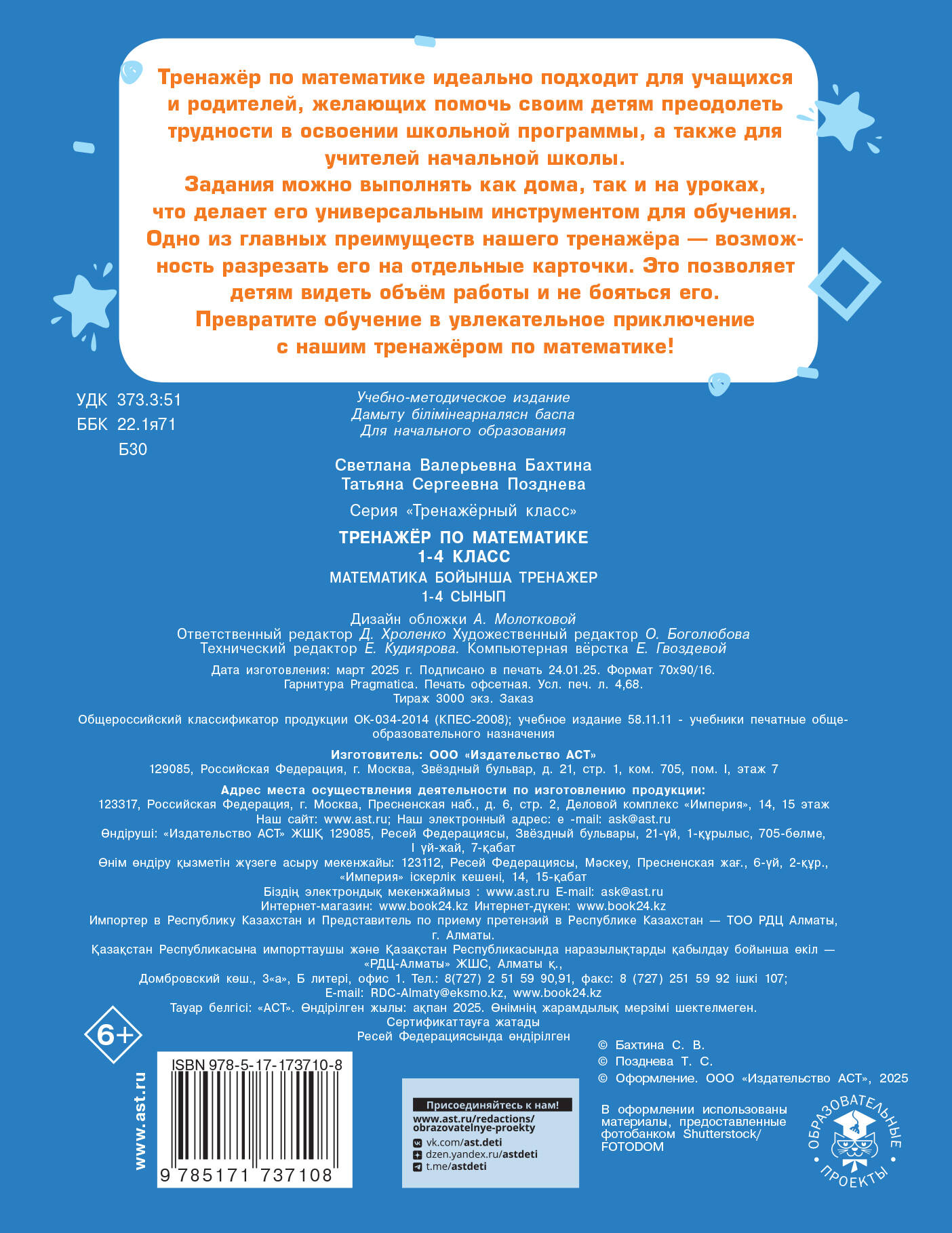 Тренажёр по математике идеально подходит для учащихся и родителей, желающих помочь своим детям преодолеть трудности в освоении школьной программы, а также учителей начальной школы. Задания можно выполнять как дома, так и на уроках, что делает его универсальным инструментом для обучения. Одно из главных преимуществ нашего тренажёра - возможность разрезать его на отдельные карточки. Это позволяет детям видеть объём работы и не бояться его. Превратите обучение в увлекательное приключение с нашим тренажёром математике!| Издательство | Издательство "АСТ" |