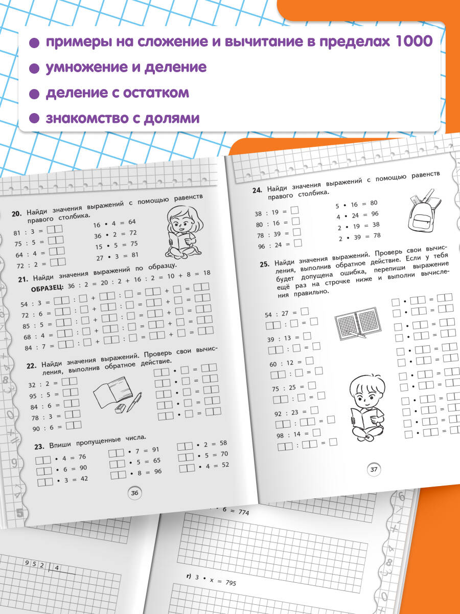 Пособие от издательства «Эксмо», соответствующее ФГОС, разработано специалистом с многолетним опытом работы и станет отличным помощником для учеников 3 класса в отработке умений и навыков, полученных на уроках математики. Решение большого количества примеров и задач на сложение и вычитание в пределах 1000, умножение и деление, деление с остатком, знакомство с долями даст возможность школьникам в дальнейшем избежать вычислительных ошибок и довести навыки счёта до автоматизма. Занимаясь по книге, учащиеся научатся анализировать информацию и понимать учебную задачу, а также смогут закрепить пройденный материал, восполнить пробелы в знаниях, развить математические способности, повысить успеваемость по предмету. Задания в тренажере построены таким образом, чтобы не повторять, а дополнять упражнения, которые предлагаются в школе. Благодаря этому его можно использовать в сочетании с любыми из существующих учебников по математике. Кроме того, в серию входят и пособия по русскому языку для 1, 2, 3 и 4 класса. Только постоянная практика позволит школьнику уверенно чувствовать себя на уроках и получать отличные оценки.| Издательство | ООО "Издательство "Эксмо" |