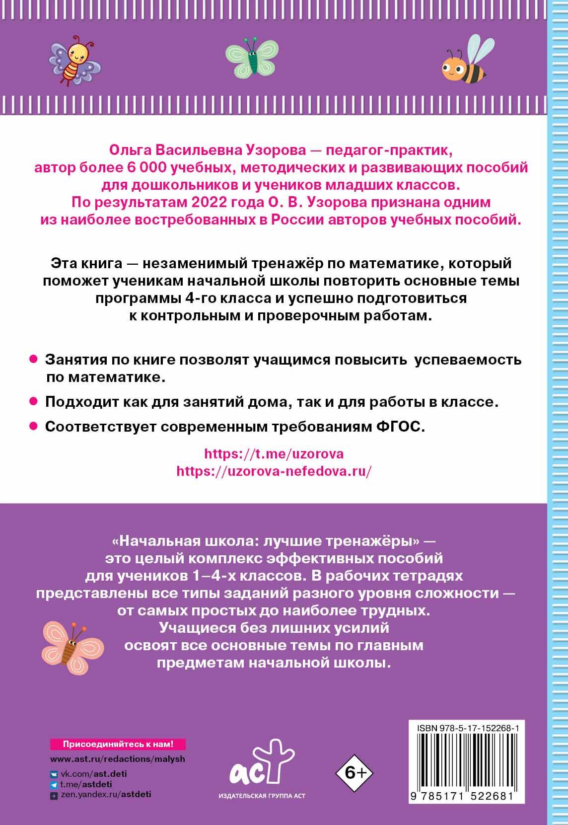 «Тренажёр по математике. 4-й класс» - это эффективный комплекс упражнений по математике, основанный на авторской методике О. В. Узоровой. Выполняя задания, школьники повторят наиболее сложные темы программы 4-го класса и научатся на практике применять знания, полученные в процессе обучения.| Издательство | ИЗДАТЕЛЬСТВО "АСТ" |