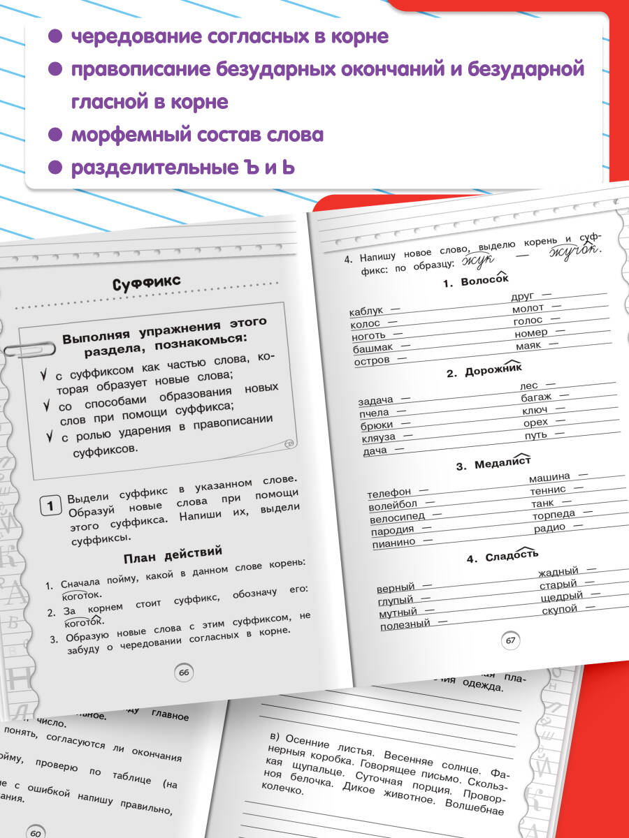 Пособие по русскому языку от издательства «Эксмо» подготовлено в соответствии с требованиями ФГОС для начальной школы и может быть использовано с любым из действующих учебников для 2 класса. Удобный тренажер с интересным современным макетом поможет ребенку улучшить грамотность, восполнить пробелы, углубить и систематизировать знания. Занимаясь, школьник не только повторит правописание безударной гласной в корне, безударных окончаний существительных и прилагательных женского и среднего рода, правила чередования согласных в корне, закрепит знания о разделительном Ъ и Ь, потренируется выделять приставку, корень и суффикс в слове, но и научится работать по плану, то есть выполнять определенный алгоритм действий, который поможет ему осознанно применять правила. Когда навык грамотного письма будет доведен до автоматизма, результат в виде твердых знаний и отличных оценок не заставит себя ждать.| Издательство | ООО "Издательство "Эксмо" |