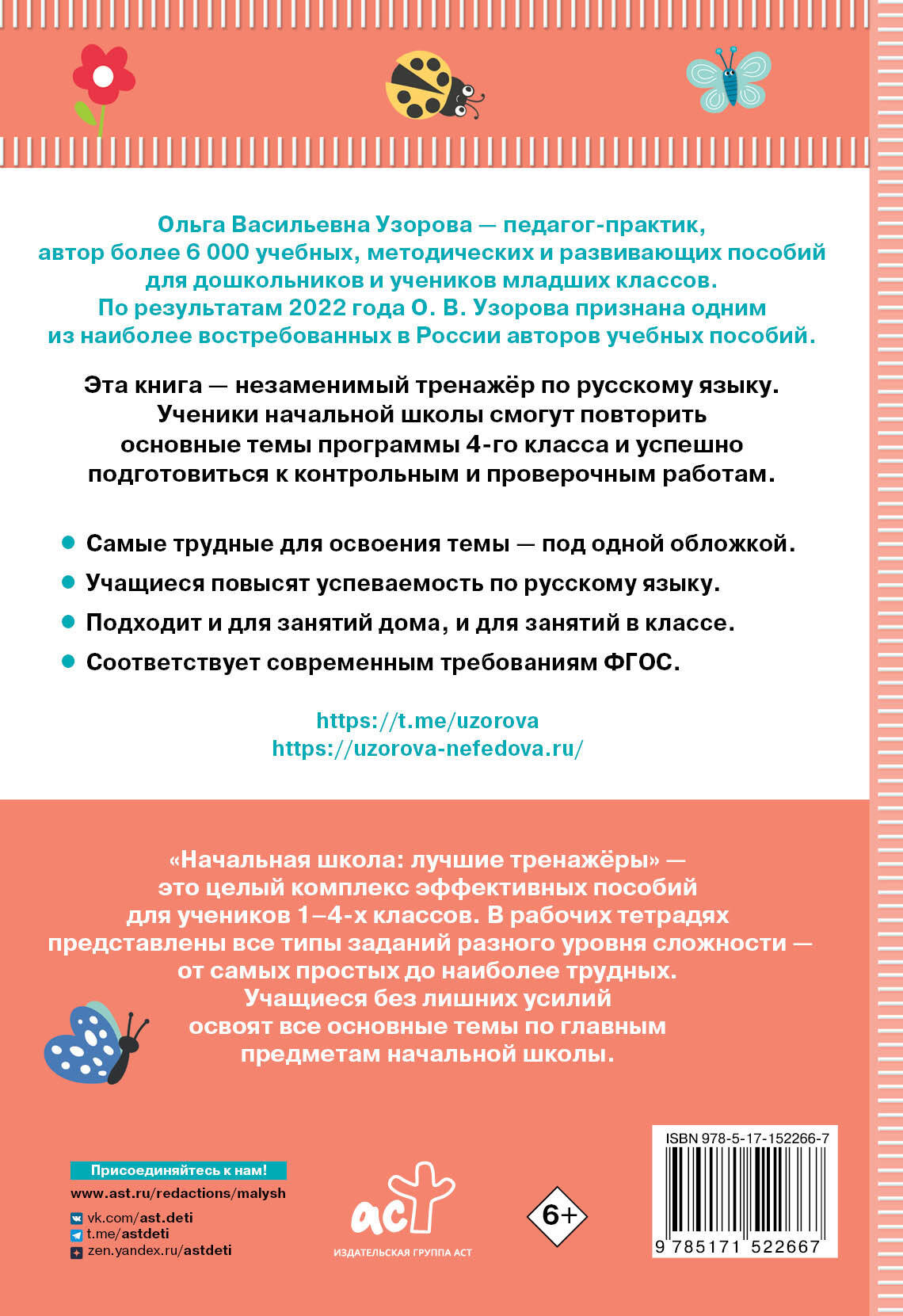Как успешно подготовить ребёнка к диктантам, контрольным и проверочным работам по русскому языку? Важно не просто заучить правила наизусть, но и понимать, почему они так работают, ежедневно тренировать грамотность, мышление и память. В этом ребёнку поможет «Тренажёр по русскому языку. 4 класс». Юный ученик приобретёт новые знания, повторит и систематизирует изученный материал. В пособии представлены блоки заданий на списывание, фонетику, пунктуацию и орфографию. Авторы тренажёра: О. В. Узорова и Е. А. Нефёдова - известные педагоги-практики. Их упражнения ежедневно помогают многим детям повысить успеваемость в школе, применять и понимать правила, улучшать внимание и грамотность.| Издательство | ИЗДАТЕЛЬСТВО "АСТ" |
