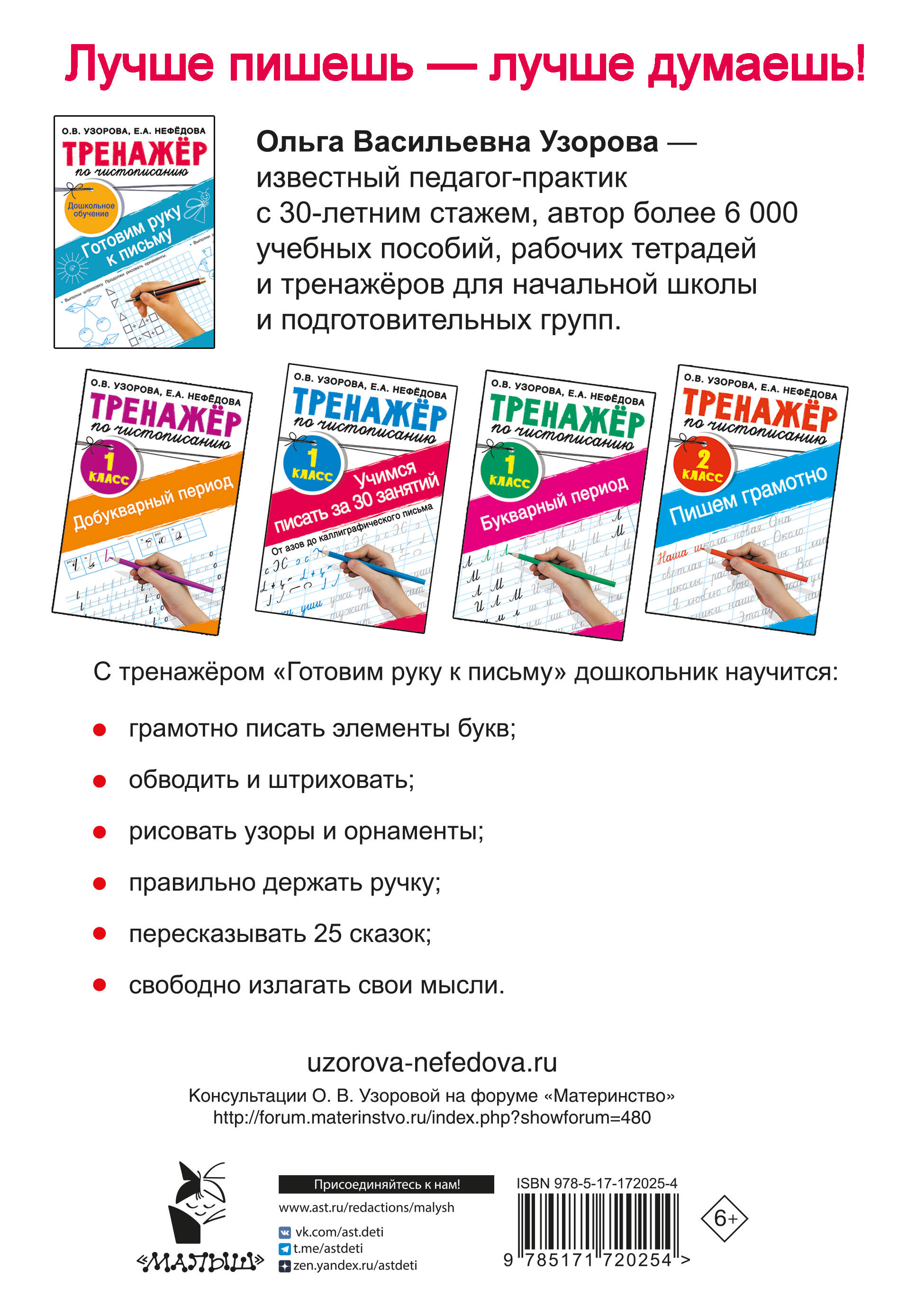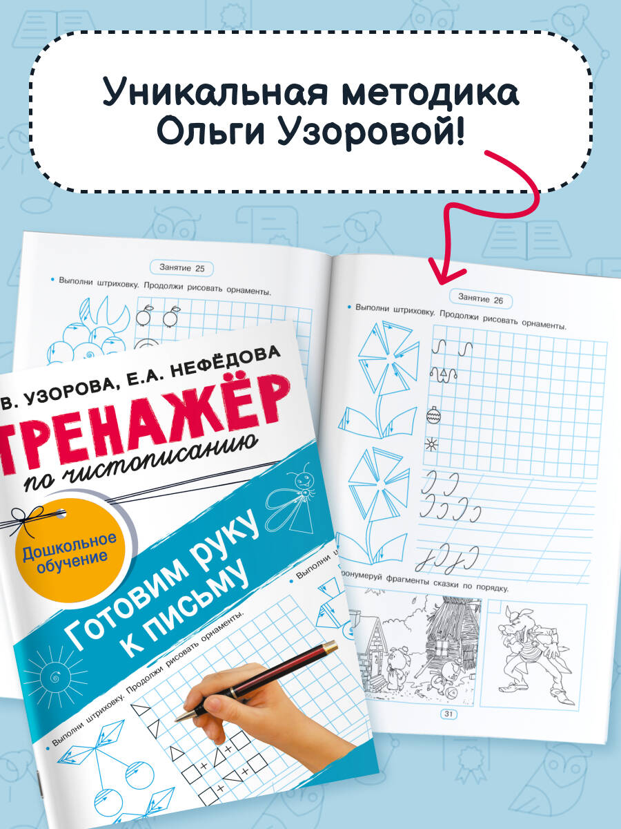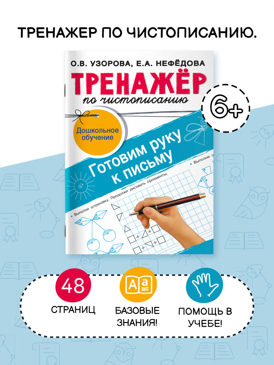 Рабочая тетрадь «Тренажёр по чистописанию. Готовим руку к письму» основана на авторской методике известного педагога-практика О. В. Узоровой. На страницах тетради - прописи, штриховки и другие интересные и полезные задания, которые помогут дошкольнику сформировать ровный разборчивый почерк, научиться ориентироваться на листе бумаги, развить речь, подготовиться к школе.| Издательство | Издательство "АСТ" |