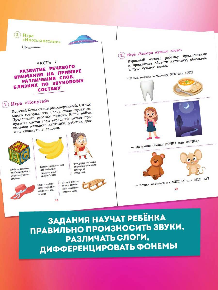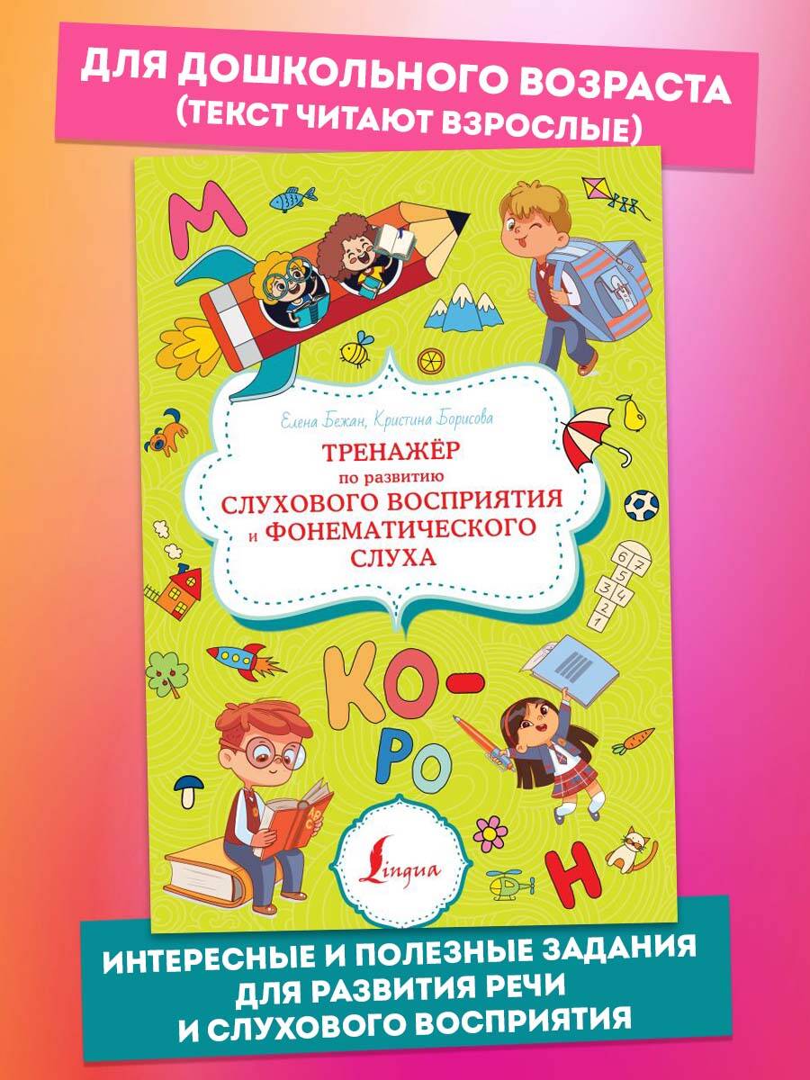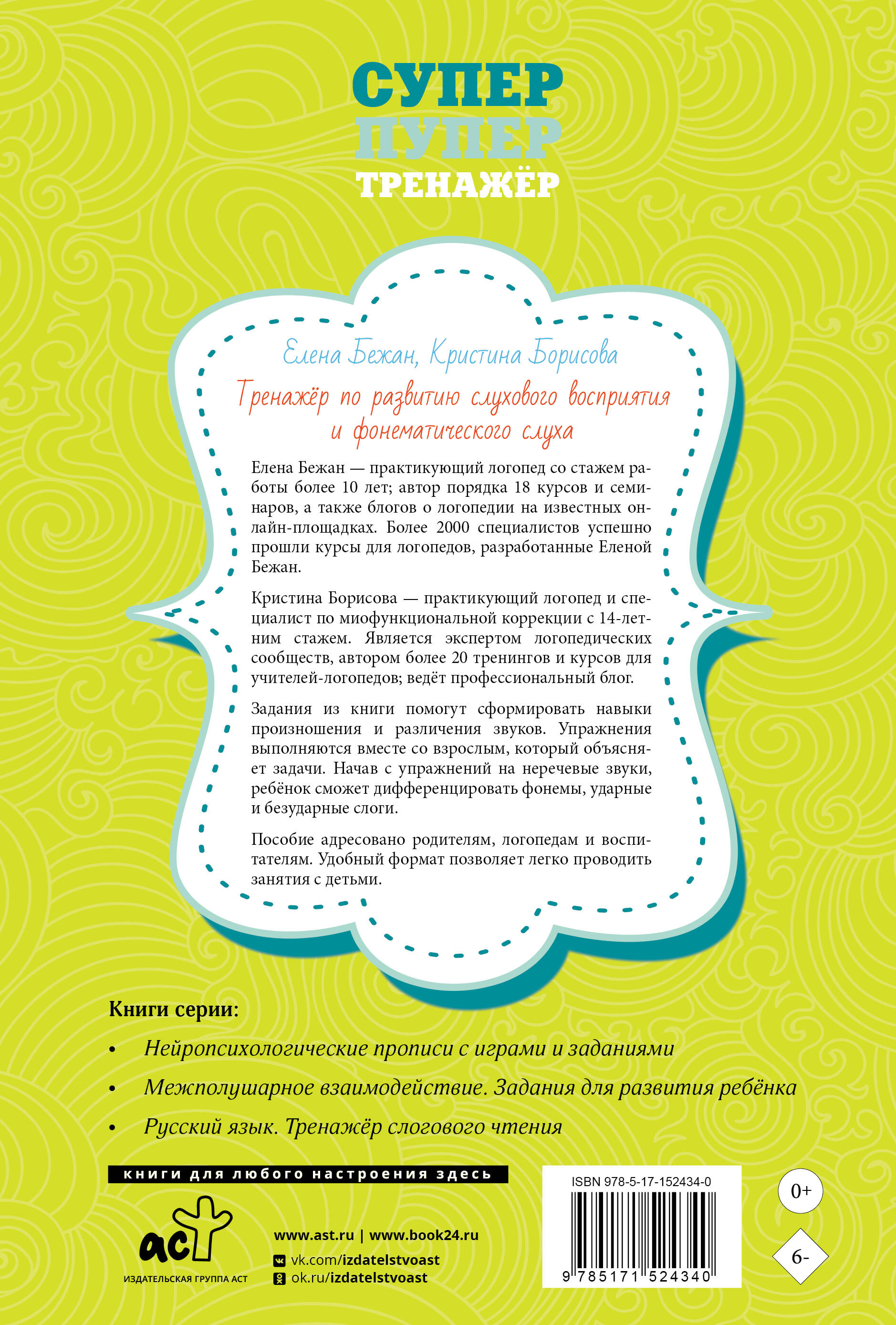 Елена Бежан - практикующий логопед со стажем работы более 10 лет; автор порядка 18 курсов и семинаров, а также блогов о логопедии на известных онлайн-площадках. Кристина Борисова - практикующий логопед и специалист по миофункциональной коррекции с 14-летним стажем. Данный тренажёр предназначен для развития слухового восприятия и фонематического слуха, которые, в свою очередь, необходимы для понимания речи. Задания из книги помогут сформировать навыки произношения и различения звуков, что впоследствии пригодится ребёнку в школе при обучении чтению и письму. Упражнения выполняются вместе со взрослым, который объясняет задачи. Структура пособия позволяет идти от простого к сложному. Пособие адресовано родителям, логопедам и воспитателям. Удобный формат с приложениями позволяет легко проводить занятия с детьми.| Издательство | ИЗДАТЕЛЬСТВО "АСТ" |