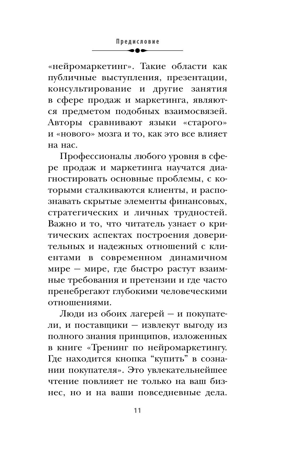Патрик Ренвуазе и Кристоф Морен считаются основоположниками законов нейромаркетинга. Менее чем за два года они стали топовыми экспертами и главными ораторами на ведущих профильных площадках. Чтобы продажи росли, нужно своим УТП попасть… нет, не в самое сердце клиента, а в голову. Нужно влюбить в свой продукт миллиарды нейронов. Как - узнайте из этой книги. Перед вами - базовый навигатор по человеческому мозгу и подробная инструкция по его использованию в продажах и эффективных маркетинговых стратегиях. Авторы разобрались: • какие нейроны в нашей голове отвечают за покупки; • чем руководствуется покупатель, когда выбирает из десятков тысяч коммерческих предложений одно-единственное; • как опережать ожидания клиента, учитывая нейрофизиологию. На основе проведенных исследований они разработали универсальные и простые техники, с помощью которых вы будете продавать всегда.| Издательство | Эксмо |
